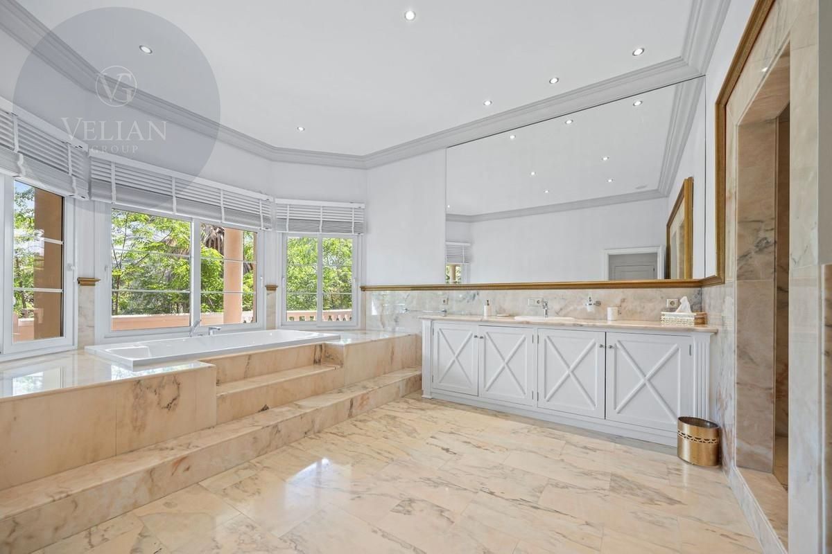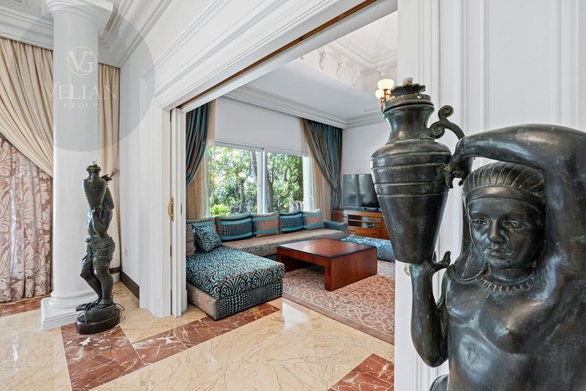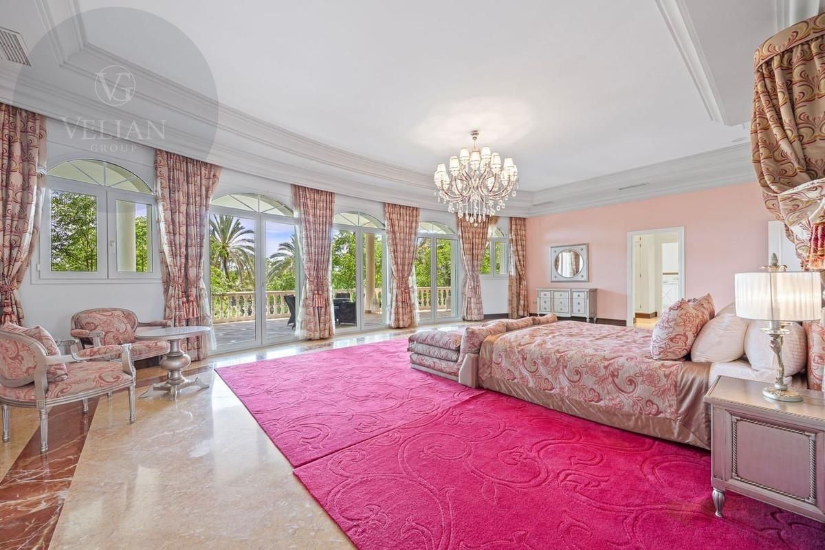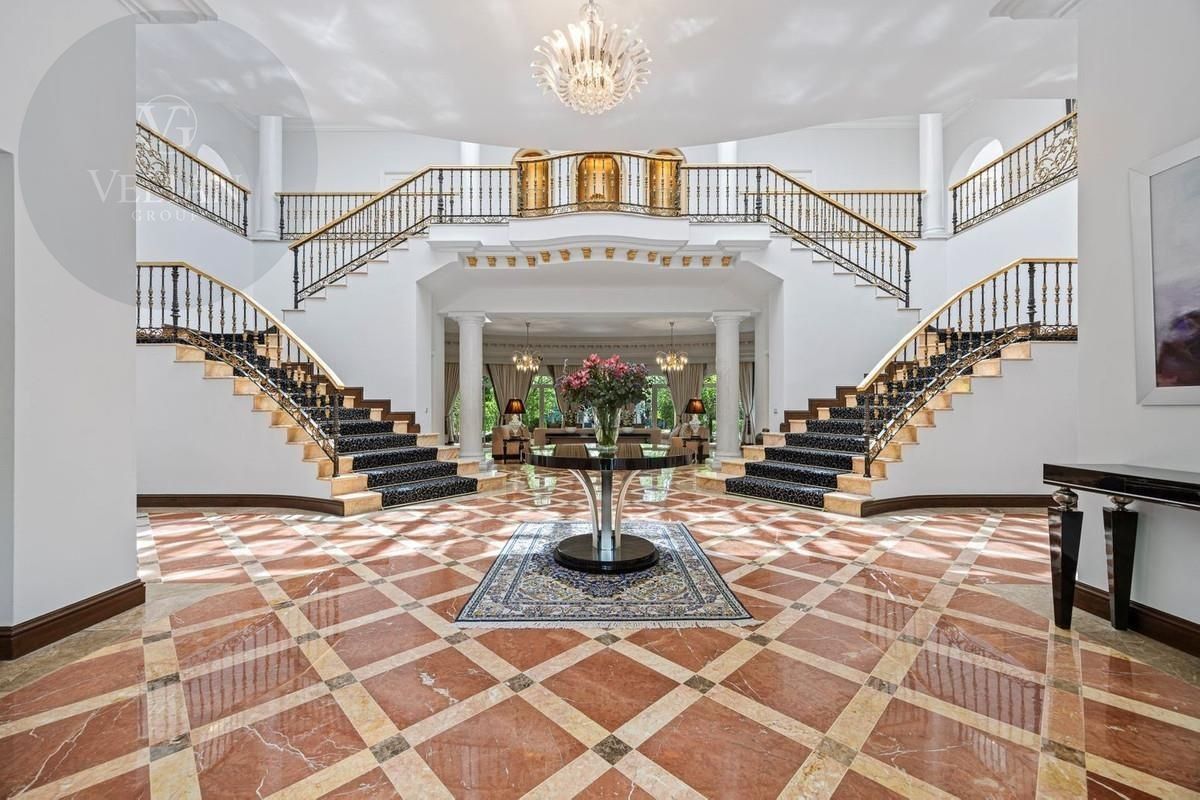 El vestíbulo principal, con su doble escalera simétrica y suelos de mármol en damero, marca el corazón de la propiedad. En la planta superior se encuentra la suite principal, una estancia de más de 200 m², con dos baños en mármol natural, dos vestidores independientes y acceso a una terraza privada. A ambos lados, cuatro dormitorios adicionales con baños en suite y terrazas garantizan comodidad y privacidad.