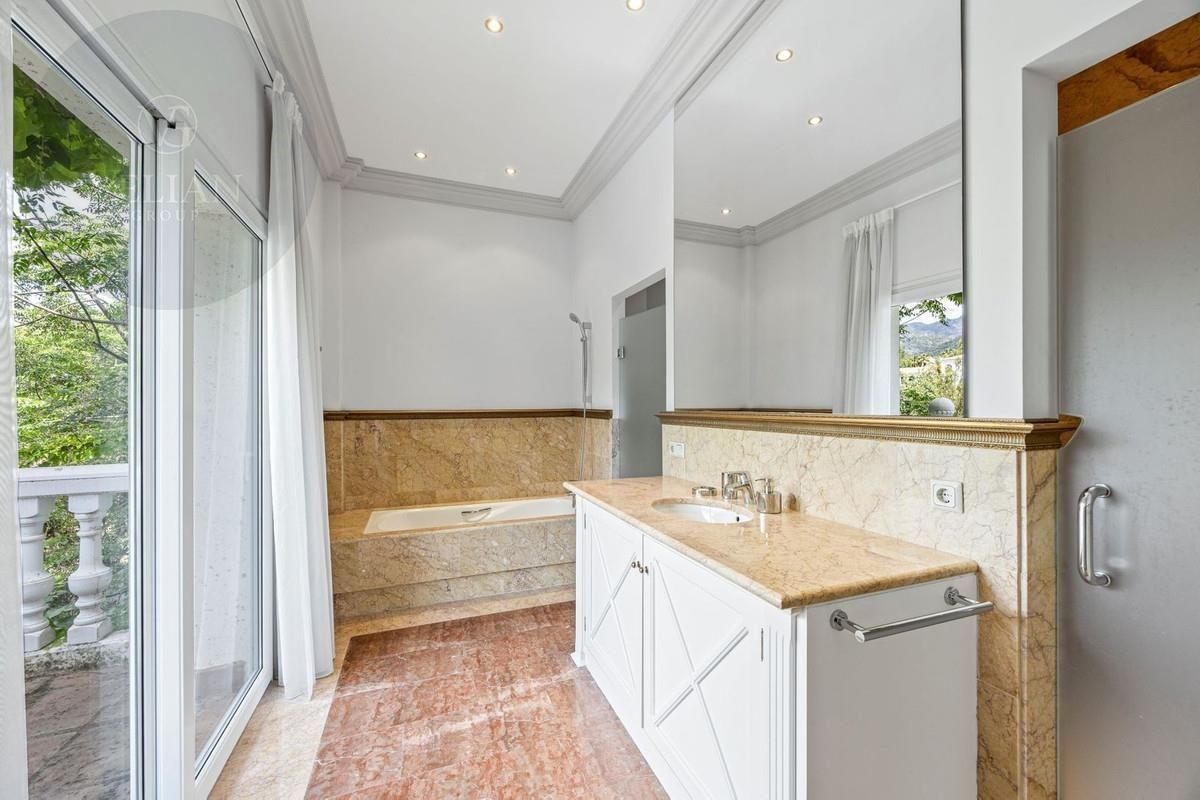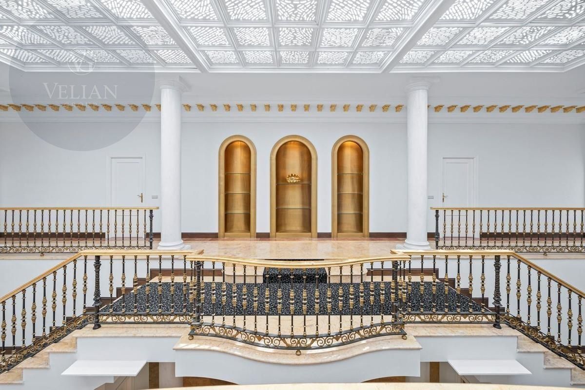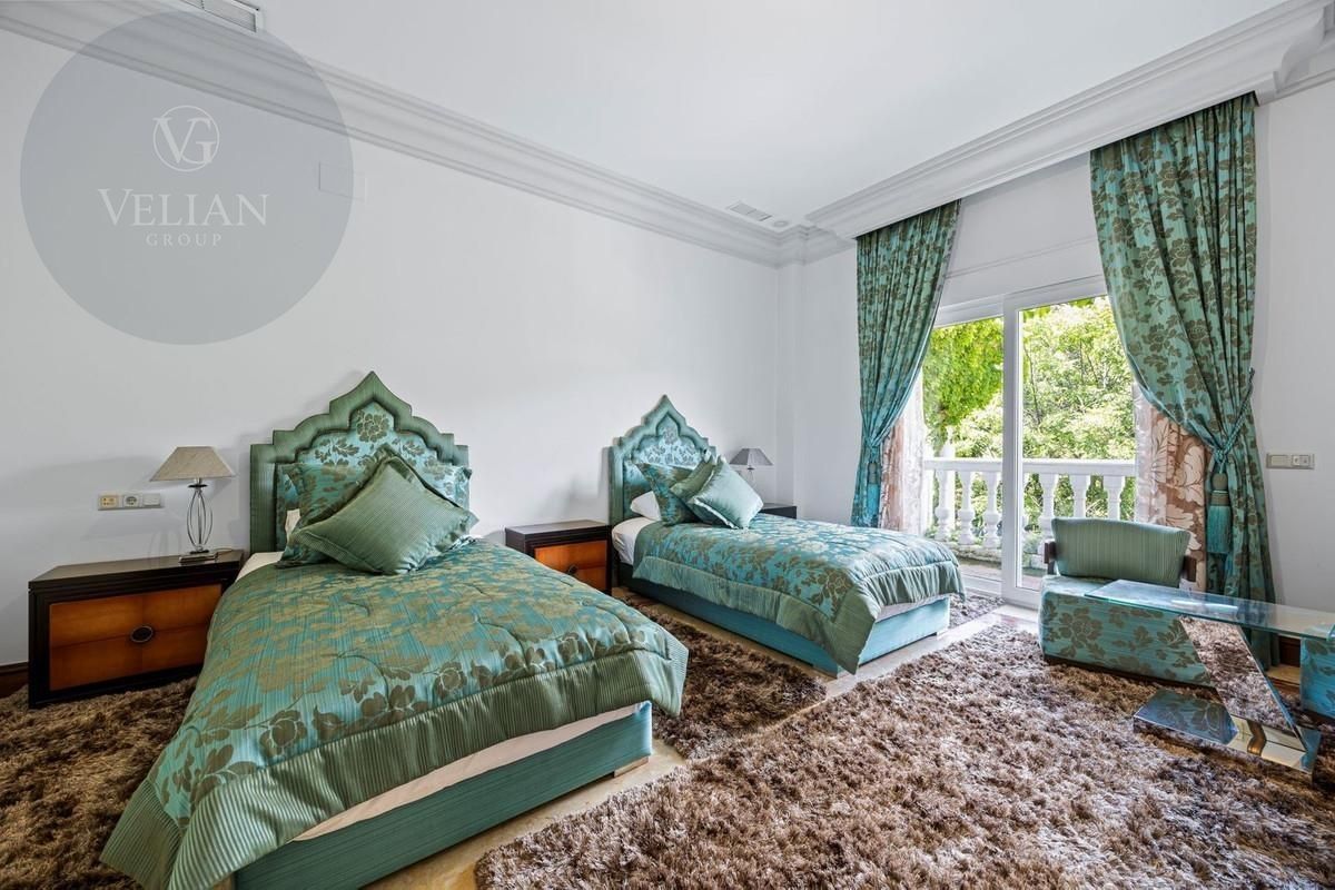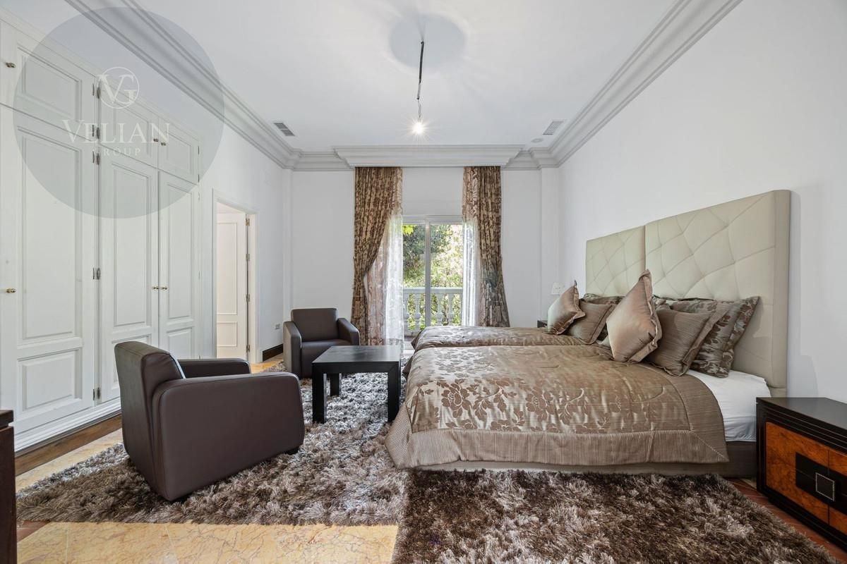 El vestíbulo principal, con su doble escalera simétrica y suelos de mármol en damero, marca el corazón de la propiedad. En la planta superior se encuentra la suite principal, una estancia de más de 200 m², con dos baños en mármol natural, dos vestidores independientes y acceso a una terraza privada. A ambos lados, cuatro dormitorios adicionales con baños en suite y terrazas garantizan comodidad y privacidad.