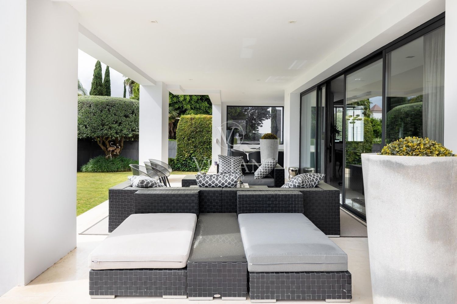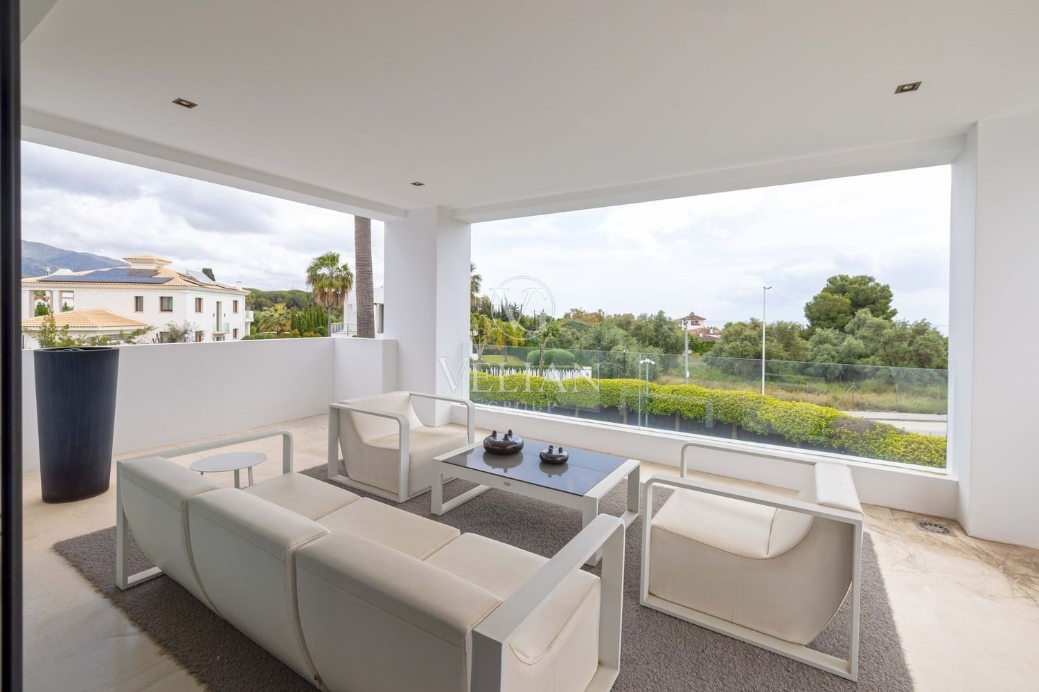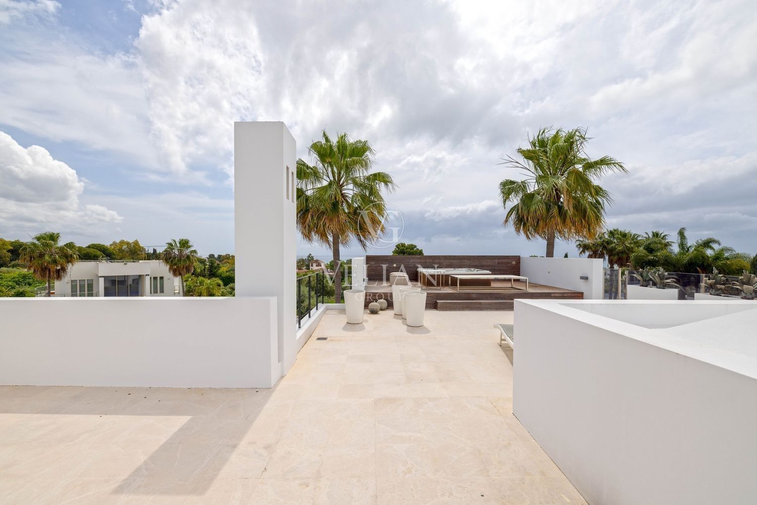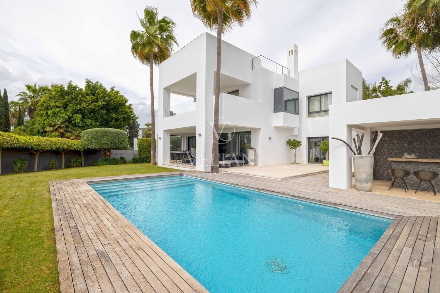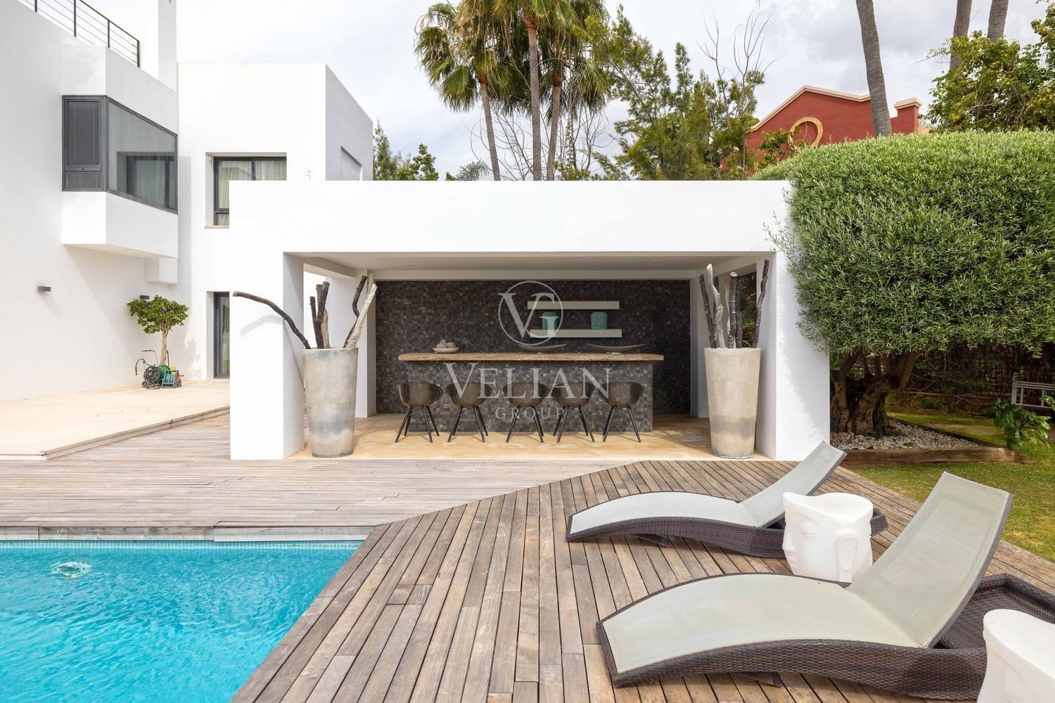 Villa en Altos de Puente Romano, MarbellaEsta magnífica villa se encuentra en un exclusivo complejo residencial con seguridad las 24 horas, a solo 10 minutos en coche del puerto deportivo de Puerto Banús y del casco antiguo de Marbella. Cuenta con 582 metros cuadrados construidos, con amplias terrazas en una parcela de algo más de mil metros.La villa cuenta con amplias zonas de estar y comedor que se conectan con las terrazas y los jardines, que incluyen una piscina climatizada de agua salada y una zona de barbacoa cubierta. Al ingresar, encontrarás un acogedor hall de entrada con un aseo de invitados. La moderna cocina completamente equipada se conecta con una sala de estar decorada con muebles de alta calidad. En esta planta también se encuentra una amplia suite de invitados con terraza privada y acceso directo al jardín.En la primera planta, la villa ofrece tres dormitorios en-suite, siendo el dormitorio principal el más destacado, con vestidor, terraza privada cubierta y vistas panorámicas al mar.El solárium es una zona chill-out con un gran jacuzzi desde donde se pueden admirar vistas panorámicas del mar y la montaña de La Concha.La planta de sótano incluye una zona de entretenimiento, con un bar, sala de cine, y un gimnasio bien equipado. Esta planta también cuenta con un amplio dormitorio con baño en-suite, ideal para huéspedes o familiares.Esta villa combina lujo moderno y elegancia mediterránea, ofreciendo una experiencia de vida refinada en una de las zonas más solicitadas de Marbella.