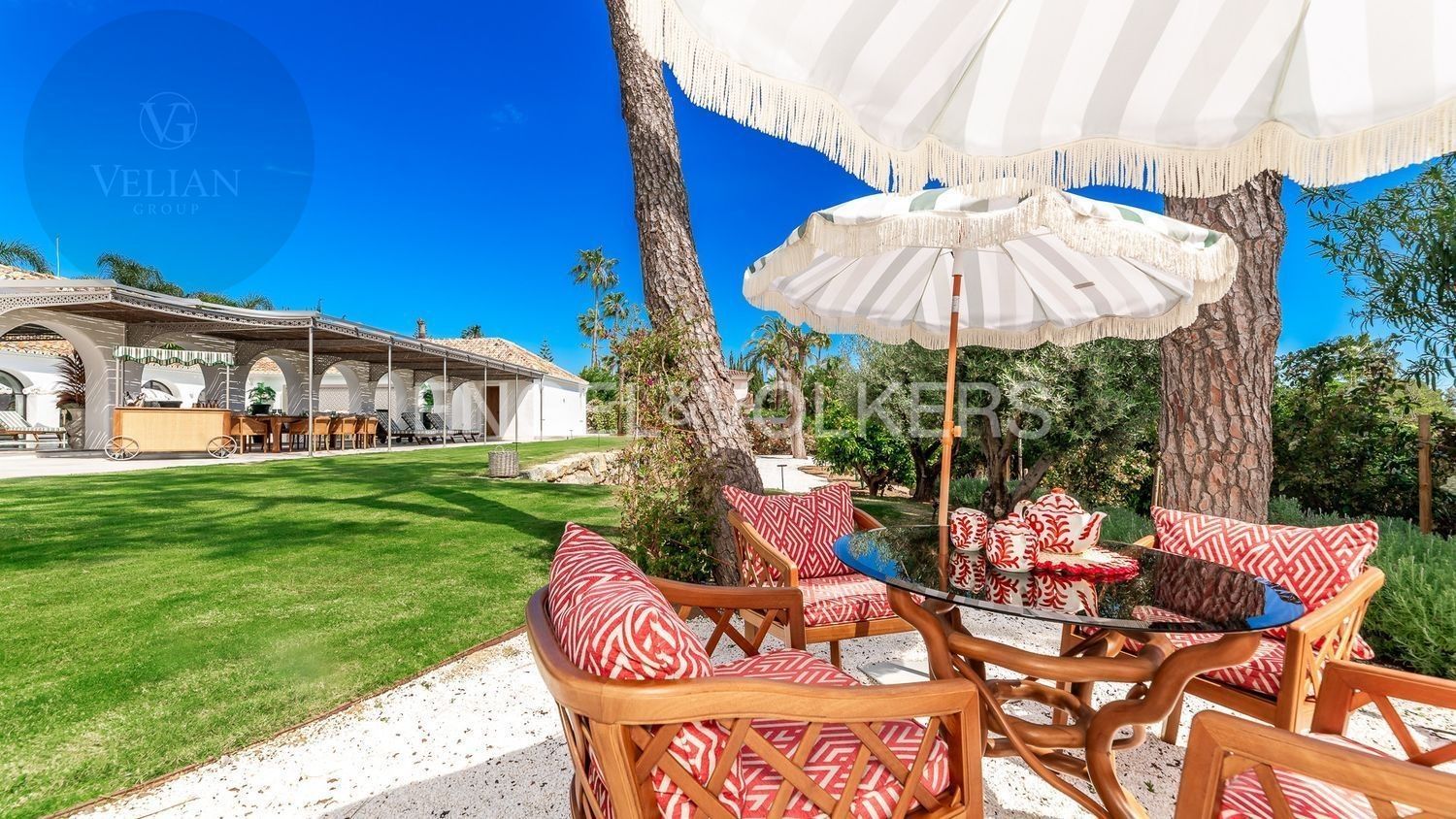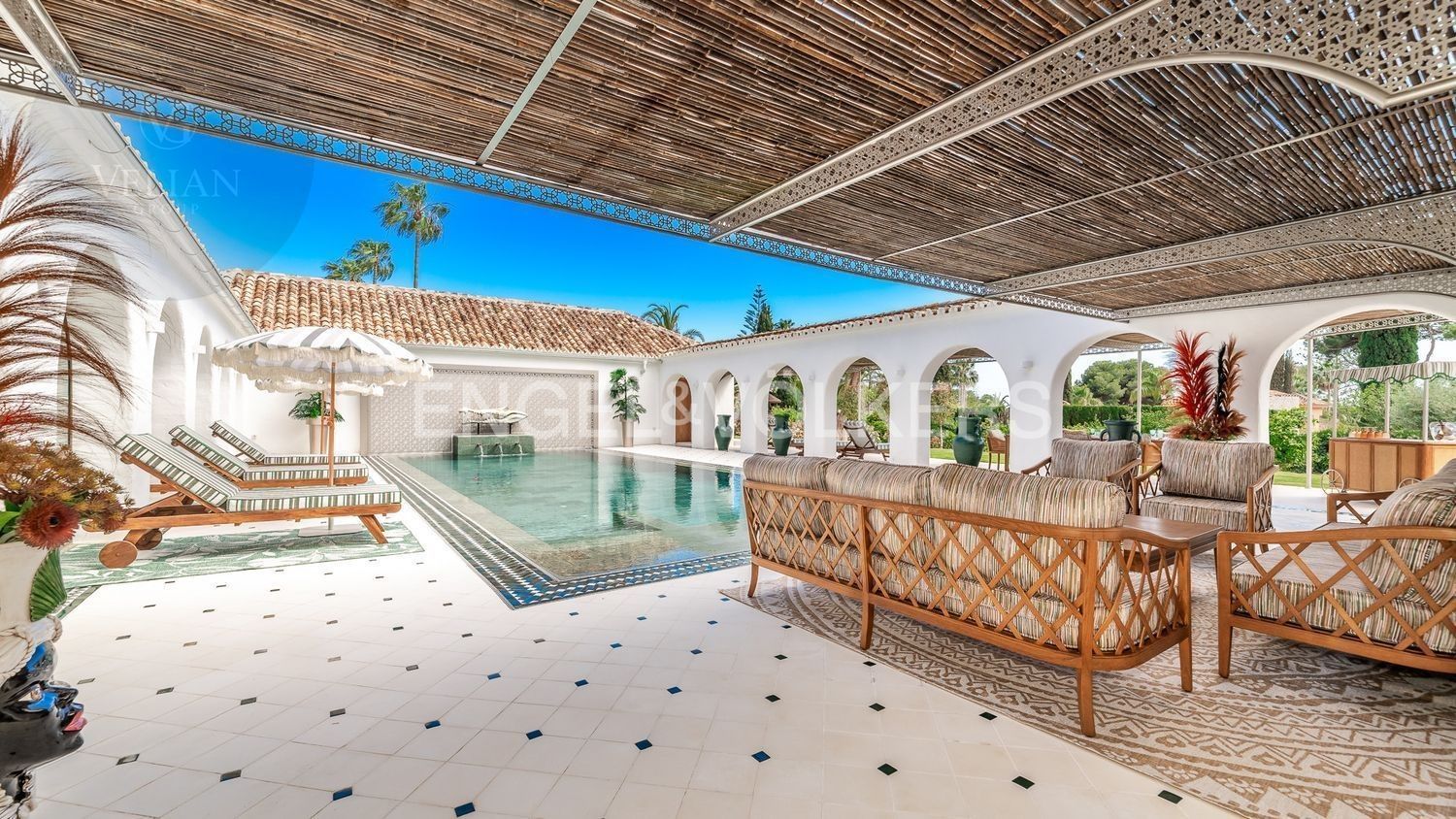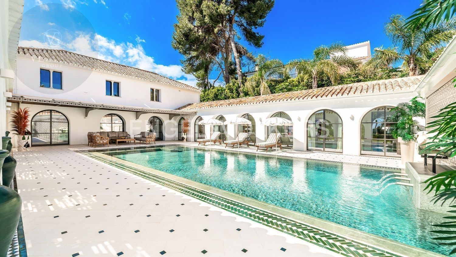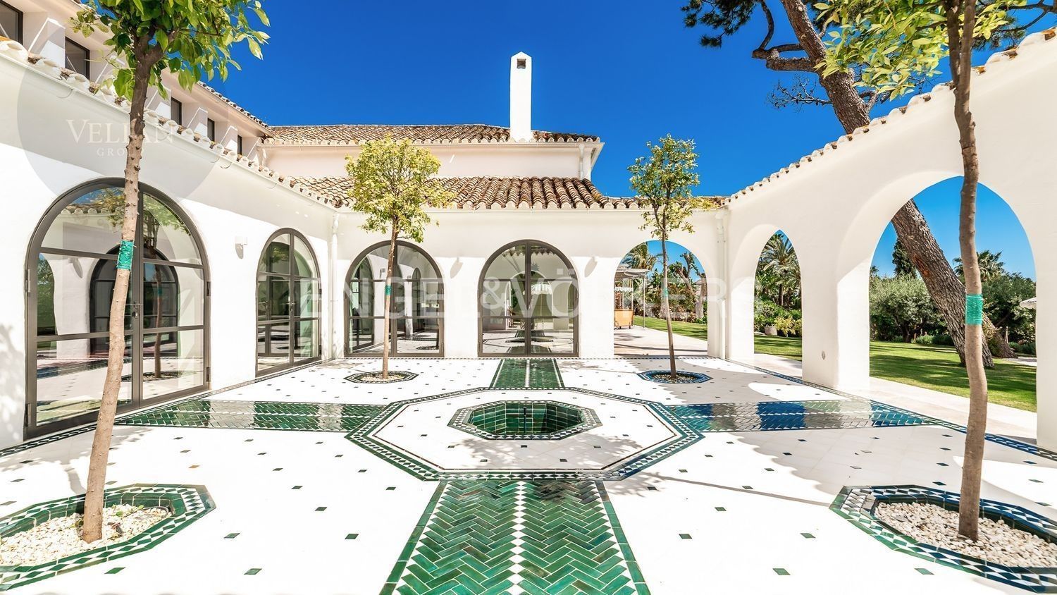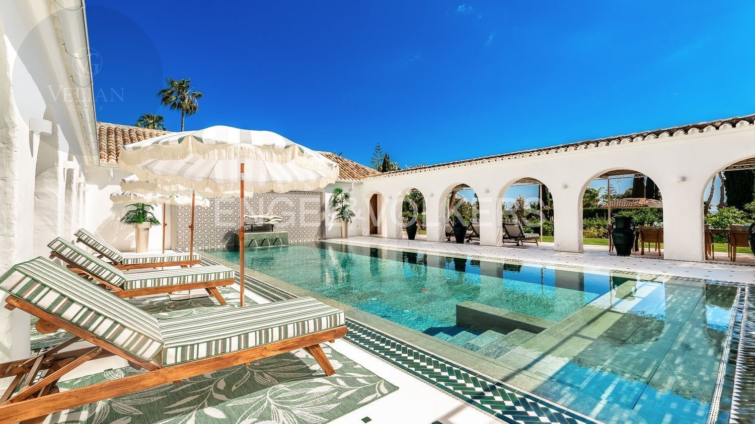 Este espectacular cortijo ofrece un oasis de tranquilidad y lujo en el corazón de Los Monteros, una de las zonas residenciales más exclusivas de Marbella, con seguridad las 24 horas. Construido sobre una parcela de 2.600 m², y ubicado a tan solo unos minutos a pie de la playa, la propiedad ha sido completamente renovada con materiales de alta calidad y un diseño inspirado en la arquitectura de la Alhambra, fusionando armoniosamente el encanto árabe-andaluz con un estilo moderno.Al entrar, descubrimos una galería que recorre la piscina, adornada con arcos y vigas vistas, que nos guía hacia el salón, destacado por su doble altura de techo y sus azulejos originales. Desde aquí, se accede a la zona de comedor con chimenea, que disfruta de grandes puertas acristaladas abiertas hacia un encantador patio andaluz. Esta área se completa con una excepcional cocina, diseñada en palisandro y decorada con tallas artesanales de estilo granadino. La cocina también es accesible desde la galería trasera, donde se ubica la zona de lavandería. Esta planta se completa con tres dormitorios en suite, un vestidor y un aseo de invitados.La planta alta alberga el dormitorio principal, que cuenta con un balcón con vistas al mar, un vestidor y un baño en suite. Además, en esta planta se encuentran el quinto dormitorio en suite y una sala actualmente utilizada como oficina, ya preinstalada para convertirse en una sala de cine. En la azotea, se puede disfrutar del solárium con impresionantes vistas al mar.La propiedad se completa con una sala en el sótano dedicada al ocio, equipada con un bar integrado, un aseo de invitados y espacios de almacenamiento.El cortijo está rodeado de amplias terrazas y zonas de relax en los jardines. En la zona de la piscina se encuentran un salón y un comedor bajo pérgolas, ideales para disfrutar de la serenidad y la belleza de la arquitectura de arcos andaluces que enmarcan una piscina de generosas dimensiones.Otras características de la propiedad incluyen: suelo radiante y aire acondicionado frío/calor, sistema de domótica, baño y aseo en la zona de piscina, aseo para el personal, garaje para tres coches y varias plazas de aparcamiento, riego automático y sistema de alarma.La vivienda se entrega amueblada, con numerosos muebles diseñados a medida, a excepción de las piezas de arte y algunos muebles de colección.