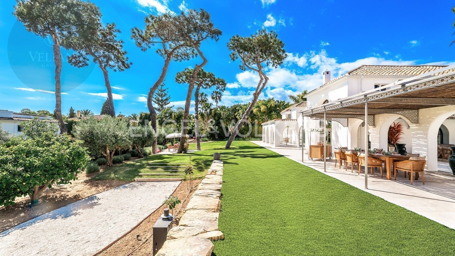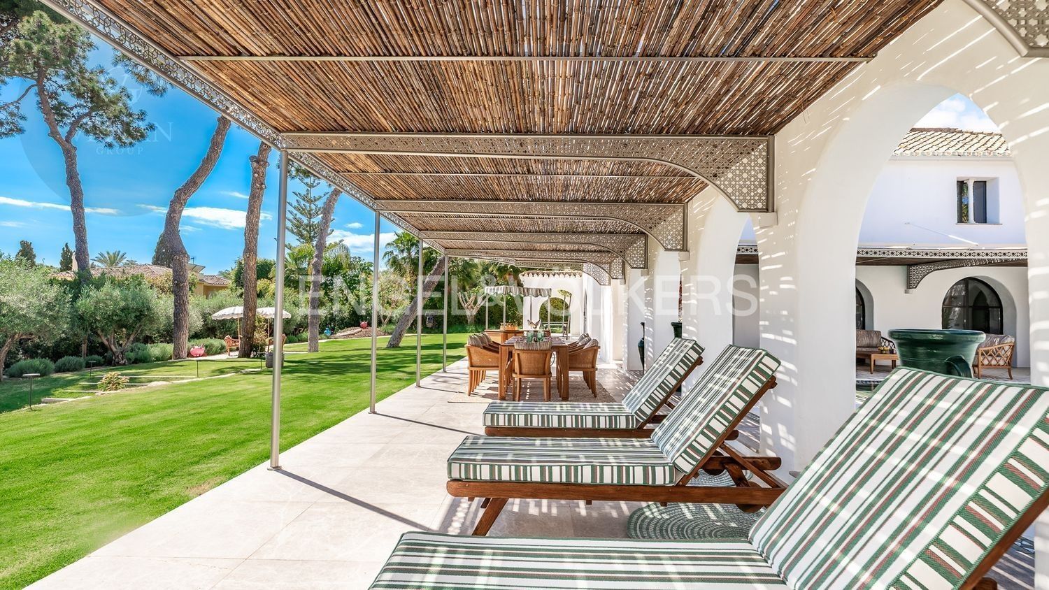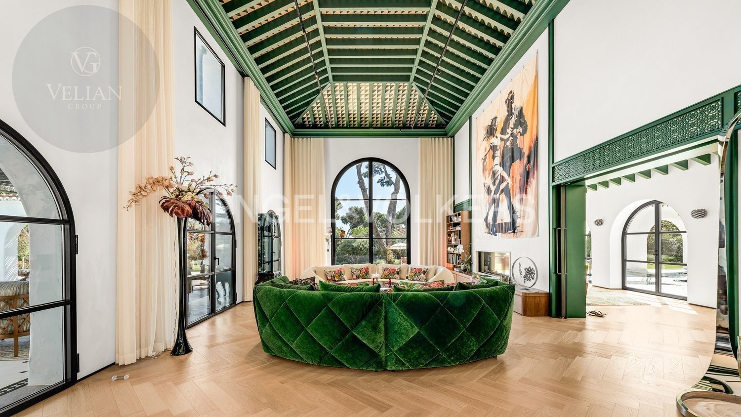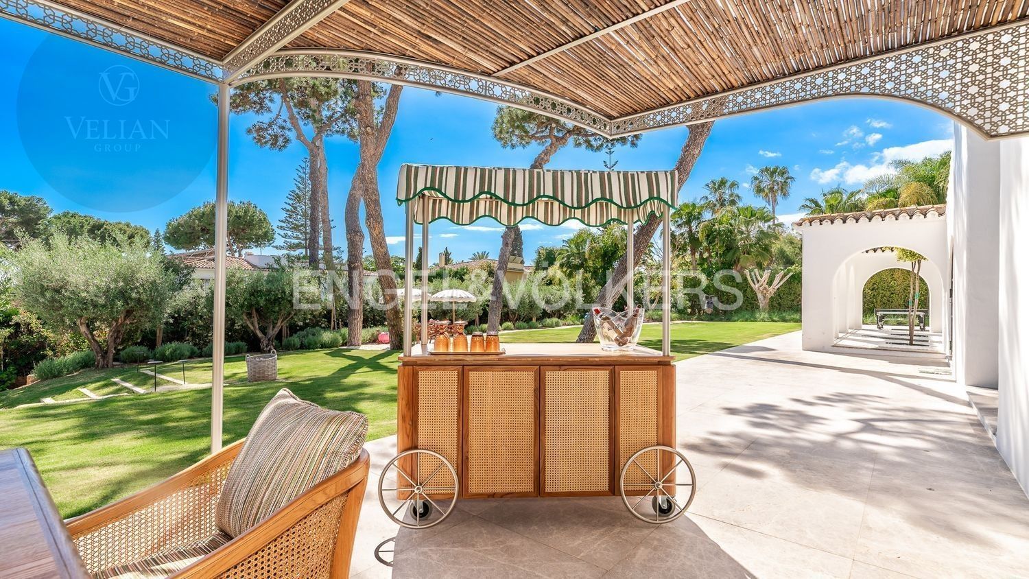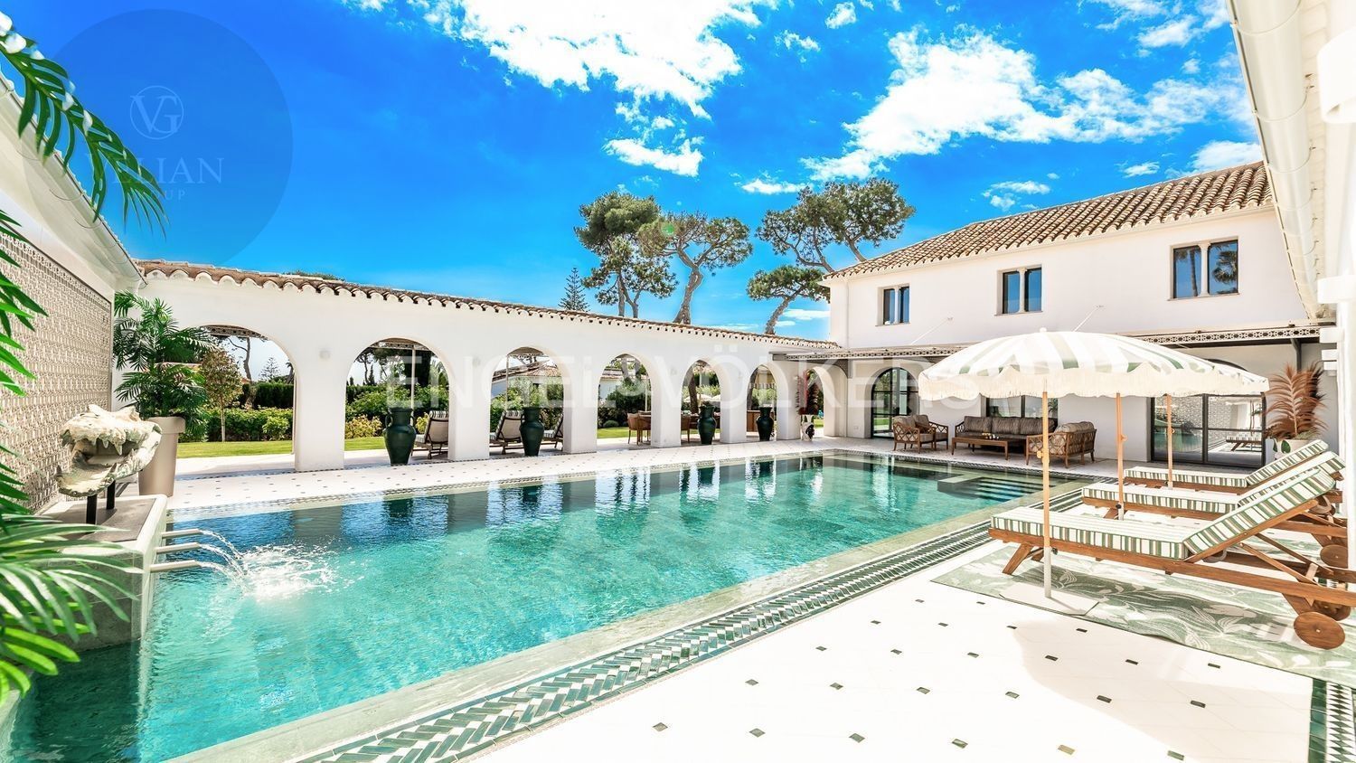 Este espectacular cortijo ofrece un oasis de tranquilidad y lujo en el corazón de Los Monteros, una de las zonas residenciales más exclusivas de Marbella, con seguridad las 24 horas. Construido sobre una parcela de 2.600 m², y ubicado a tan solo unos minutos a pie de la playa, la propiedad ha sido completamente renovada con materiales de alta calidad y un diseño inspirado en la arquitectura de la Alhambra, fusionando armoniosamente el encanto árabe-andaluz con un estilo moderno.Al entrar, descubrimos una galería que recorre la piscina, adornada con arcos y vigas vistas, que nos guía hacia el salón, destacado por su doble altura de techo y sus azulejos originales. Desde aquí, se accede a la zona de comedor con chimenea, que disfruta de grandes puertas acristaladas abiertas hacia un encantador patio andaluz. Esta área se completa con una excepcional cocina, diseñada en palisandro y decorada con tallas artesanales de estilo granadino. La cocina también es accesible desde la galería trasera, donde se ubica la zona de lavandería. Esta planta se completa con tres dormitorios en suite, un vestidor y un aseo de invitados.La planta alta alberga el dormitorio principal, que cuenta con un balcón con vistas al mar, un vestidor y un baño en suite. Además, en esta planta se encuentran el quinto dormitorio en suite y una sala actualmente utilizada como oficina, ya preinstalada para convertirse en una sala de cine. En la azotea, se puede disfrutar del solárium con impresionantes vistas al mar.La propiedad se completa con una sala en el sótano dedicada al ocio, equipada con un bar integrado, un aseo de invitados y espacios de almacenamiento.El cortijo está rodeado de amplias terrazas y zonas de relax en los jardines. En la zona de la piscina se encuentran un salón y un comedor bajo pérgolas, ideales para disfrutar de la serenidad y la belleza de la arquitectura de arcos andaluces que enmarcan una piscina de generosas dimensiones.Otras características de la propiedad incluyen: suelo radiante y aire acondicionado frío/calor, sistema de domótica, baño y aseo en la zona de piscina, aseo para el personal, garaje para tres coches y varias plazas de aparcamiento, riego automático y sistema de alarma.La vivienda se entrega amueblada, con numerosos muebles diseñados a medida, a excepción de las piezas de arte y algunos muebles de colección.