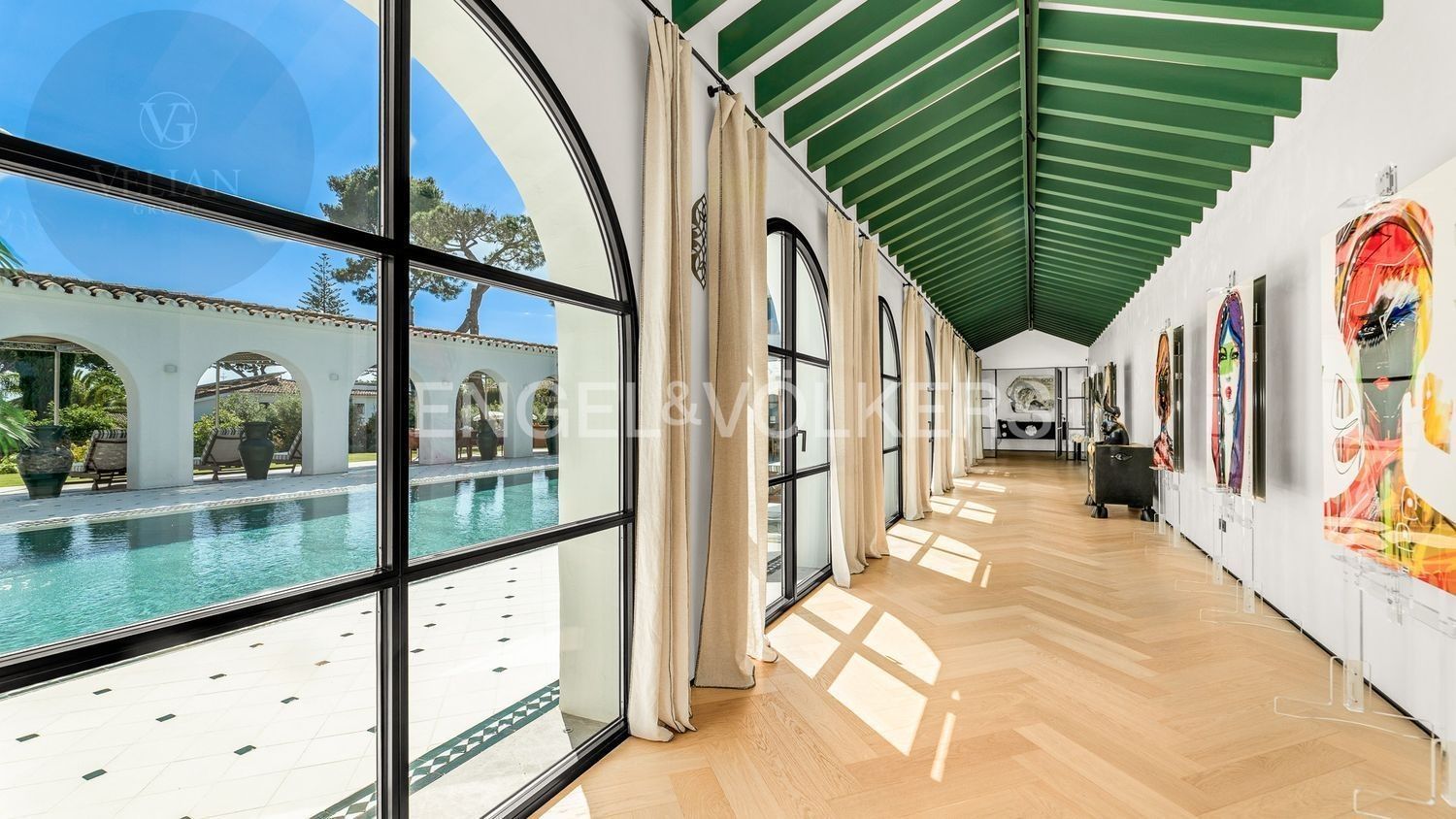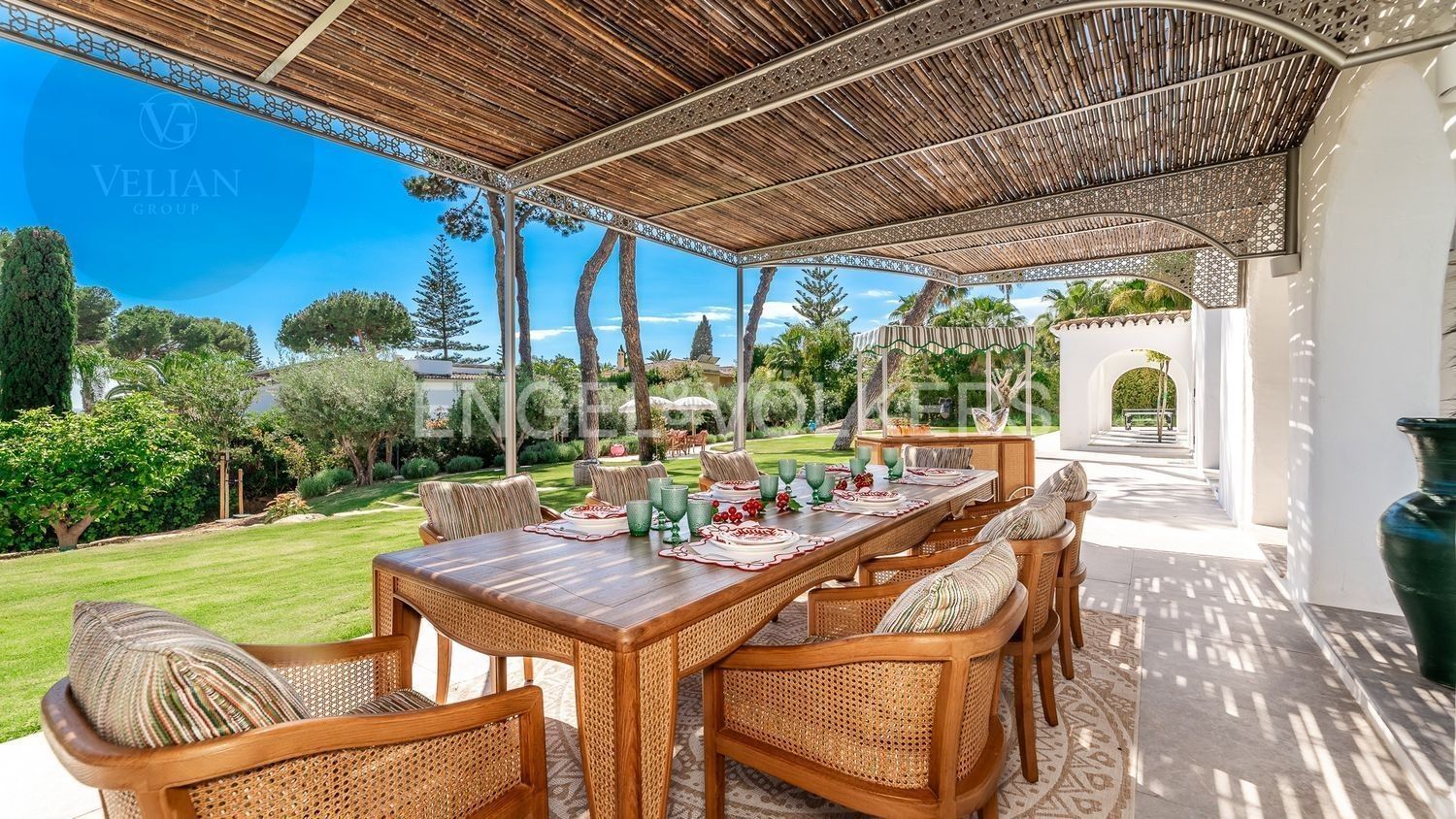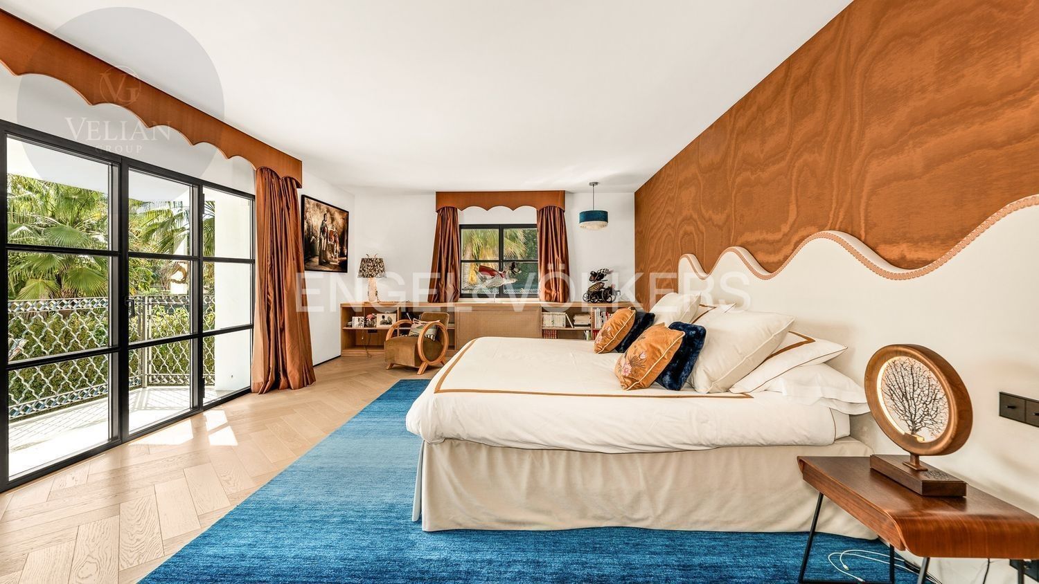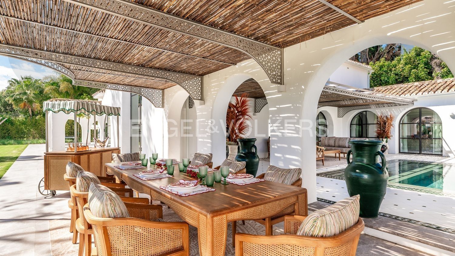 Este espectacular cortijo ofrece un oasis de tranquilidad y lujo en el corazón de Los Monteros, una de las zonas residenciales más exclusivas de Marbella, con seguridad las 24 horas. Construido sobre una parcela de 2.600 m², y ubicado a tan solo unos minutos a pie de la playa, la propiedad ha sido completamente renovada con materiales de alta calidad y un diseño inspirado en la arquitectura de la Alhambra, fusionando armoniosamente el encanto árabe-andaluz con un estilo moderno.Al entrar, descubrimos una galería que recorre la piscina, adornada con arcos y vigas vistas, que nos guía hacia el salón, destacado por su doble altura de techo y sus azulejos originales. Desde aquí, se accede a la zona de comedor con chimenea, que disfruta de grandes puertas acristaladas abiertas hacia un encantador patio andaluz. Esta área se completa con una excepcional cocina, diseñada en palisandro y decorada con tallas artesanales de estilo granadino. La cocina también es accesible desde la galería trasera, donde se ubica la zona de lavandería. Esta planta se completa con tres dormitorios en suite, un vestidor y un aseo de invitados.La planta alta alberga el dormitorio principal, que cuenta con un balcón con vistas al mar, un vestidor y un baño en suite. Además, en esta planta se encuentran el quinto dormitorio en suite y una sala actualmente utilizada como oficina, ya preinstalada para convertirse en una sala de cine. En la azotea, se puede disfrutar del solárium con impresionantes vistas al mar.La propiedad se completa con una sala en el sótano dedicada al ocio, equipada con un bar integrado, un aseo de invitados y espacios de almacenamiento.El cortijo está rodeado de amplias terrazas y zonas de relax en los jardines. En la zona de la piscina se encuentran un salón y un comedor bajo pérgolas, ideales para disfrutar de la serenidad y la belleza de la arquitectura de arcos andaluces que enmarcan una piscina de generosas dimensiones.Otras características de la propiedad incluyen: suelo radiante y aire acondicionado frío/calor, sistema de domótica, baño y aseo en la zona de piscina, aseo para el personal, garaje para tres coches y varias plazas de aparcamiento, riego automático y sistema de alarma.La vivienda se entrega amueblada, con numerosos muebles diseñados a medida, a excepción de las piezas de arte y algunos muebles de colección.