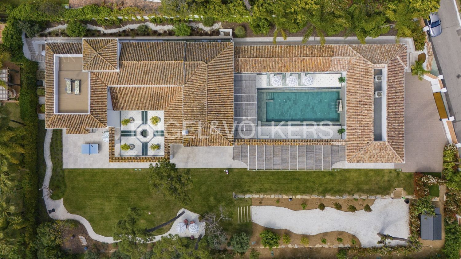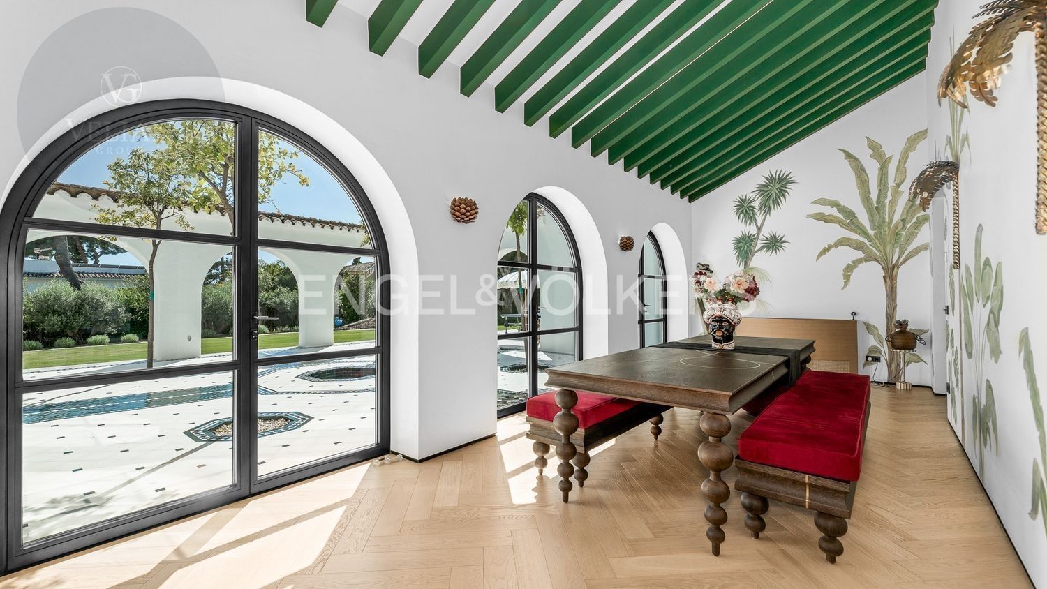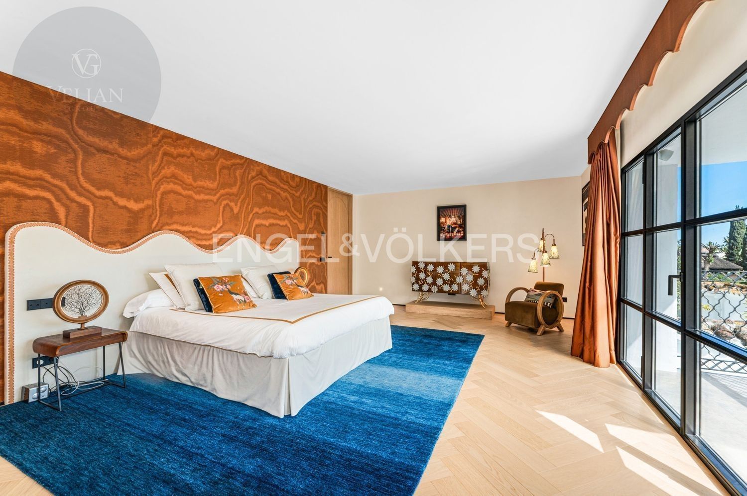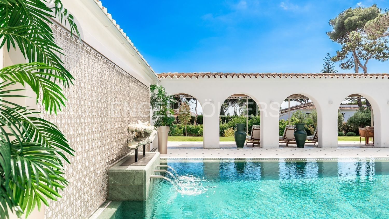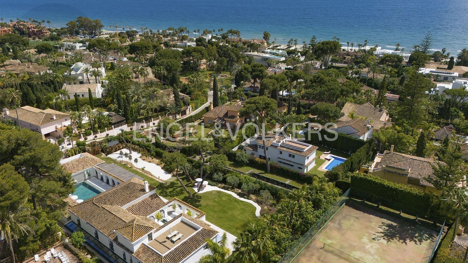 Este espectacular cortijo ofrece un oasis de tranquilidad y lujo en el corazón de Los Monteros, una de las zonas residenciales más exclusivas de Marbella, con seguridad las 24 horas. Construido sobre una parcela de 2.600 m², y ubicado a tan solo unos minutos a pie de la playa, la propiedad ha sido completamente renovada con materiales de alta calidad y un diseño inspirado en la arquitectura de la Alhambra, fusionando armoniosamente el encanto árabe-andaluz con un estilo moderno.Al entrar, descubrimos una galería que recorre la piscina, adornada con arcos y vigas vistas, que nos guía hacia el salón, destacado por su doble altura de techo y sus azulejos originales. Desde aquí, se accede a la zona de comedor con chimenea, que disfruta de grandes puertas acristaladas abiertas hacia un encantador patio andaluz. Esta área se completa con una excepcional cocina, diseñada en palisandro y decorada con tallas artesanales de estilo granadino. La cocina también es accesible desde la galería trasera, donde se ubica la zona de lavandería. Esta planta se completa con tres dormitorios en suite, un vestidor y un aseo de invitados.La planta alta alberga el dormitorio principal, que cuenta con un balcón con vistas al mar, un vestidor y un baño en suite. Además, en esta planta se encuentran el quinto dormitorio en suite y una sala actualmente utilizada como oficina, ya preinstalada para convertirse en una sala de cine. En la azotea, se puede disfrutar del solárium con impresionantes vistas al mar.La propiedad se completa con una sala en el sótano dedicada al ocio, equipada con un bar integrado, un aseo de invitados y espacios de almacenamiento.El cortijo está rodeado de amplias terrazas y zonas de relax en los jardines. En la zona de la piscina se encuentran un salón y un comedor bajo pérgolas, ideales para disfrutar de la serenidad y la belleza de la arquitectura de arcos andaluces que enmarcan una piscina de generosas dimensiones.Otras características de la propiedad incluyen: suelo radiante y aire acondicionado frío/calor, sistema de domótica, baño y aseo en la zona de piscina, aseo para el personal, garaje para tres coches y varias plazas de aparcamiento, riego automático y sistema de alarma.La vivienda se entrega amueblada, con numerosos muebles diseñados a medida, a excepción de las piezas de arte y algunos muebles de colección.