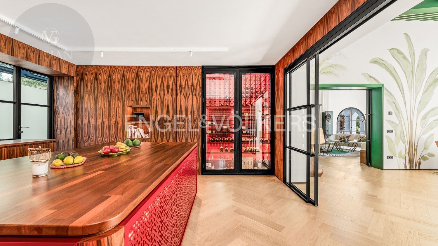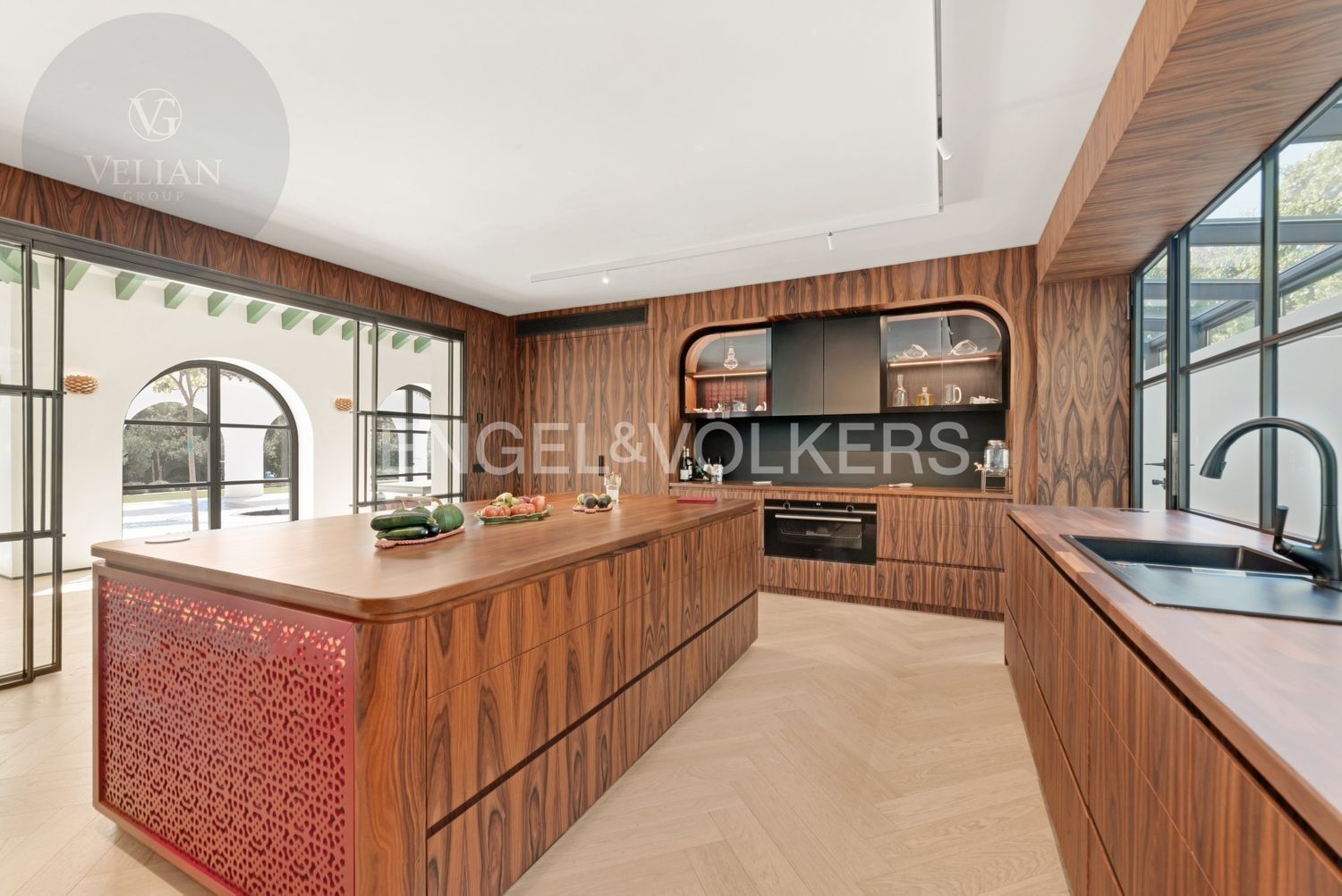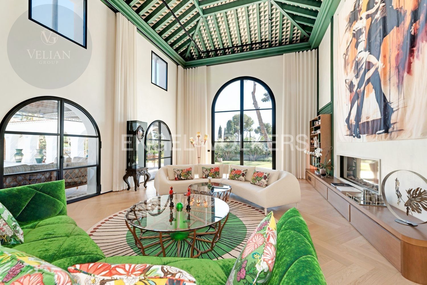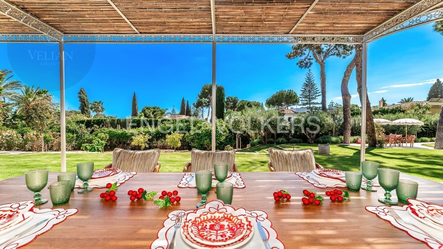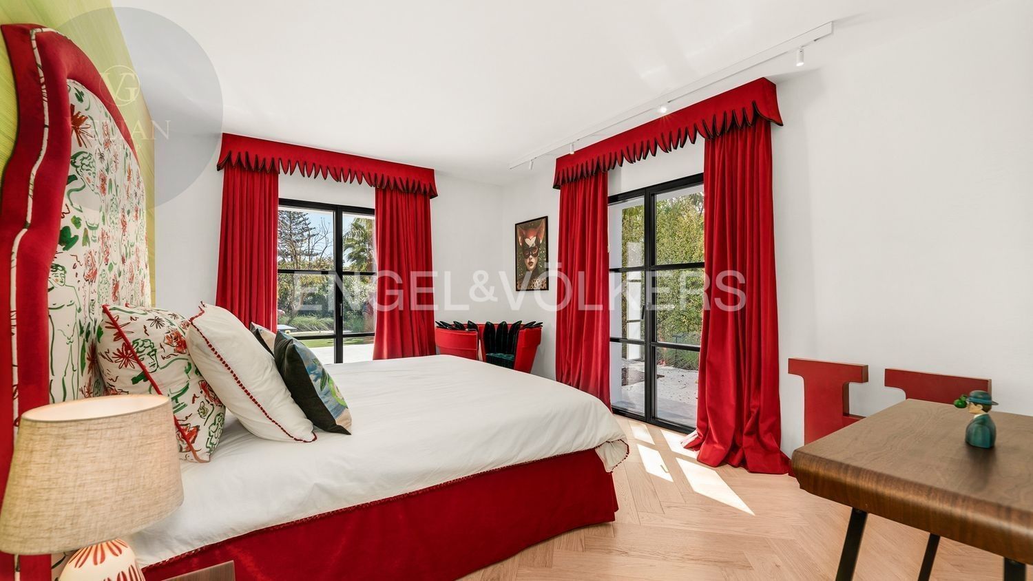 Este espectacular cortijo ofrece un oasis de tranquilidad y lujo en el corazón de Los Monteros, una de las zonas residenciales más exclusivas de Marbella, con seguridad las 24 horas. Construido sobre una parcela de 2.600 m², y ubicado a tan solo unos minutos a pie de la playa, la propiedad ha sido completamente renovada con materiales de alta calidad y un diseño inspirado en la arquitectura de la Alhambra, fusionando armoniosamente el encanto árabe-andaluz con un estilo moderno.Al entrar, descubrimos una galería que recorre la piscina, adornada con arcos y vigas vistas, que nos guía hacia el salón, destacado por su doble altura de techo y sus azulejos originales. Desde aquí, se accede a la zona de comedor con chimenea, que disfruta de grandes puertas acristaladas abiertas hacia un encantador patio andaluz. Esta área se completa con una excepcional cocina, diseñada en palisandro y decorada con tallas artesanales de estilo granadino. La cocina también es accesible desde la galería trasera, donde se ubica la zona de lavandería. Esta planta se completa con tres dormitorios en suite, un vestidor y un aseo de invitados.La planta alta alberga el dormitorio principal, que cuenta con un balcón con vistas al mar, un vestidor y un baño en suite. Además, en esta planta se encuentran el quinto dormitorio en suite y una sala actualmente utilizada como oficina, ya preinstalada para convertirse en una sala de cine. En la azotea, se puede disfrutar del solárium con impresionantes vistas al mar.La propiedad se completa con una sala en el sótano dedicada al ocio, equipada con un bar integrado, un aseo de invitados y espacios de almacenamiento.El cortijo está rodeado de amplias terrazas y zonas de relax en los jardines. En la zona de la piscina se encuentran un salón y un comedor bajo pérgolas, ideales para disfrutar de la serenidad y la belleza de la arquitectura de arcos andaluces que enmarcan una piscina de generosas dimensiones.Otras características de la propiedad incluyen: suelo radiante y aire acondicionado frío/calor, sistema de domótica, baño y aseo en la zona de piscina, aseo para el personal, garaje para tres coches y varias plazas de aparcamiento, riego automático y sistema de alarma.La vivienda se entrega amueblada, con numerosos muebles diseñados a medida, a excepción de las piezas de arte y algunos muebles de colección.