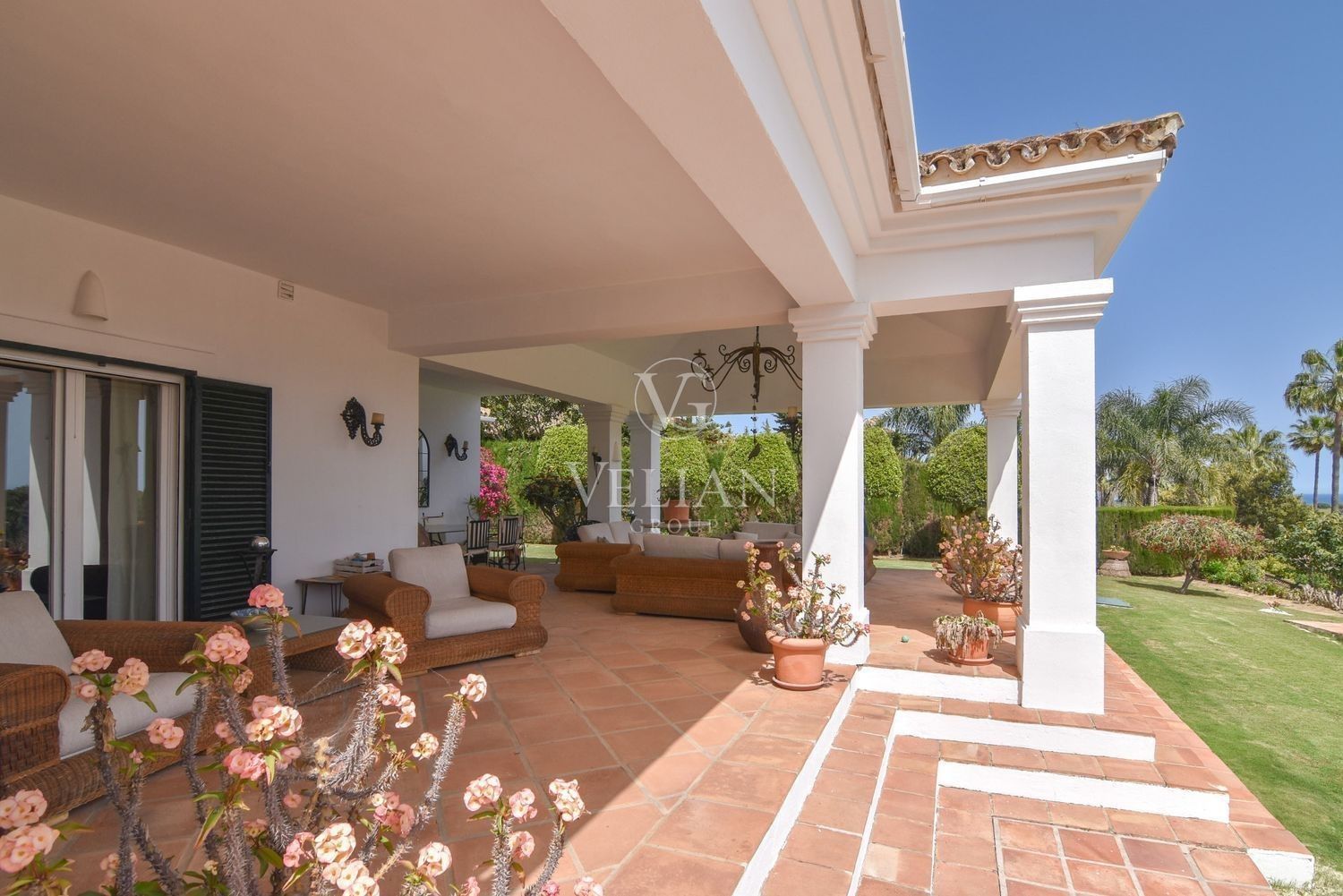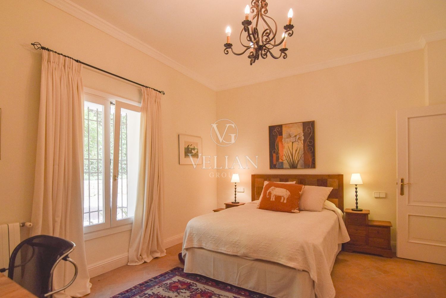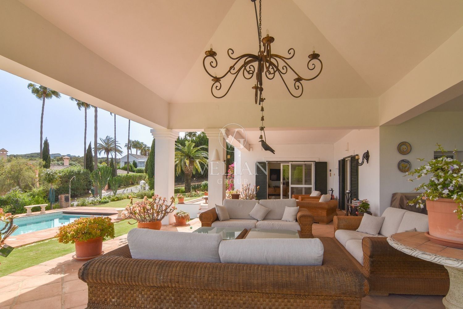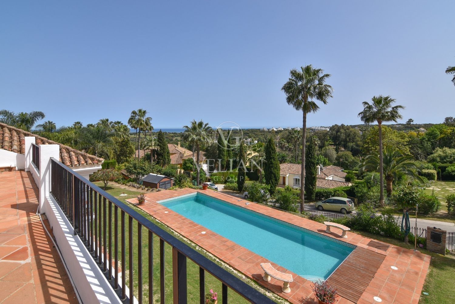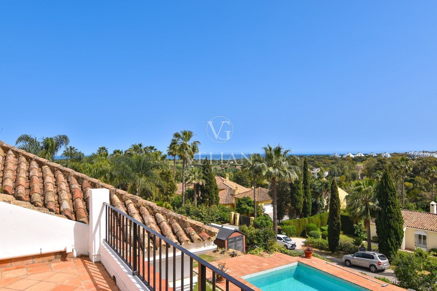 Amplia y encantadora villa familiar de estilo andaluz tradicional en venta en la prestigiosa zona F de Sotogrande Alto.La propiedad ofrece una elegante entrada a través de un hall que conecta con un amplio salón con chimenea, un comedor semiindependiente y un despacho adyacente pero separado. La cocina, que se abre hacia el comedor y el salón, cuenta con una zona de desayuno y salida a un patio orientado al suroeste. En esta misma planta se encuentran tres amplias suites de dormitorios y un dormitorio de servicio con acceso independiente.En la planta superior se ubica el dormitorio principal con chimenea y terraza privada. Además, dispone de una estancia muy amplia que puede destinarse a dormitorio adicional, vestidor o sala de juegos.El jardín es verdaderamente especial: abierto, luminoso y con preciosas vistas laterales al mar. El porche exterior, de techos altos y generosas dimensiones, permite disfrutar del exterior prácticamente todo el año, ofreciendo sombra en verano y protección en los meses más fríos, además de resguardar el mobiliario de exterior. Las vistas pueden disfrutarse tanto desde las terrazas de ambas plantas como desde todo el jardín.Entre otras características, la villa dispone de garaje doble con acceso directo al interior de la vivienda, espacio adicional para aparcamiento de 2 coches en la entrada, ventanas de doble acristalamiento, calefacción central por radiadores de gas y aire acondicionado mediante splits en tres dormitorios.