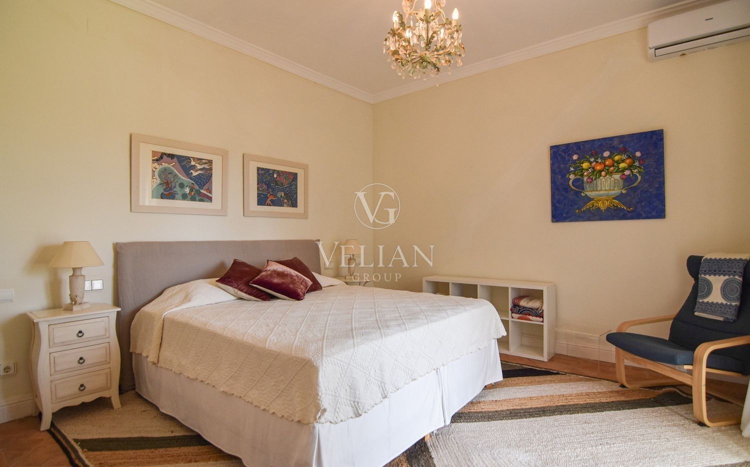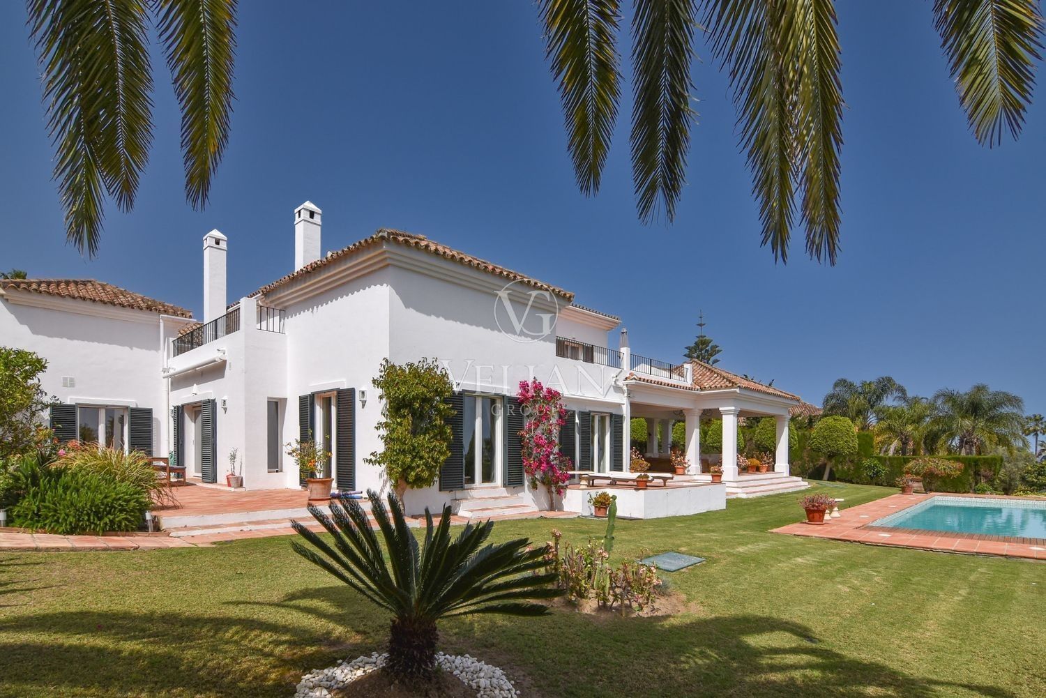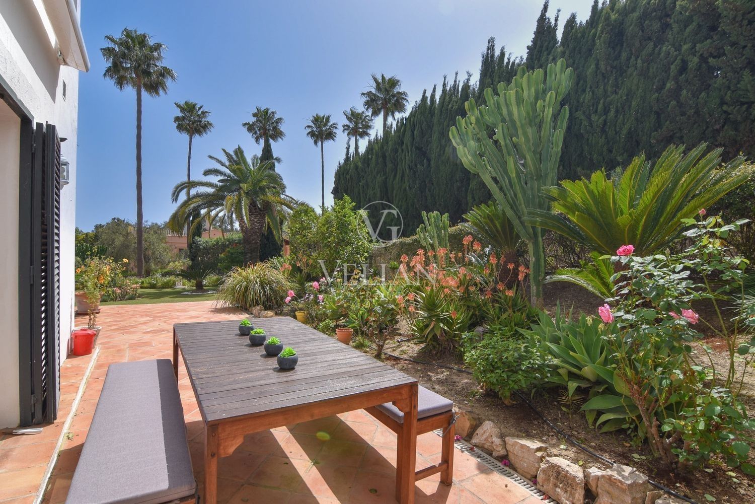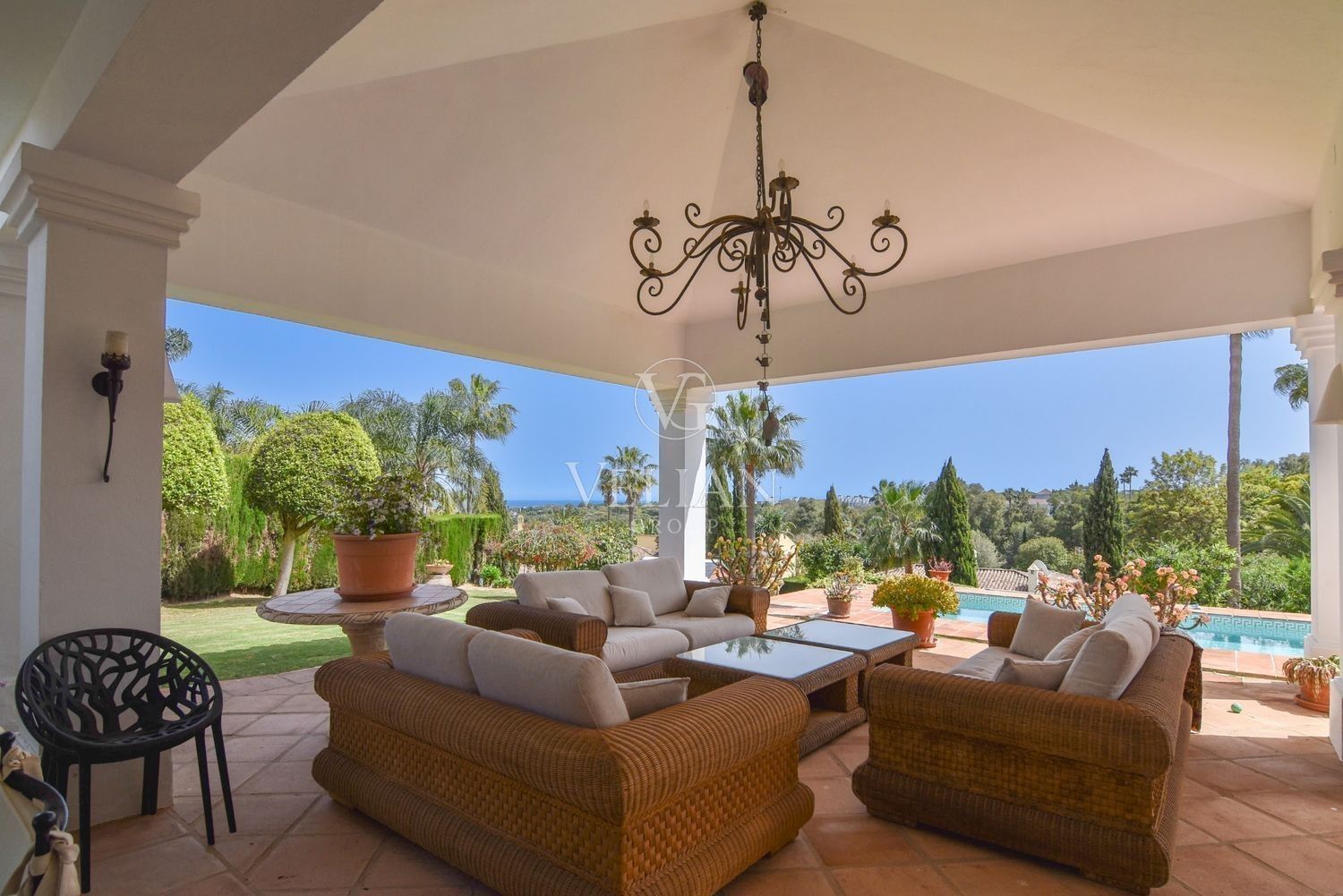 Amplia y encantadora villa familiar de estilo andaluz tradicional en venta en la prestigiosa zona F de Sotogrande Alto.La propiedad ofrece una elegante entrada a través de un hall que conecta con un amplio salón con chimenea, un comedor semiindependiente y un despacho adyacente pero separado. La cocina, que se abre hacia el comedor y el salón, cuenta con una zona de desayuno y salida a un patio orientado al suroeste. En esta misma planta se encuentran tres amplias suites de dormitorios y un dormitorio de servicio con acceso independiente.En la planta superior se ubica el dormitorio principal con chimenea y terraza privada. Además, dispone de una estancia muy amplia que puede destinarse a dormitorio adicional, vestidor o sala de juegos.El jardín es verdaderamente especial: abierto, luminoso y con preciosas vistas laterales al mar. El porche exterior, de techos altos y generosas dimensiones, permite disfrutar del exterior prácticamente todo el año, ofreciendo sombra en verano y protección en los meses más fríos, además de resguardar el mobiliario de exterior. Las vistas pueden disfrutarse tanto desde las terrazas de ambas plantas como desde todo el jardín.Entre otras características, la villa dispone de garaje doble con acceso directo al interior de la vivienda, espacio adicional para aparcamiento de 2 coches en la entrada, ventanas de doble acristalamiento, calefacción central por radiadores de gas y aire acondicionado mediante splits en tres dormitorios.