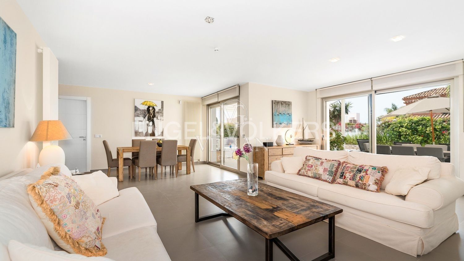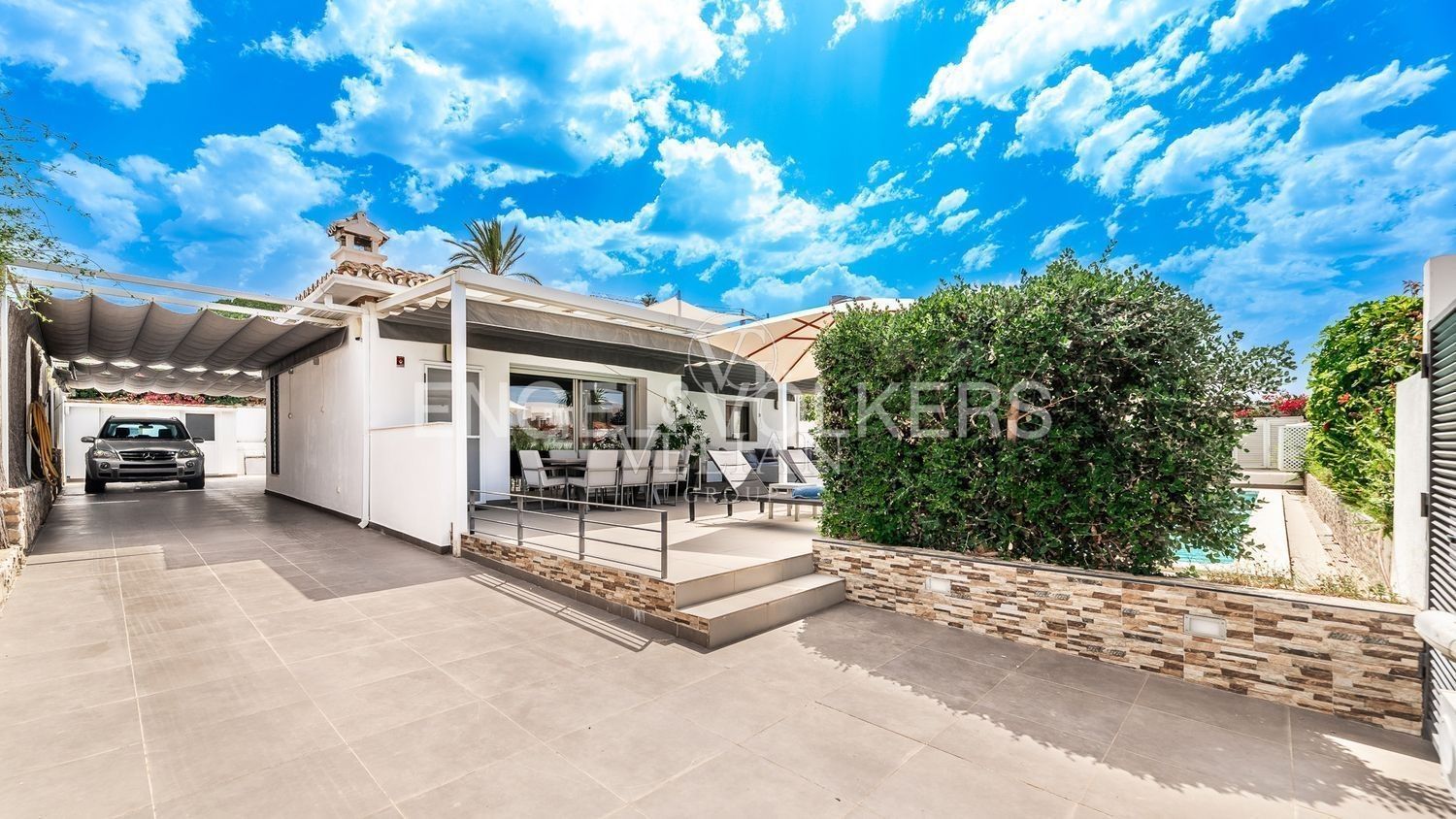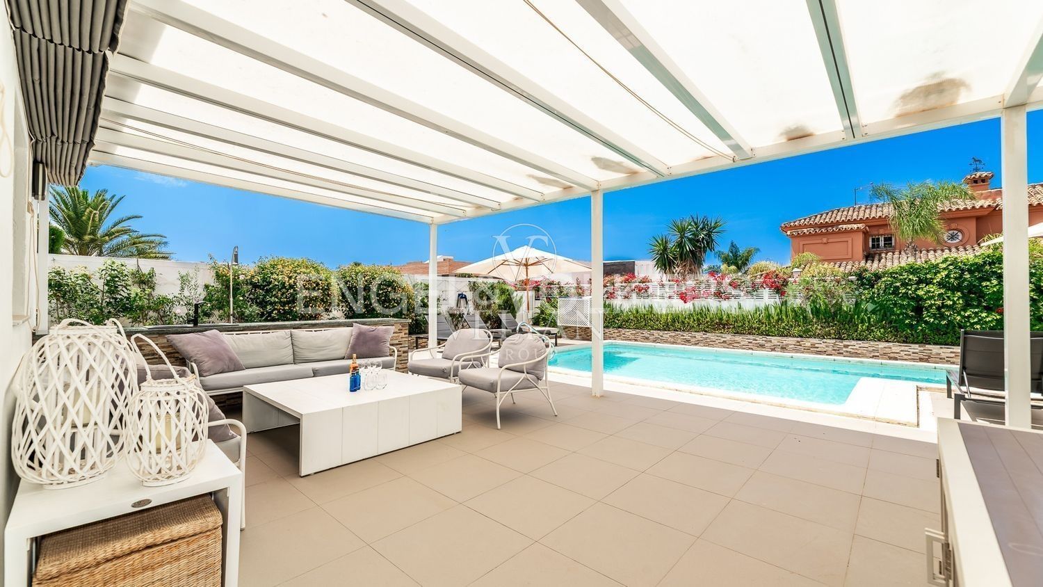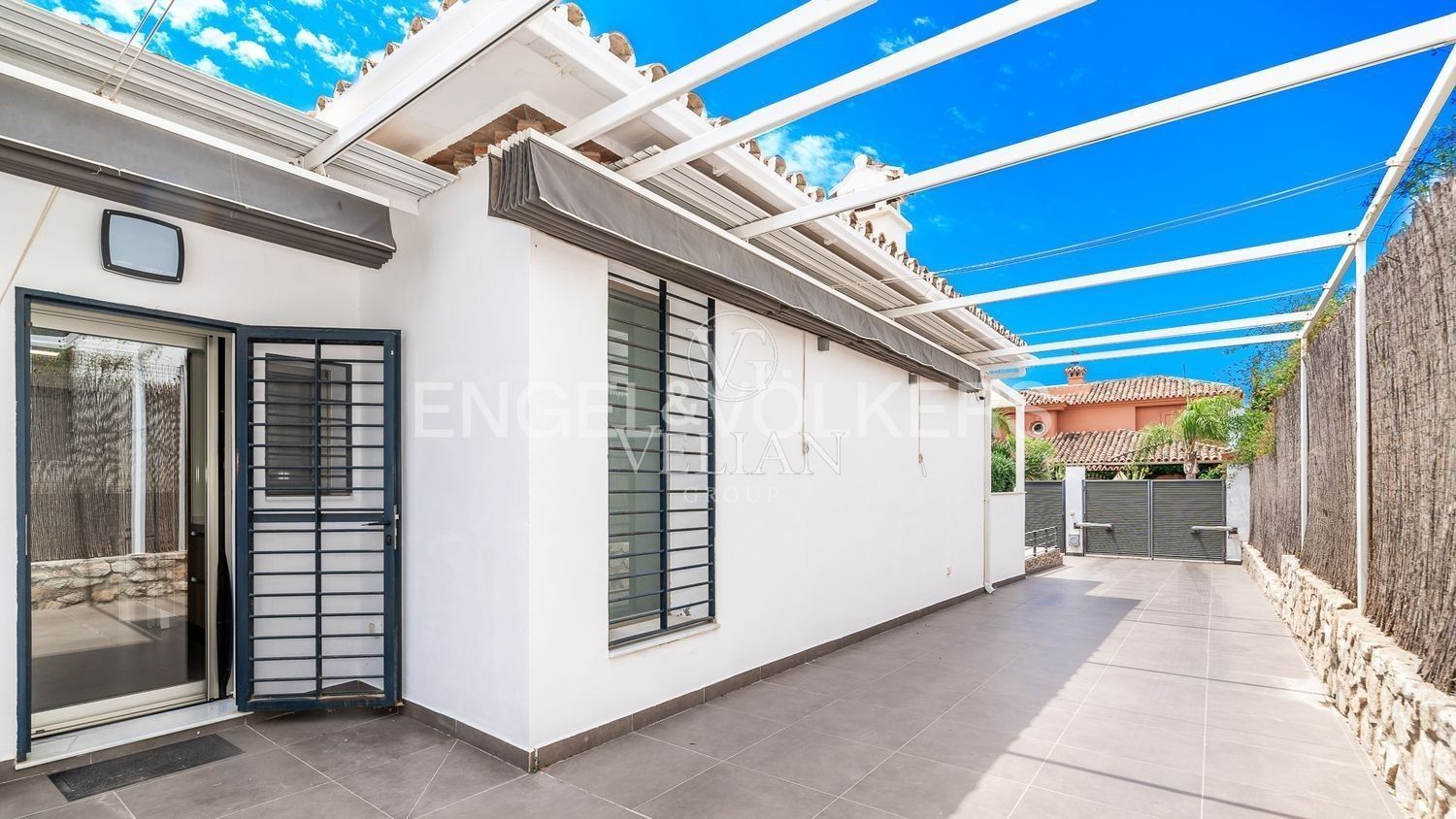 Situada en una tranquila calle de la codiciada zona de Las Chapas Playa, esta luminosa y cuidadosamente reformada villa de 3 dormitorios se encuentra a tan sólo unos pasos de las playas de arena fina en el este de Marbella. Goza de una ubicación inmejorable, a poca distancia a pie de reconocidos restaurantes de playa como Luuma, Dune Beach y Nosso, así como una amplia gama de servicios locales.La propiedad se distribuye en una sola planta y ofrece un acogedor espacio exterior con una amplia piscina climatizada y una generosa terraza, parcialmente cubierta para disfrutar durante todo el año. Esta zona incluye una cocina exterior, un salón comedor al aire libre, todos conectados armoniosamente con las zonas interiores, creando una perfecta fusión entre vida interior y exterior.La cocina es actualmente independiente, aunque existe la posibilidad de integrarla fácilmente en el salón para lograr una distribución más abierta. Los tres dormitorios disponen de baños en suite, y la suite principal cuenta además con un vestidor.Una terraza en la azotea orientada al sur ofrece el lugar ideal para disfrutar de las vistas brillantes del mar Mediterráneo, así como de los amaneceres y atardeceres. Otras características incluyen un trastero independiente, un aparcamiento cubierto para hasta cuatro vehículos, aire acondicionado central y calefacción por radiadores en toda la propiedad. El mantenimiento de la villa es fácil, ya que la parcela está mayormente pavimentada.Ubicada en una comunidad cerrada con seguridad las 24 horas, y con la playa, los servicios y colegios internacionales a pocos pasos, esta villa representa una opción ideal tanto para vivir todo el año como para disfrutar de unas vacaciones excepcionales en Marbella.