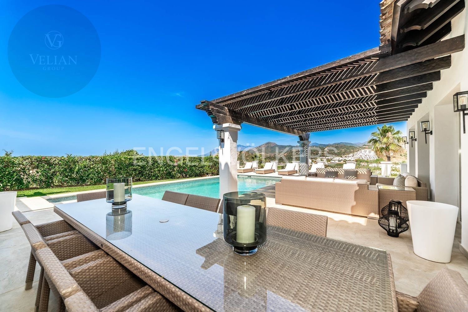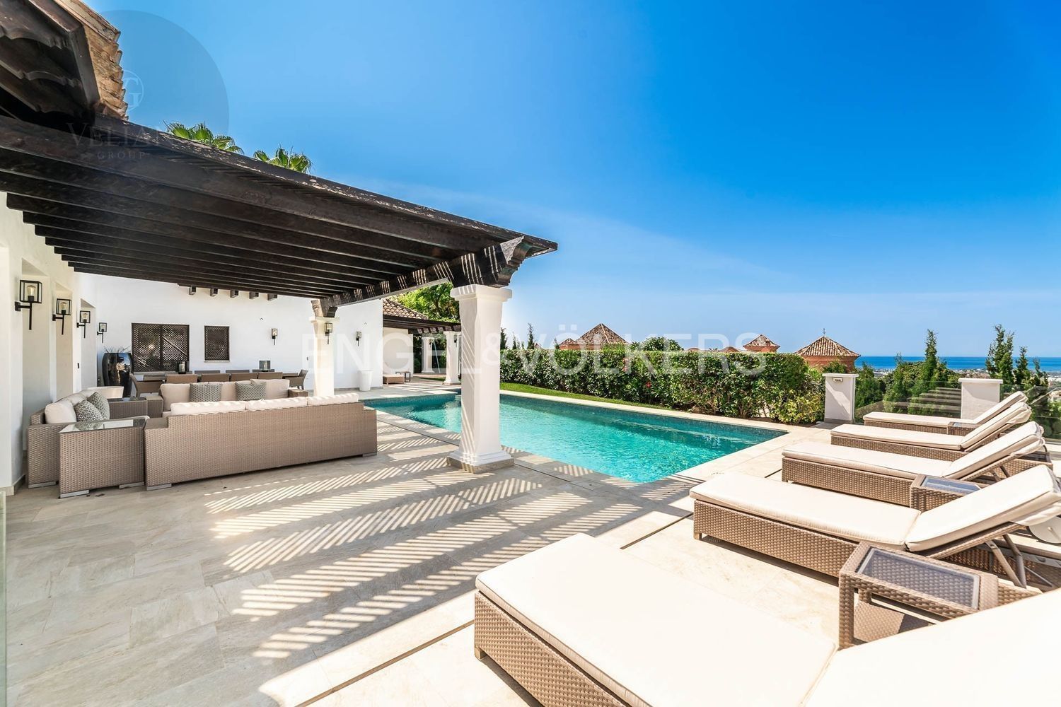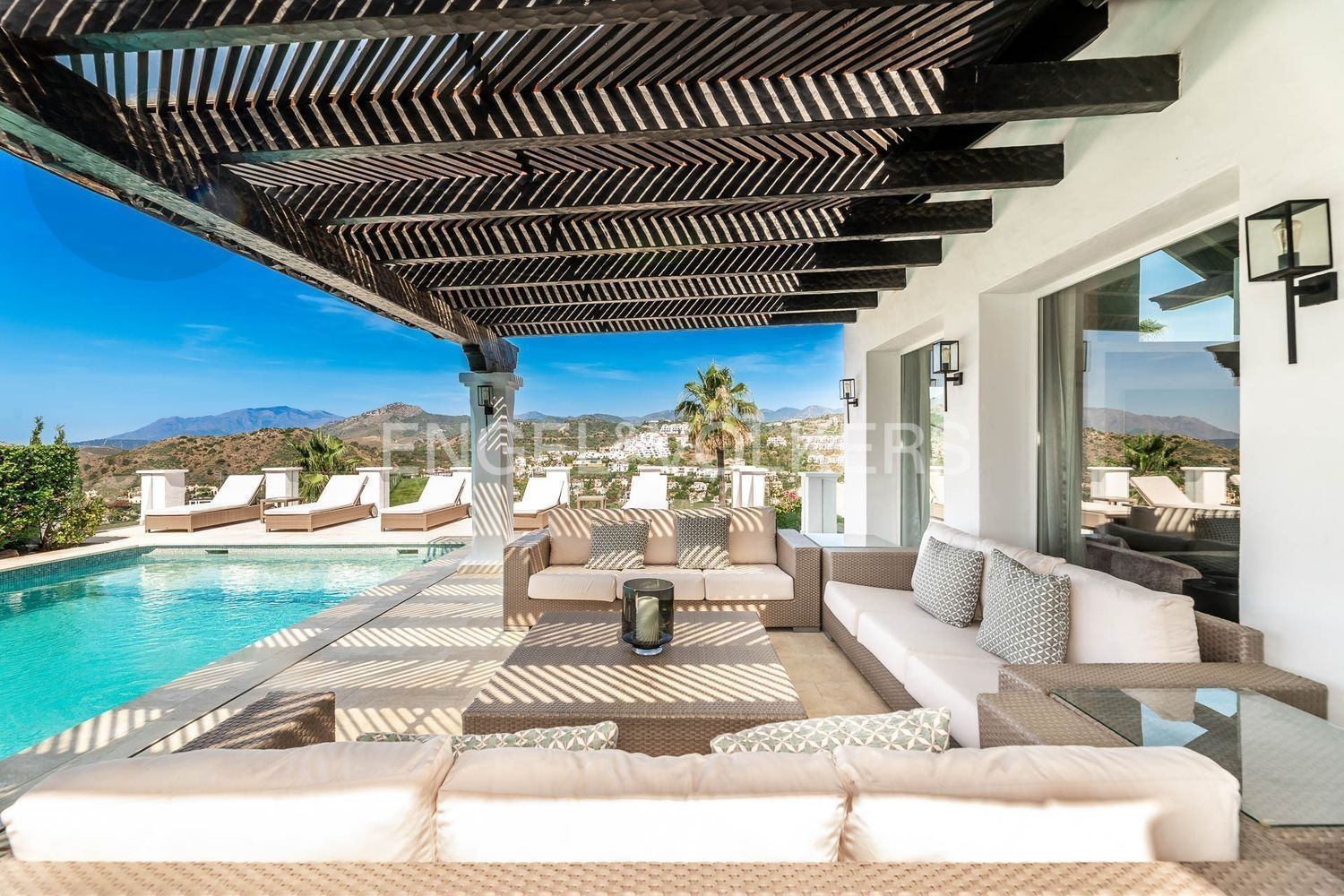 Ubicada en un tranquilo callejón sin salida en la prestigiosa zona de La Quinta, esta impresionante villa de estilo andaluz combina sin esfuerzo el encanto tradicional con el lujo moderno. Con impresionantes vistas al mar, las montañas, el campo de golf y el campo andaluz, esta excepcional casa familiar ofrece privacidad, elegancia y un ambiente cálido y acogedor.Al entrar, le da la bienvenida un majestuoso recibidor con un techo de doble altura que marca el tono del espacioso interior. El salón y comedor de planta abierta se inundan de luz natural a través de ventanas de suelo a techo, conectando perfectamente con la amplia terraza y la zona de la piscina privada, ideales para el entretenimiento al aire libre y la relajación.La cocina moderna está bien equipada y diseñada cuidadosamente tanto para funcionalidad como para estilo. La planta principal también cuenta con tres amplios dormitorios con baño en suite, cada uno con acceso a terrazas privadas. En la planta superior, la lujosa suite principal incluye un gran dormitorio, vestidor, elegante baño en suite y una terraza privada con vistas espectaculares.En el nivel inferior, un apartamento independiente para invitados —con entrada privada desde el jardín, dormitorio y baño en suite— ofrece total privacidad y comodidad para los visitantes.Con amplias zonas exteriores, un garaje cerrado para dos coches y espacio adicional para aparcamiento, esta casa es perfecta para una vida familiar cómoda y para recibir invitados. Una oportunidad única de poseer una propiedad serena y con encanto andaluz atemporal en una de las ubicaciones más codiciadas de la Costa del Sol.