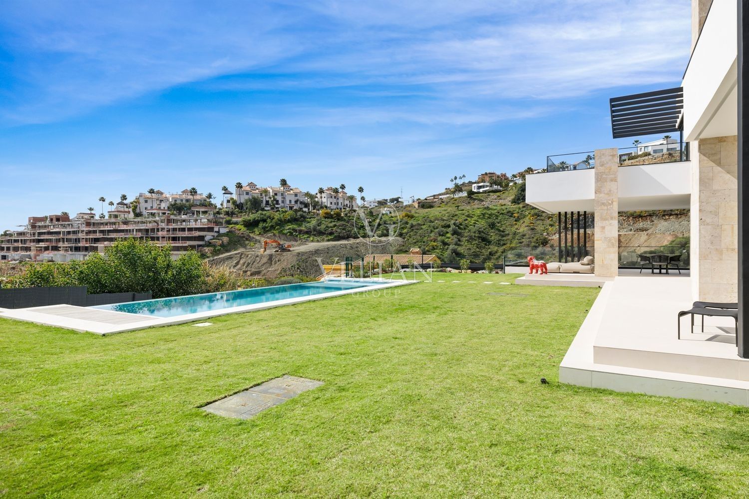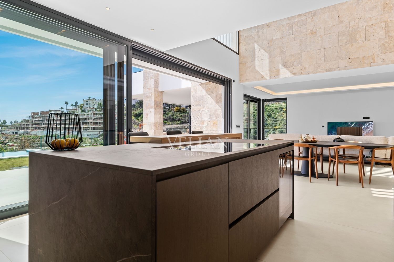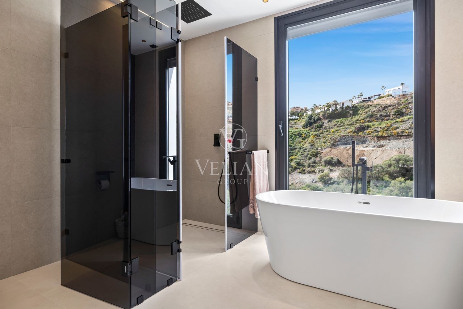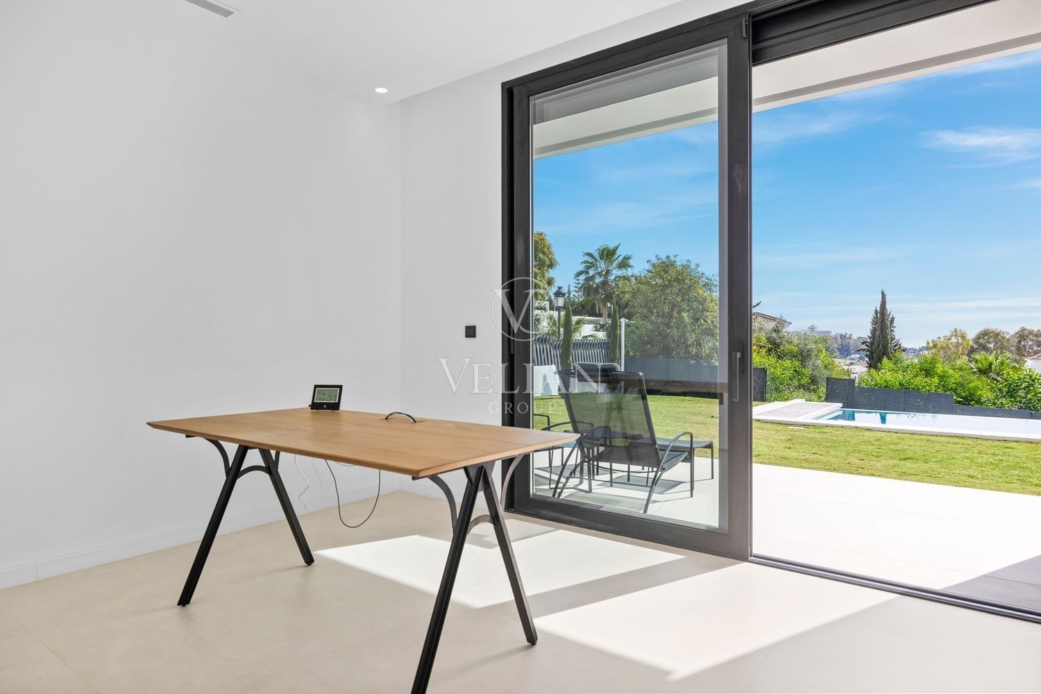 Villa contemporánea de alta calidad, de nueva construcción (2024), ubicada en la codiciada zona residencial de La Alquería, Benahavís. Orientada de sur a oeste, con vistas a las montañas y algunas vistas al mar desde la planta superior. Privada y tranquila. Cerca de todos los servicios, a 10 minutos en coche de la playa y del centro de San Pedro.Planta principal: Recibidor, amplio salón-comedor con techos altos y cocina abierta totalmente equipada de Modul Nova con electrodomésticos Miele. Lavadero independiente, aseo de invitados y un dormitorio de invitados con baño en suite.Acceso directo desde el salón a las terrazas cubiertas y descubiertas, al jardín y a la piscina privada.Planta superior: Dormitorio principal con baño en suite y vestidor y dos dormitorios de invitados con baño en suite. Acceso a terrazas con vistas parciales al mar.Planta inferior: Gran salón polivalente, otro aseo de invitados, trastero y garaje para dos coches.Jardín privado y piscina climatizada de agua salada. Junto al garaje hay una cochera cubierta para dos coches. Construida con las mejores calidades y con certificado energético A.Aire acondicionado Airzone con calefacción, suelo radiante en toda la vivienda, 20 paneles solares, ascensor a las 3 plantas y cargador eléctrico en el garaje.Los muebles no están incluidos, pero son negociables.