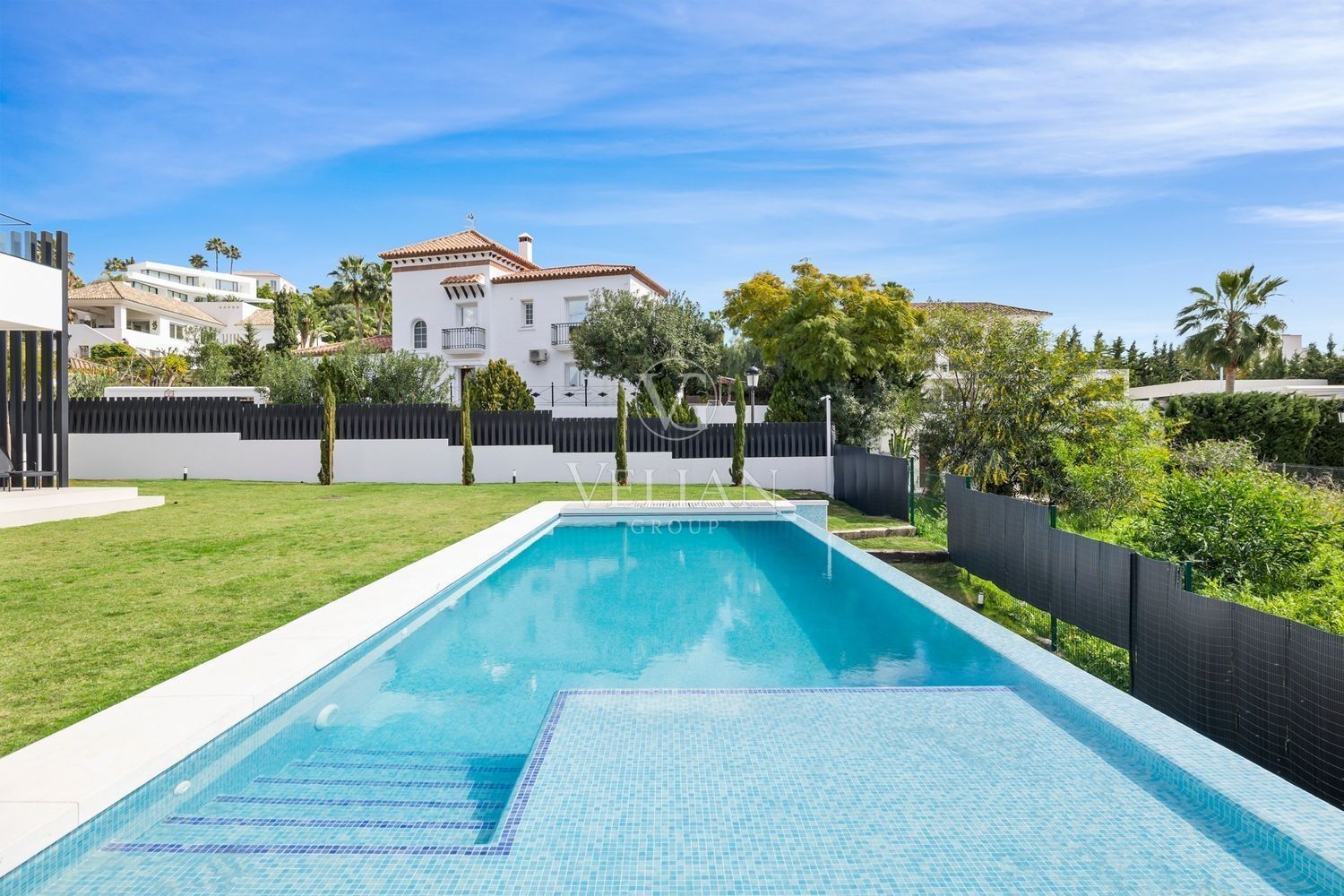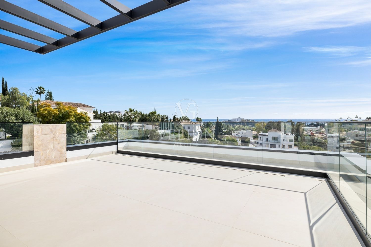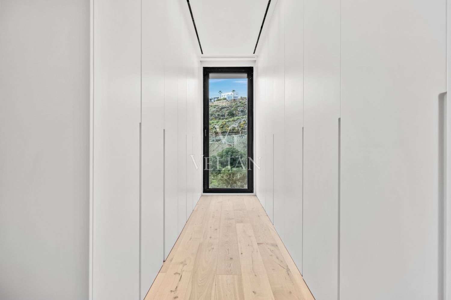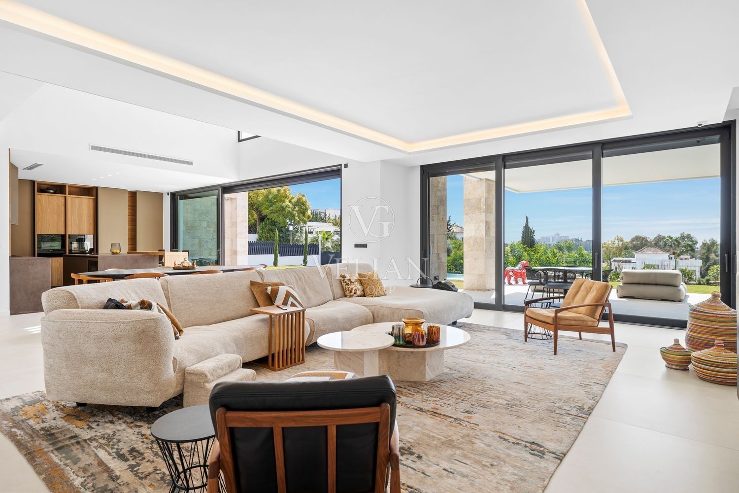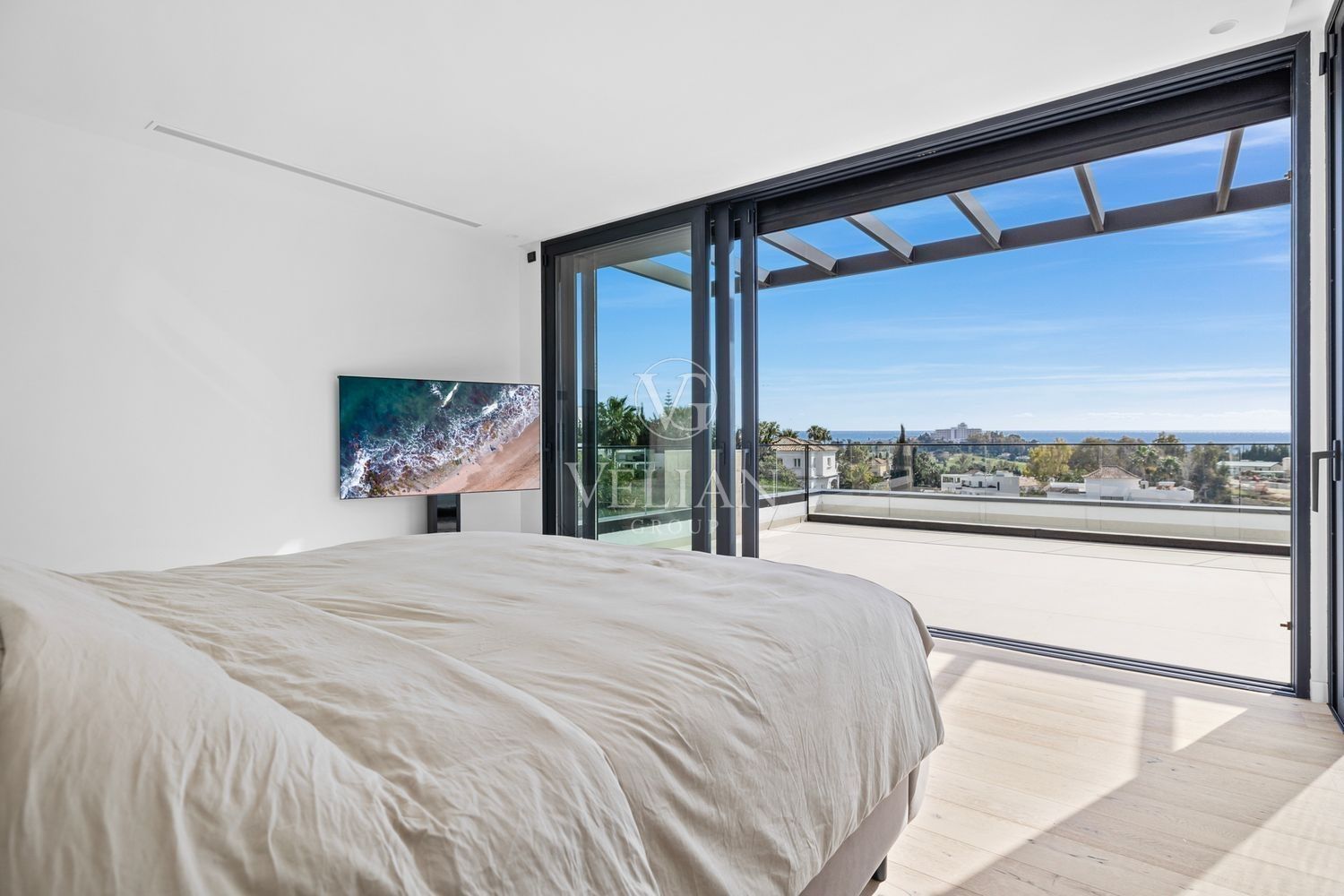 Villa contemporánea de alta calidad, de nueva construcción (2024), ubicada en la codiciada zona residencial de La Alquería, Benahavís. Orientada de sur a oeste, con vistas a las montañas y algunas vistas al mar desde la planta superior. Privada y tranquila. Cerca de todos los servicios, a 10 minutos en coche de la playa y del centro de San Pedro.Planta principal: Recibidor, amplio salón-comedor con techos altos y cocina abierta totalmente equipada de Modul Nova con electrodomésticos Miele. Lavadero independiente, aseo de invitados y un dormitorio de invitados con baño en suite.Acceso directo desde el salón a las terrazas cubiertas y descubiertas, al jardín y a la piscina privada.Planta superior: Dormitorio principal con baño en suite y vestidor y dos dormitorios de invitados con baño en suite. Acceso a terrazas con vistas parciales al mar.Planta inferior: Gran salón polivalente, otro aseo de invitados, trastero y garaje para dos coches.Jardín privado y piscina climatizada de agua salada. Junto al garaje hay una cochera cubierta para dos coches. Construida con las mejores calidades y con certificado energético A.Aire acondicionado Airzone con calefacción, suelo radiante en toda la vivienda, 20 paneles solares, ascensor a las 3 plantas y cargador eléctrico en el garaje.Los muebles no están incluidos, pero son negociables.