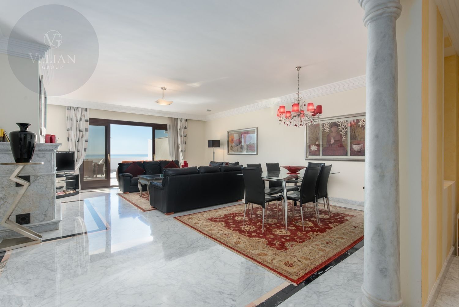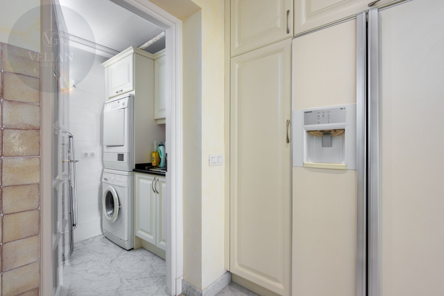 Amplio apartamento en primera planta con vistas panorámicas al mar, tres dormitorios dobles con baño, un gran salón, cocina independiente y lavadero, así como una gran terraza. Céntricamente situado en una urbanización de alta gama a poca distancia de las comodidades del casco antiguo de Marbella, en una de las mejores zonas de la Costa del Sol, el apartamento cuenta con impresionantes vistas, y habitaciones de gran tamaño en todo.La propiedad está decorada de forma clásica y consta de un amplio salón con chimenea, así como tres dormitorios dobles, cada uno con su propio cuarto de baño; incluyendo la suite de los propietarios que ofrece vistas al mar y acceso directo a la terraza, así como un cuarto de baño de gran tamaño con bañera de hidromasaje, lavabos dobles y una cabina de ducha, así como un vestidor. Hay una cocina totalmente equipada con electrodomésticos Siemens, una nevera americana doble, y un lavadero independiente con su propia terraza pequeña.Hay un sistema de calefacción por suelo radiante de seis zonas, así como aire acondicionado en todas partes. La propiedad se vende junto con dos grandes plazas de aparcamiento subterráneo y un gran trastero privado al que se accede por escaleras y ascensor.Al igual que muchas propiedades construidas en Marbella a principios de la década de 2000, el complejo no tiene Licencia de Primera Ocupación. Si bien esto no es raro, es algo que usted debe tener en cuenta como comprador. Sin embargo, tiene un certificado de no infracción urbanística que ha sido recientemente emitido por el Ayuntamiento de Marbella.Un sustancial y muy bien situado apartamento de lujo de tres dormitorios con excelentes vistas y fácil acceso a todos los servicios. Se recomienda visitarlo.