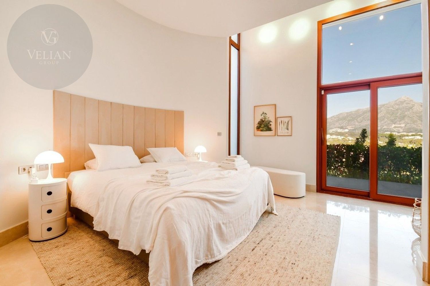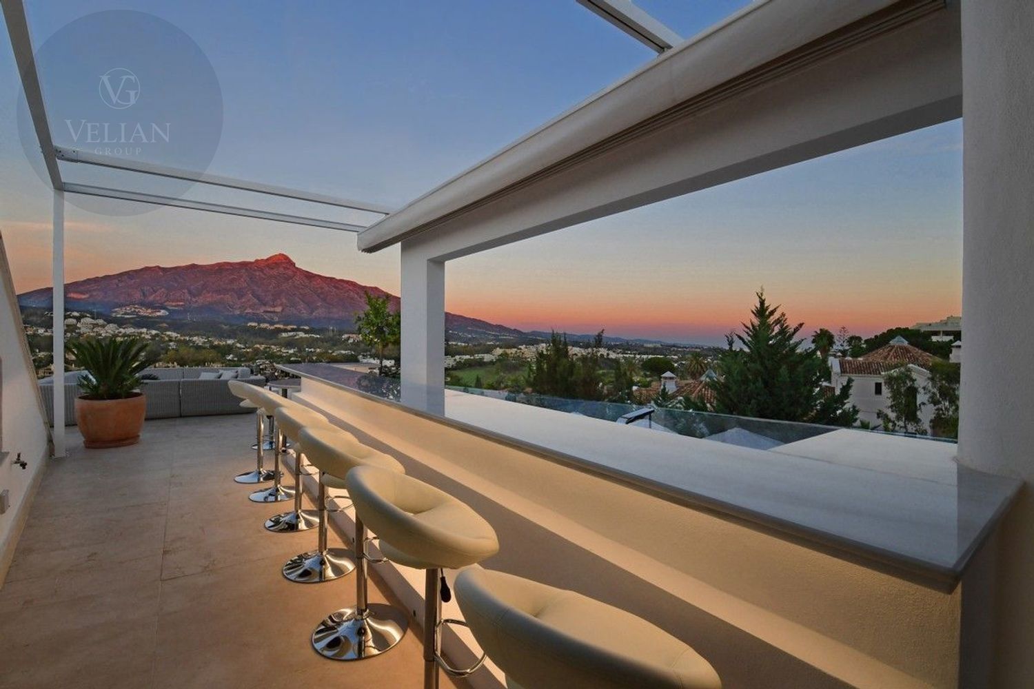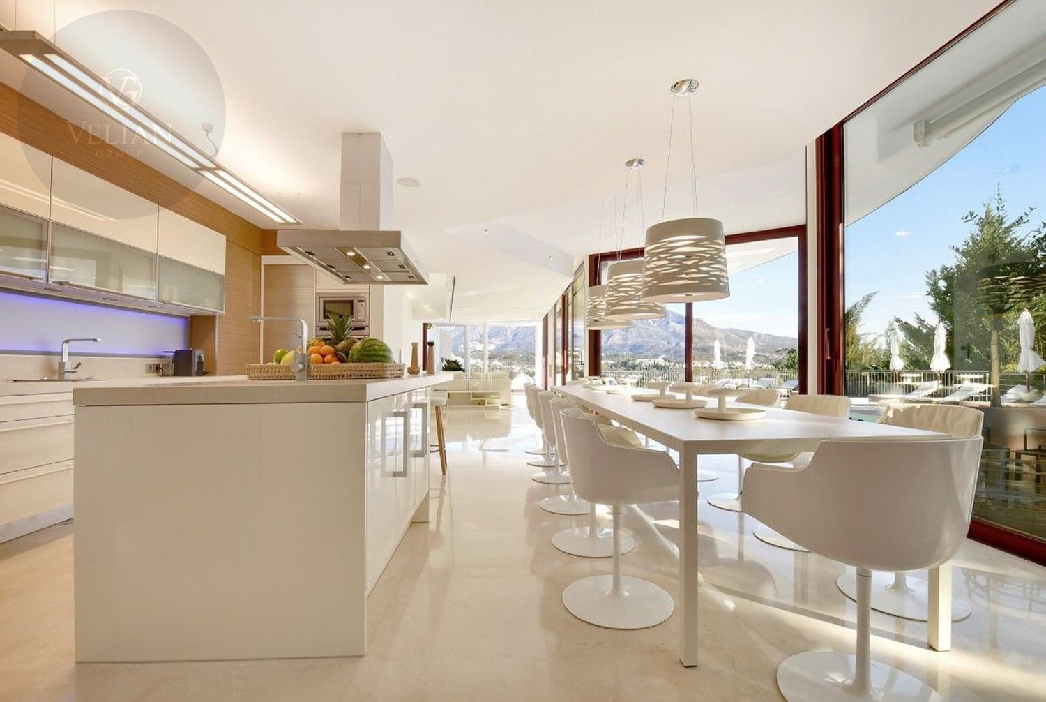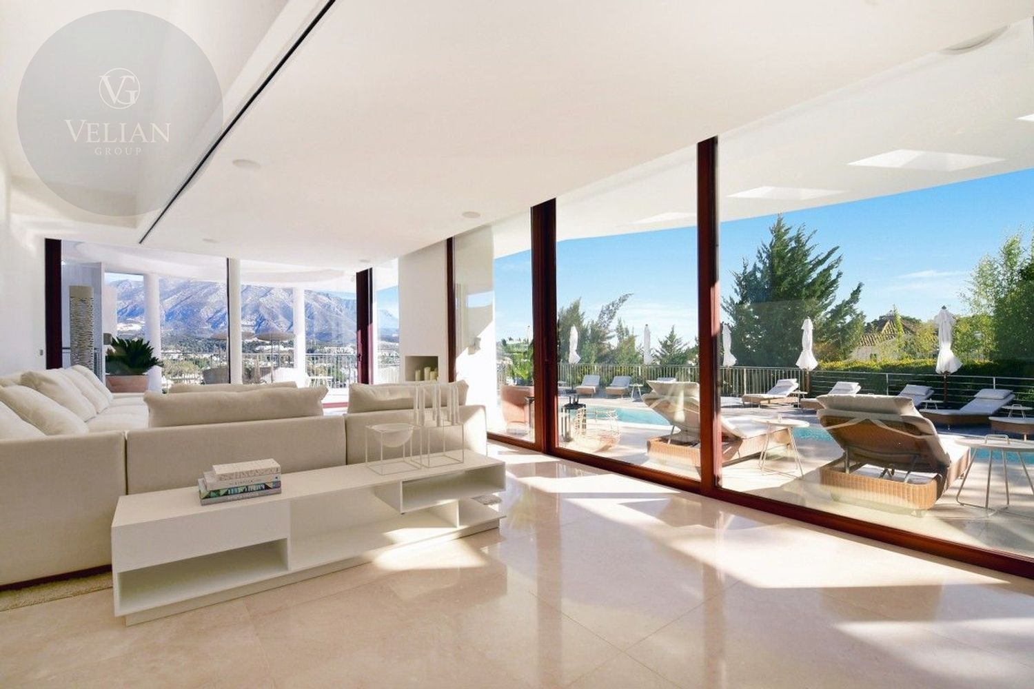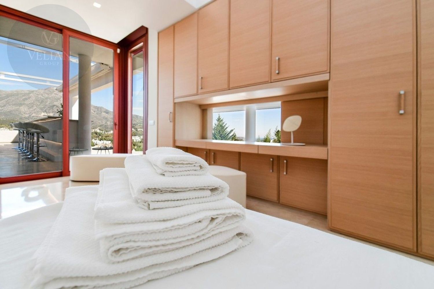 Magnífica villa contemporánea con impresionantes vistas a la Montaña de la Concha y al Valle del Golf de Nueva Andalucía. Se trata de una villa diseñada por el prestigioso arquitecto Angel Taboada y construida con los más elevados estándares de calidad. La entrada principal y el salón destacan por su luminosidad debida a sus grandes ventanales que a su vez brindan unas vistas espectaculares a las montañas y a los campos de golf de Nueva Andalucía a través de la amplia zona de piscina de estilo escandinavo tipo “infinity” con jacuzzi. Esta villa está dotada de una espectacular cocina de la marca Poggenpohl completamente equipada y con un comedor para 16 comensales. Además, disponemos de una segunda cocina auxiliar y un lavadero. En la planta alta se encuentran dos dormitorios principales con sendos baños “en suite” impresionantes con acceso directo al bar y a la zona del lounge con nuevamente impresionantes vistas al valle, a la montaña y al Mar Mediterráneo. En la planta baja se ubican otros 5 dormitorios con 6 camas king-size y 4 baños cuartos de baño completos en suite. Todos ellos con acceso a través de una escalera independiente a la terraza y a la zona de piscina. Por ello, estos 7 dormitorios, con capacidad para 16 personas, disponen de una gran privacidad. Finalmente, esta villa dispone de un gimnasio exterior y una zona de lounge, un home-cinema con todas las comodidades y una mesa de billar/snooker. Características adicionales: Iluminación LED (interior/exterior), sistema SONOS-surround y DOMOTICA en todos los dormitorios. Sistema de alarma, suelo radiante por toda la casa, un bar con 2 neveras, congeladores, refrigerador de vino, máquina de hielo, grifo de agua potable y una plancha Teppanyaki. La casa brinda un diseño único e incluye una azotea con solarium y un Jacuzzi de 8 plazas.En resumen: Una Villa contemporánea situada en el corazón de Nueva Andalucía con impresionantes vistas al Valle del Golf, a la montaña de La Concha y al Mar Mediterráneo, con un diseño y unas calidades únicas y exclusivas.