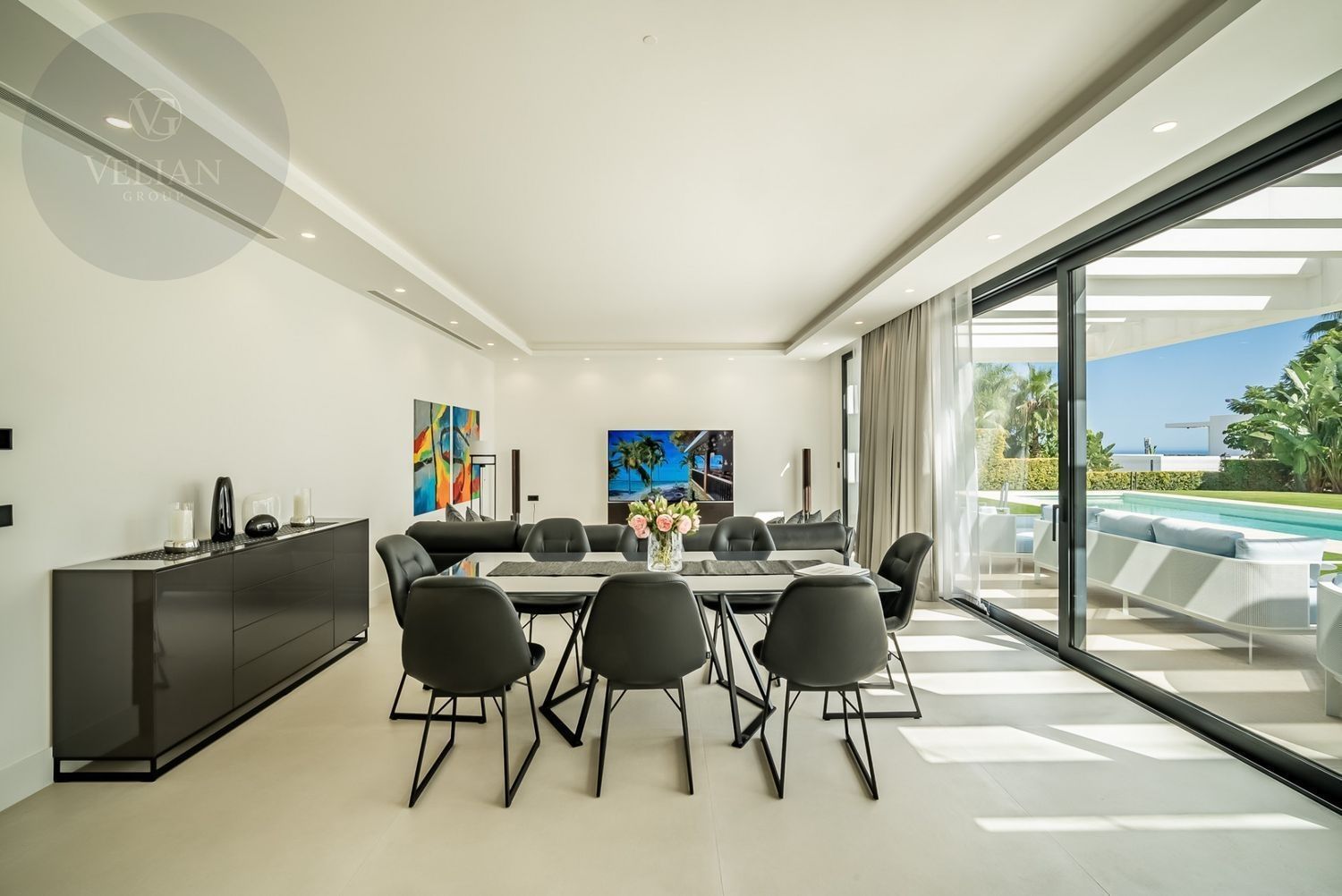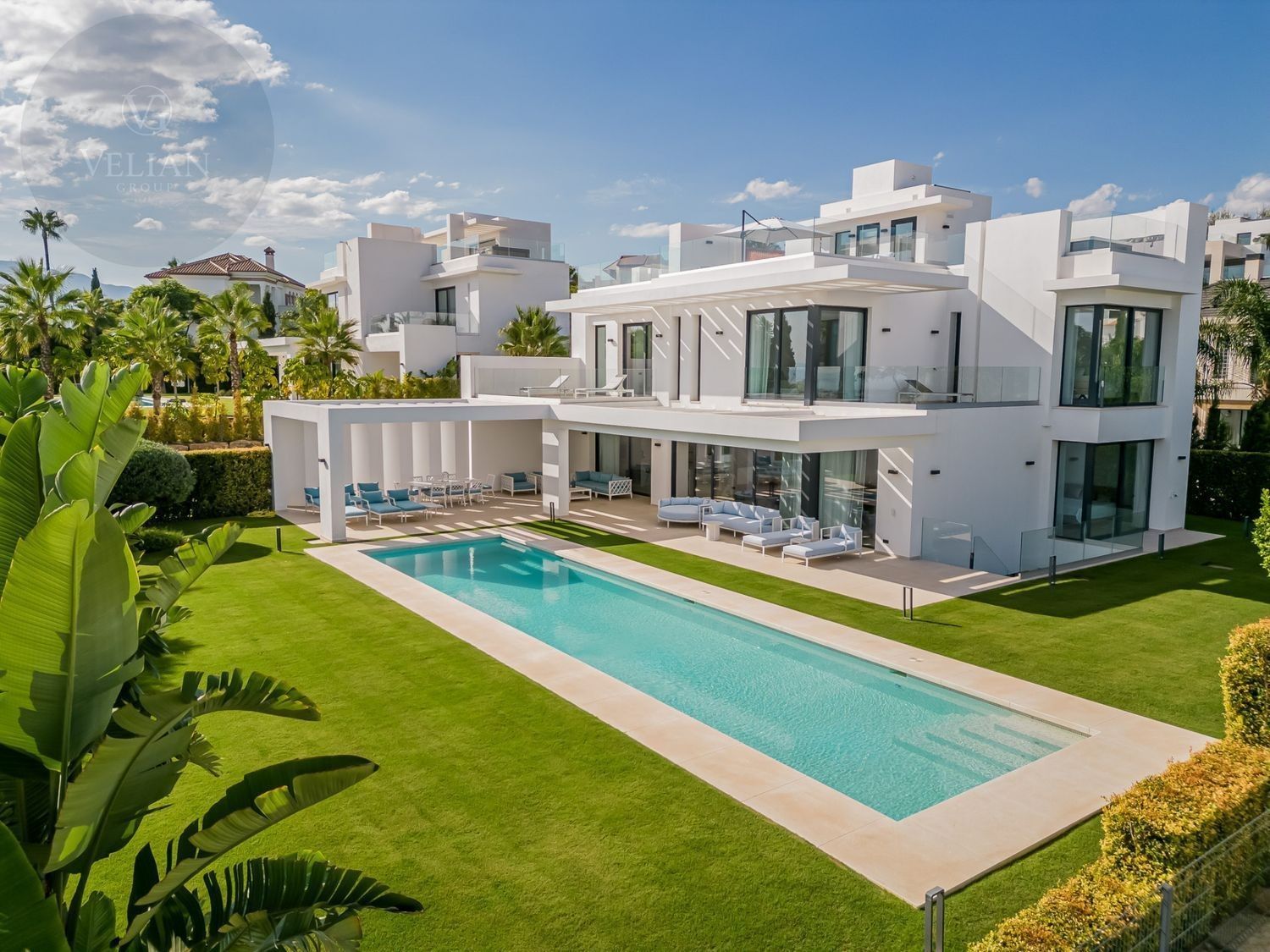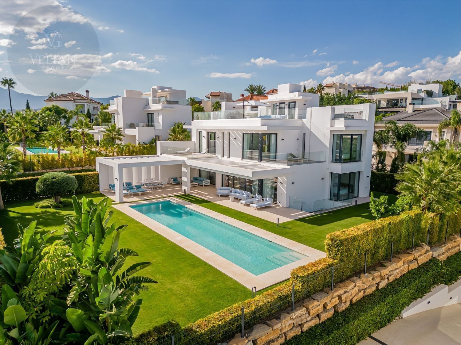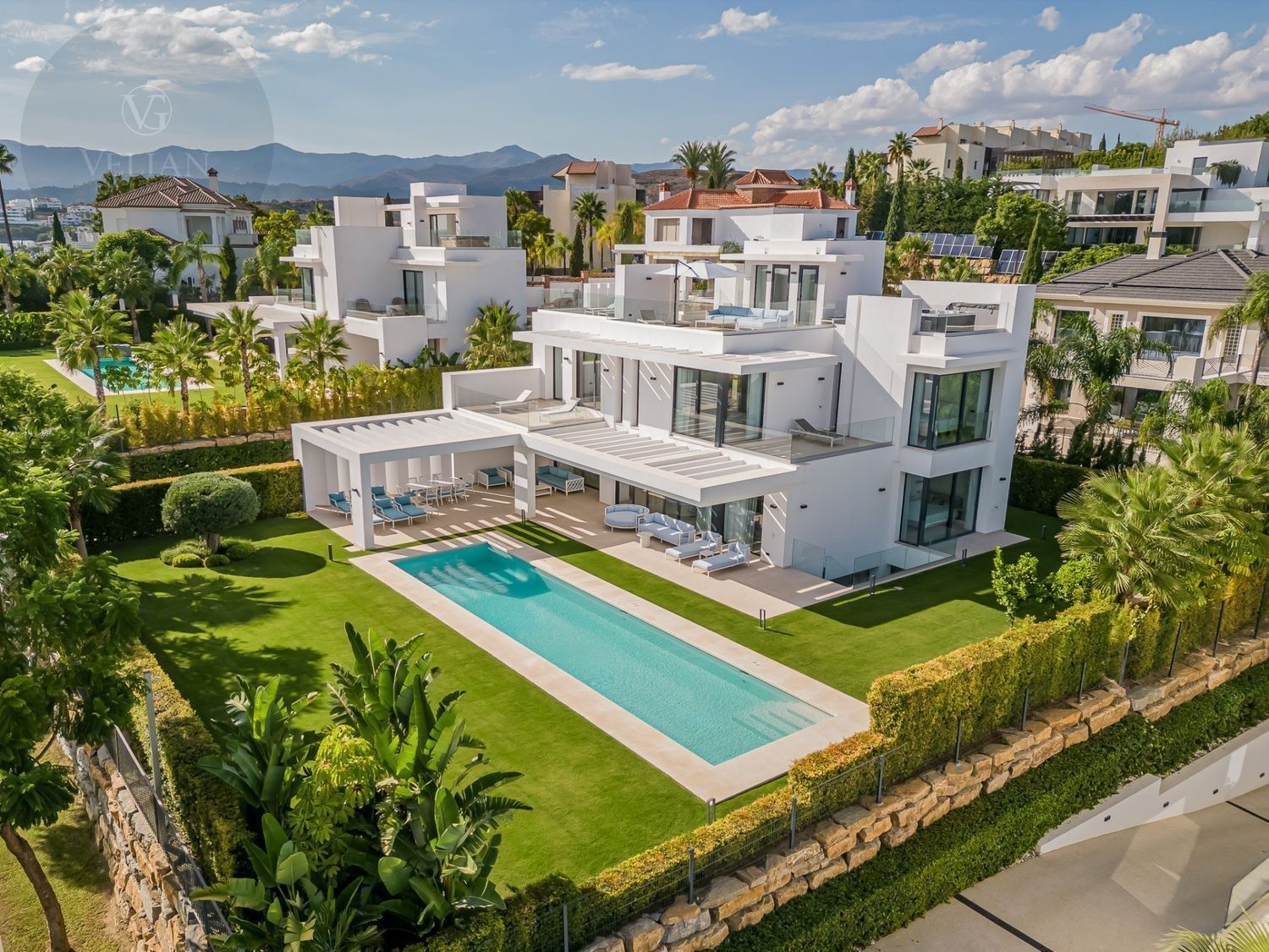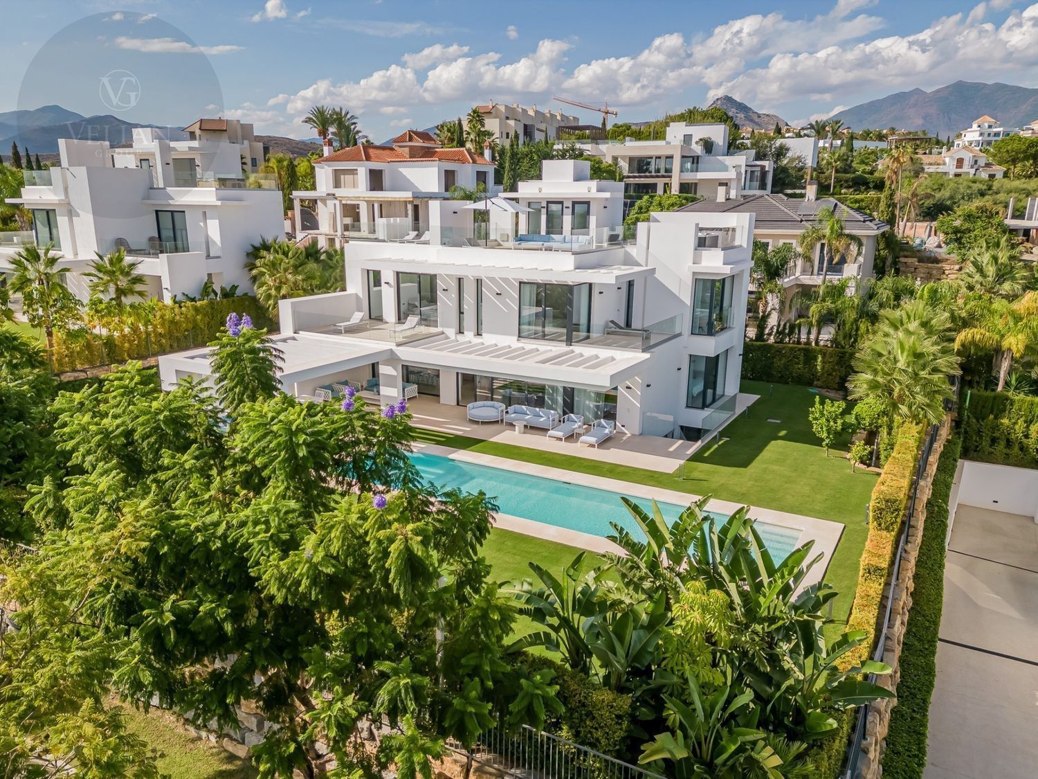 Esta villa en Los Flamingos, Benahavís,está diseñada para ofrecer el máximo confort y estilo. Orientada al sur, ofrece impresionantes vistas al mar, la montaña, la piscina y el jardín, proporcionando un refugio tranquilo y lujoso. Las modernas comodidades de la villa y su sofisticado diseño crean un armonioso equilibrio de elegancia y relajación. Ubicación:Enclavada dentro del prestigioso complejo de golf Los Flamingos, esta villa goza de una ubicación ideal para los entusiastas del golf, con fácil acceso a renombrados campos de golf como Guadalmina, El Paraíso Golf Club y Atalaya Golf & Country Club. A un corto trayecto en coche, encontrará hermosas playas como la Playa del Saladillo y la Playa de Guadalmina, así como populares lugares para comer como La Antigua y el Restaurante El Coto. Para las familias, colegios internacionales como The British School of Marbella y Atalaya International School están cerca. Disfrute de las compras en el Centro Comercial Laguna Village y El Corte Inglés, que ofrecen lo mejor del ocio y la comodidad. Distribución: En la planta principal, disfrute de amplias zonas de estar de planta abierta que conectan a la perfección con la terraza de la piscina, llevando las vistas del Mediterráneo hasta su hogar. La primera planta cuenta con una suite principal con terraza privada, junto con otros dos dormitorios en suite. Suba a la terraza de la azotea para disfrutar de vistas ininterrumpidas al mar que se extienden hasta Marbella, La Concha, Marruecos y Gibraltar. El sótano ofrece un lujoso santuario con un quinto dormitorio en suite y un spa de última generación, que incluye gimnasio, sauna finlandesa, sala de vapor, ducha y aseo, con acceso independiente a la piscina a través de una escalera privada. La villa cuenta con una piscina privada rodeada de exuberantes jardines, un solárium con jacuzzi para la máxima relajación y un amplio garaje para al menos 4 coches. Segura y privada, la villa forma parte de una comunidad cerrada con seguridad 24 horas, lo que garantiza su tranquilidad.Materiales: Los acabados de alta calidad incluyen cocina equipada con Gaggenau, mientras que los acabados de alta calidad, como baldosas de cerámica en las zonas de estar y suelos de madera afelpada en los dormitorios, aire acondicionado y un sistema domótico para la comodidad moderna. La villa está equipada con Internet de fibra, video portero, alarma y circuito cerrado de televisión para mayor seguridad. Nuestra opinión: Esta villa en Los Flamingos es el epítome de la vida de lujo, ya que ofrece unas vistas impresionantes y las comodidades más modernas. Es una inversión excepcional para quienes buscan un estilo de vida sofisticado en una comunidad segura y prestigiosa.