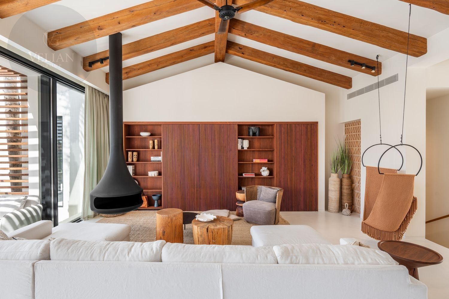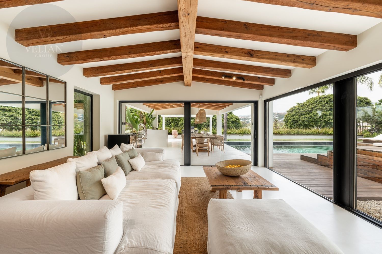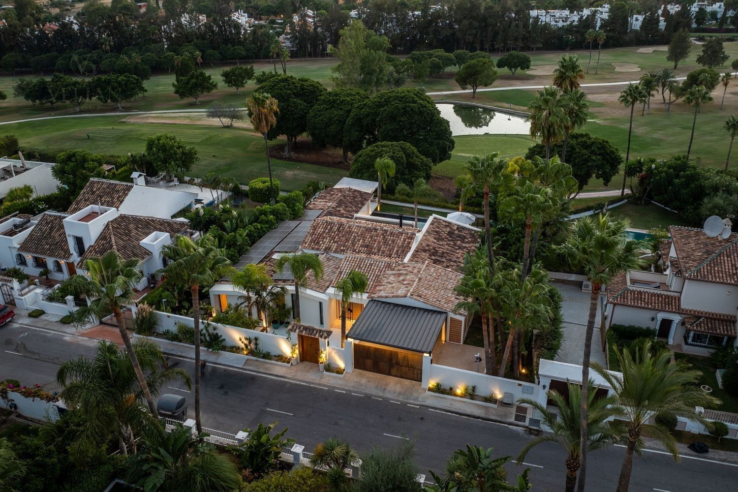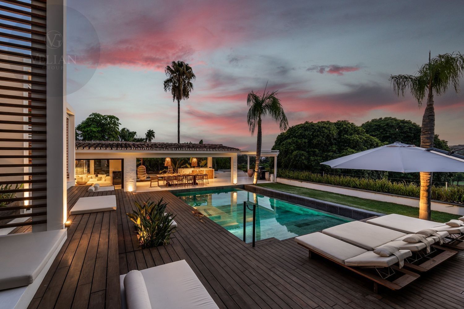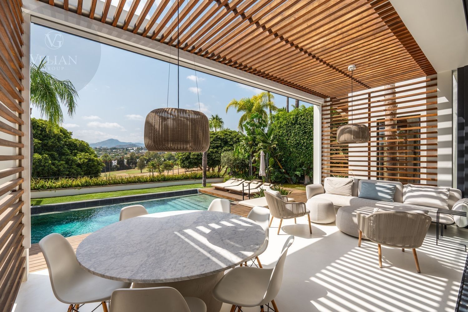 Ubicada en el corazón del Valle del Golf, Nueva Andalucía, conocida por sus destinos de golf de clase mundial, esta villa ofrece una posición privilegiada en primera línea en uno de los mejores campos de la zona. Situada en una exclusiva comunidad cerrada, la villa ofrece un refugio sereno y privado, rodeado por un muro de privacidad y exuberante vegetación. Es rústica y sofisticada, espaciosa y acogedora, cálida y aireada gracias a sus inmensas ventanas y techos altos. Combina cuidadosamente un encanto andaluz con un estilo contemporáneo, y materiales nobles con detalles artísticos.Toda la casa está diseñada para apreciar las vistas de las montañas, el campo de golf Los Naranjos y los exuberantes alrededores desde cualquier espacio. Esto es posible porque cuenta con inmensas ventanas, muchas de las cuales desaparecen en las paredes, creando un efecto de adentro hacia afuera que permite disfrutar simultáneamente de la casa y el paisaje. Esto comienza desde el momento en que entras: La puerta principal es de vidrio, por lo que desde la fachada se puede ver la vista del campo de golf y las montañas al otro lado.A la derecha de la puerta, hay un baño de recepción con una gran ventana hacia el exterior, amueblado con piezas de diseño que parecen obras de arte. En frente, una de las cinco amplias habitaciones que forman parte de esta casa. Desde los primeros pasos, se pueden identificar los hilos comunes en todos los espacios: techos altos a dos aguas con vigas de madera natural que le dan un ambiente acogedor. Los suelos de cemento pulido blanco crean un flujo continuo en toda la propiedad. Las ventanas en los baños permiten que el exterior entre en cada espacio mientras actúan como cortinas para preservar la privacidad.El vestíbulo de entrada conduce a la inmensa sala de estar, donde todo sucede. Su techo es tan alto que incluso hay una hamaca colgante. Hay espacio para todo, incluida una cocina de espacio abierto con una barra para conversaciones inolvidables. Un área de comedor y una sala de estar cómoda son calentadas por una chimenea flotante y un área de TV. La sala de estar se fusiona con la terraza exterior, que tiene un área sombreada para disfrutar de las vistas en cualquier momento del día. Además, se puede ver la piscina de desbordamiento de piedra con amplios escalones que invitan a sumergirse en la primera línea del campo de golf o a ver el atardecer desde el agua.Desde la sala de estar, una amplia puerta de madera conduce al área privada de la suite principal. Cuenta con un baño cómodo con bañera y una zona de ducha acristalada. Ofrece vistas de la exuberante vegetación, lavabos dobles y una combinación artística de materiales con una alfombra distintiva. El vestidor acristalado define sutilmente el espacio sin comprometer el flujo de la habitación ni la luz natural. El área del dormitorio es espaciosa, con vistas al parque y las montañas, y esconde un secreto perfecto para las familias: un rincón con puertas de ratán donde los niños pueden crear su propia casa en miniatura.En el lado opuesto de la sala de estar, hay dos dormitorios en suite más conectados a la segunda sala de estar, un espacio con la comodidad de un salón, muebles perfectos y paredes completamente abiertas al jardín. El espacio exterior es un capítulo propio, con lugares ideales para disfrutar sin fin. Junto a la piscina, una terraza de madera sube hacia la terraza, y algunos de los amplios escalones están cubiertos con cojines, transformándolos en tumbonas para relajarse. Además, el parque cuenta con una inmensa pérgola que alberga una cocina exterior con barbacoa y una gran mesa para reuniones inolvidables. A solo unos pasos, un jacuzzi invita a relajarse bajo las estrellas.De vuelta al interior, el sótano queda por descubrir, albergando una gran lavandería, un baño, un dormitorio ventilado con vestidor y un baño completo acristalado, y uno de los espacios favoritos de la.