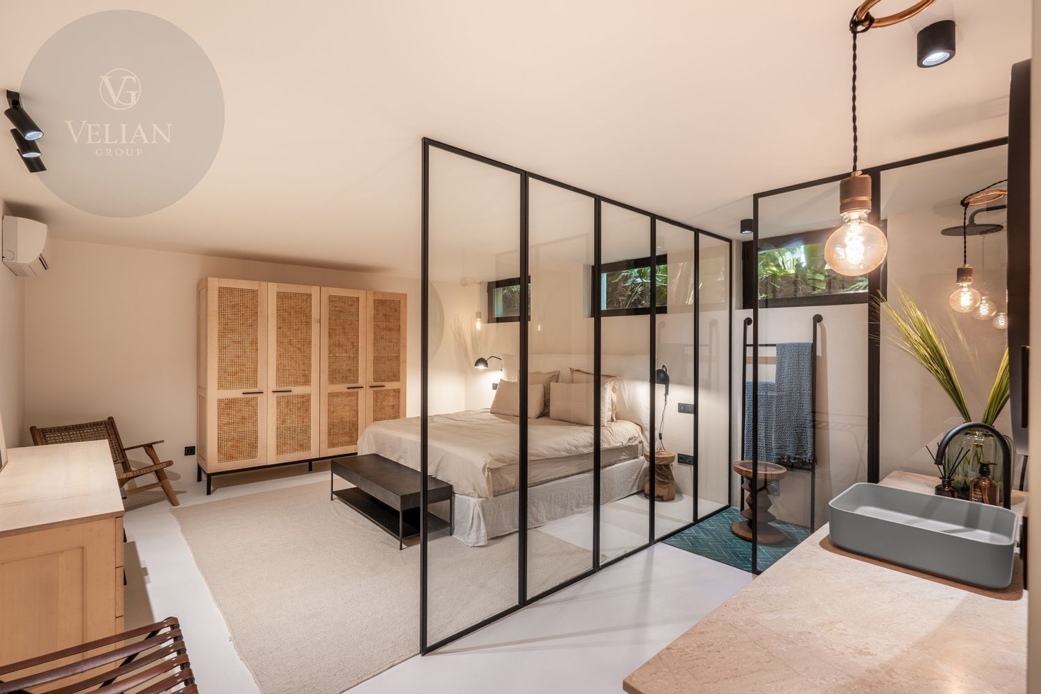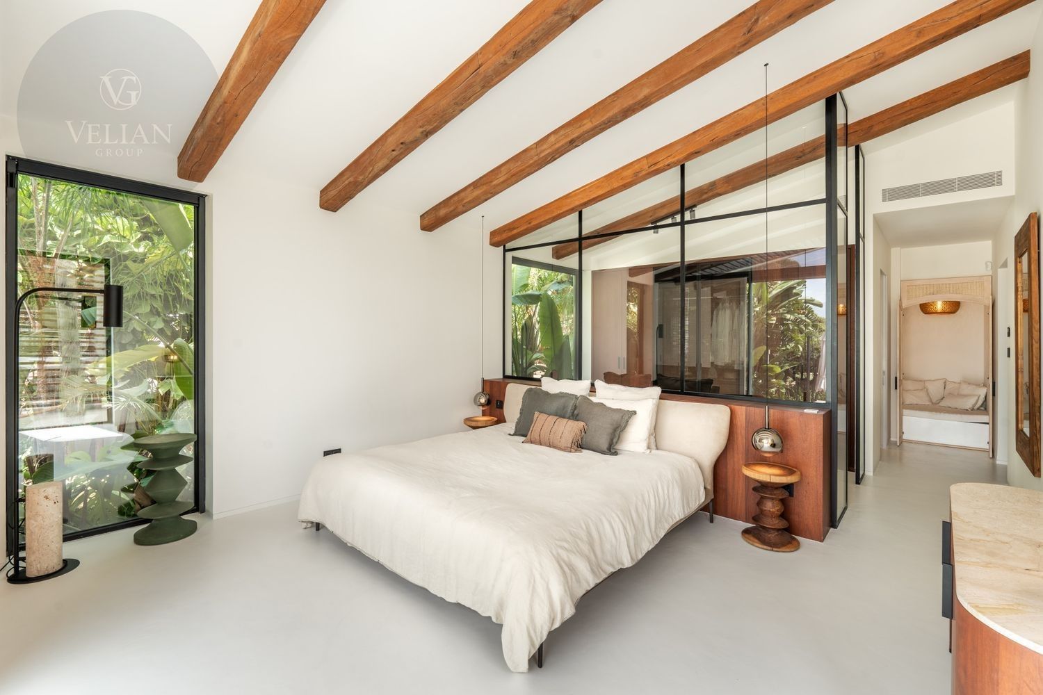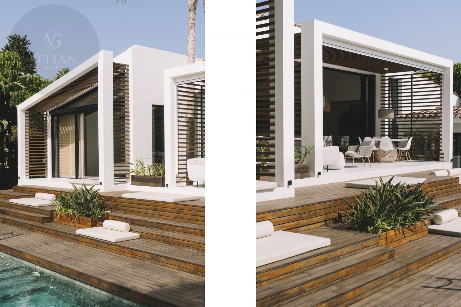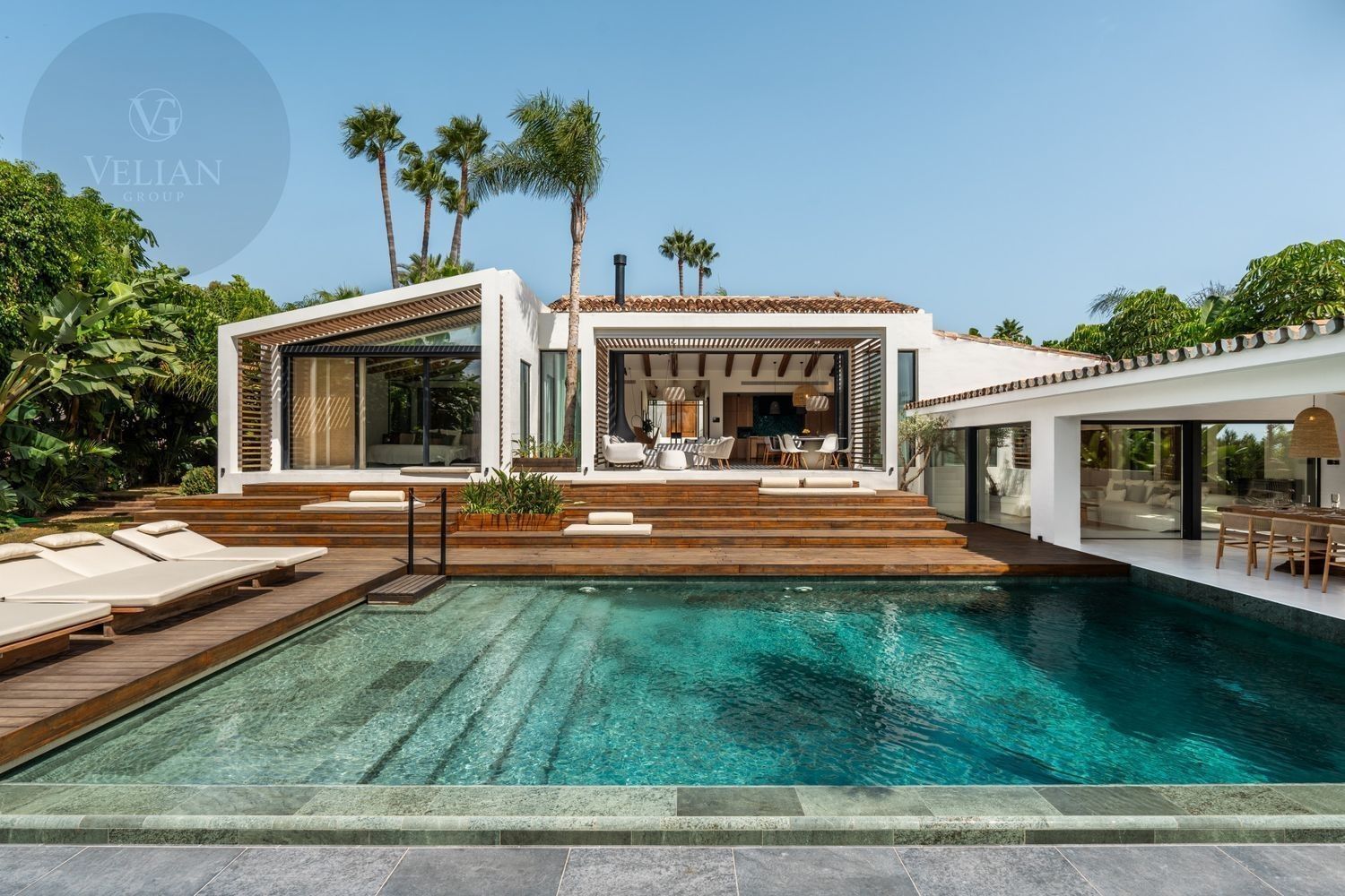 Ubicada en el corazón del Valle del Golf, Nueva Andalucía, conocida por sus destinos de golf de clase mundial, esta villa ofrece una posición privilegiada en primera línea en uno de los mejores campos de la zona. Situada en una exclusiva comunidad cerrada, la villa ofrece un refugio sereno y privado, rodeado por un muro de privacidad y exuberante vegetación. Es rústica y sofisticada, espaciosa y acogedora, cálida y aireada gracias a sus inmensas ventanas y techos altos. Combina cuidadosamente un encanto andaluz con un estilo contemporáneo, y materiales nobles con detalles artísticos.Toda la casa está diseñada para apreciar las vistas de las montañas, el campo de golf Los Naranjos y los exuberantes alrededores desde cualquier espacio. Esto es posible porque cuenta con inmensas ventanas, muchas de las cuales desaparecen en las paredes, creando un efecto de adentro hacia afuera que permite disfrutar simultáneamente de la casa y el paisaje. Esto comienza desde el momento en que entras: La puerta principal es de vidrio, por lo que desde la fachada se puede ver la vista del campo de golf y las montañas al otro lado.A la derecha de la puerta, hay un baño de recepción con una gran ventana hacia el exterior, amueblado con piezas de diseño que parecen obras de arte. En frente, una de las cinco amplias habitaciones que forman parte de esta casa. Desde los primeros pasos, se pueden identificar los hilos comunes en todos los espacios: techos altos a dos aguas con vigas de madera natural que le dan un ambiente acogedor. Los suelos de cemento pulido blanco crean un flujo continuo en toda la propiedad. Las ventanas en los baños permiten que el exterior entre en cada espacio mientras actúan como cortinas para preservar la privacidad.El vestíbulo de entrada conduce a la inmensa sala de estar, donde todo sucede. Su techo es tan alto que incluso hay una hamaca colgante. Hay espacio para todo, incluida una cocina de espacio abierto con una barra para conversaciones inolvidables. Un área de comedor y una sala de estar cómoda son calentadas por una chimenea flotante y un área de TV. La sala de estar se fusiona con la terraza exterior, que tiene un área sombreada para disfrutar de las vistas en cualquier momento del día. Además, se puede ver la piscina de desbordamiento de piedra con amplios escalones que invitan a sumergirse en la primera línea del campo de golf o a ver el atardecer desde el agua.Desde la sala de estar, una amplia puerta de madera conduce al área privada de la suite principal. Cuenta con un baño cómodo con bañera y una zona de ducha acristalada. Ofrece vistas de la exuberante vegetación, lavabos dobles y una combinación artística de materiales con una alfombra distintiva. El vestidor acristalado define sutilmente el espacio sin comprometer el flujo de la habitación ni la luz natural. El área del dormitorio es espaciosa, con vistas al parque y las montañas, y esconde un secreto perfecto para las familias: un rincón con puertas de ratán donde los niños pueden crear su propia casa en miniatura.En el lado opuesto de la sala de estar, hay dos dormitorios en suite más conectados a la segunda sala de estar, un espacio con la comodidad de un salón, muebles perfectos y paredes completamente abiertas al jardín. El espacio exterior es un capítulo propio, con lugares ideales para disfrutar sin fin. Junto a la piscina, una terraza de madera sube hacia la terraza, y algunos de los amplios escalones están cubiertos con cojines, transformándolos en tumbonas para relajarse. Además, el parque cuenta con una inmensa pérgola que alberga una cocina exterior con barbacoa y una gran mesa para reuniones inolvidables. A solo unos pasos, un jacuzzi invita a relajarse bajo las estrellas.De vuelta al interior, el sótano queda por descubrir, albergando una gran lavandería, un baño, un dormitorio ventilado con vestidor y un baño completo acristalado, y uno de los espacios favoritos de la.