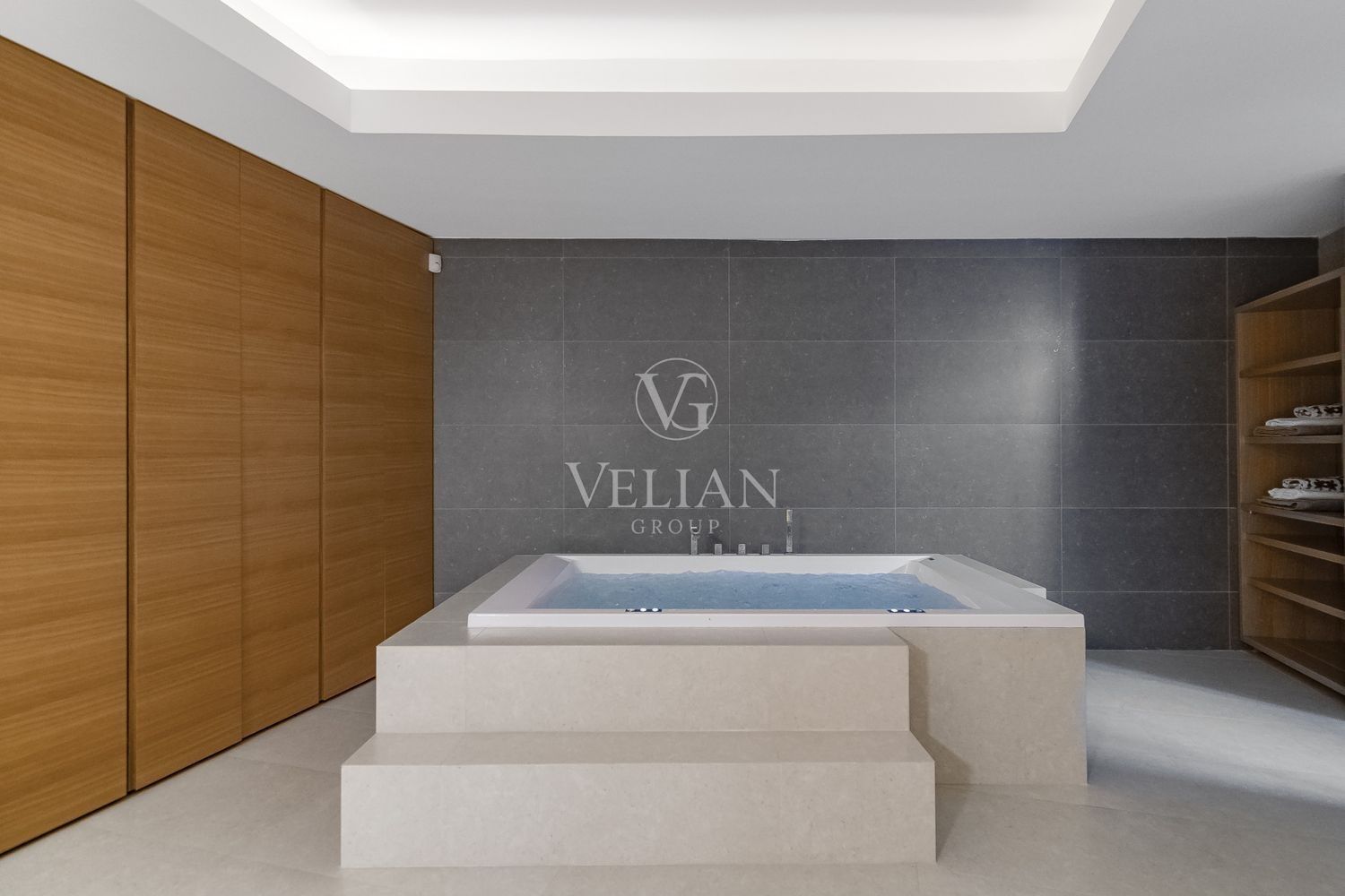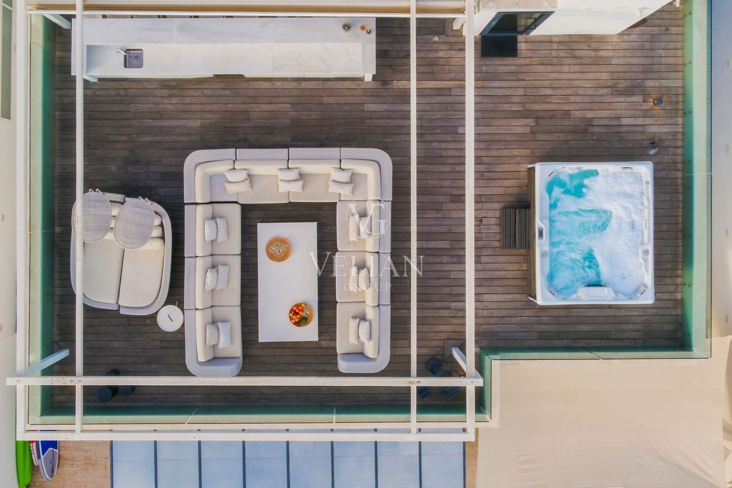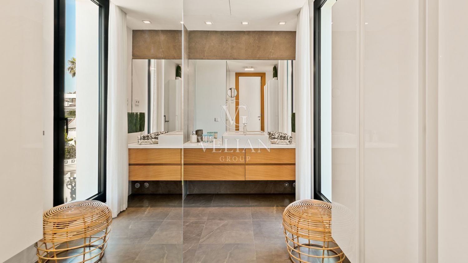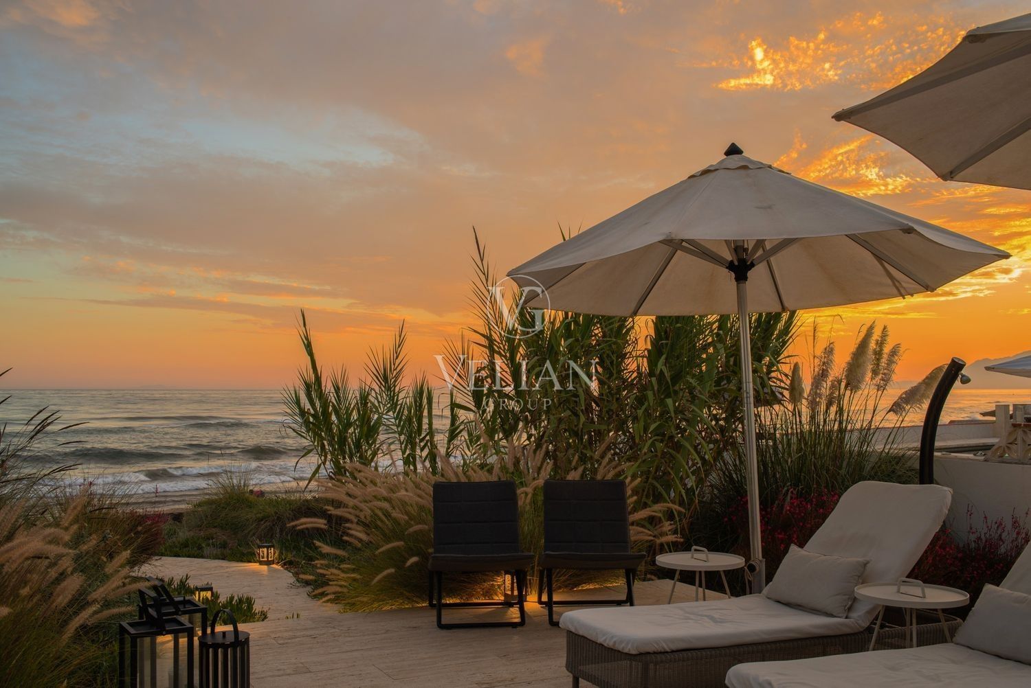 Una villa construida recientemente en primera línea de playa con las más altas calidades, mezclando el estilo contemporáneo con los detalles mediterráneos.Orientada al sur, la propiedad disfruta de incomparables vistas al mar y magníficas puestas de sol. El uso de madera, cristal, piedra y cemento ha creado una excelente casa familiar. La puerta de entrada se abre al amplio recibidor de doble altura, que conduce a una amplia sala de estar con comedor y una gran cocina abierta. También hay un dormitorio de invitados con armario y baño en-suite. Toda la propiedad es realmente luminosa gracias a sus puertas correderas con persianas de seguridad eléctrica. Fuera de la sala de estar, hay una terraza cubierta y la piscina climatizada. Un camino desde el área de la piscina conduce a través de las dunas de arena directamente a la playa. Lo mejor es que las dunas privadas ofrecen total privacidad aterrazas y su comedor exterior.Arriba, en el primer piso, encontraremos el dormitorio principal con dos juegos de armarios y baños principales. Hay otros dos dormitorios y un baño compartido con ducha, inodoro y lavabo. Cada habitación tiene acceso a la terraza superior, que ofrece vistas increíbles a la playa.En la azotea, hay una fabulosa terraza abierta con aparatos de gimnasia, una pérgola y un jacuzzi.Bajando las escaleras, en el sótano encontraremos dos dormitorios dobles con luz natural, armarios empotrados y una zona de Spa con bañera de hidromasaje, baño de vapor, sauna y duchas. Cada planta está comunicada por el ascensor privado.