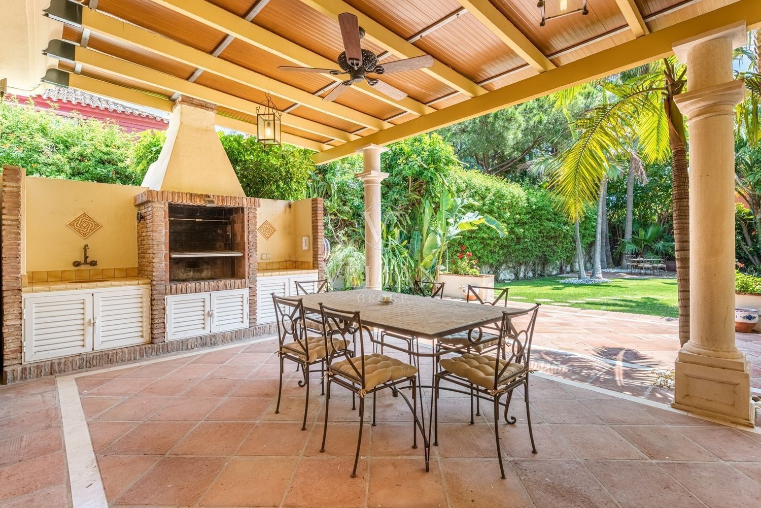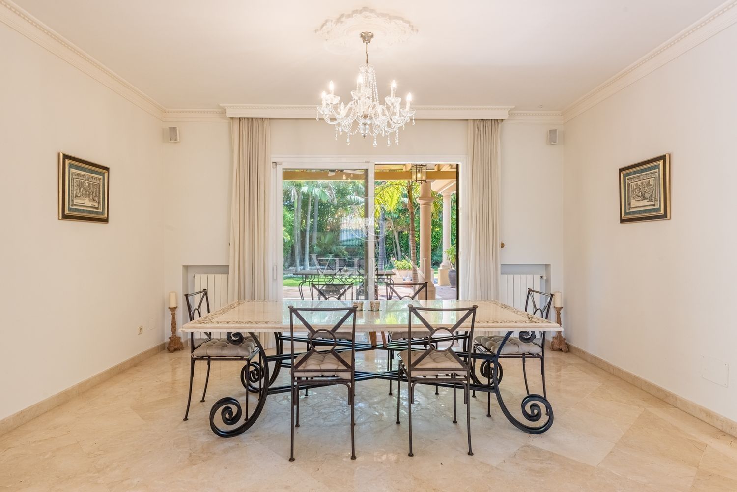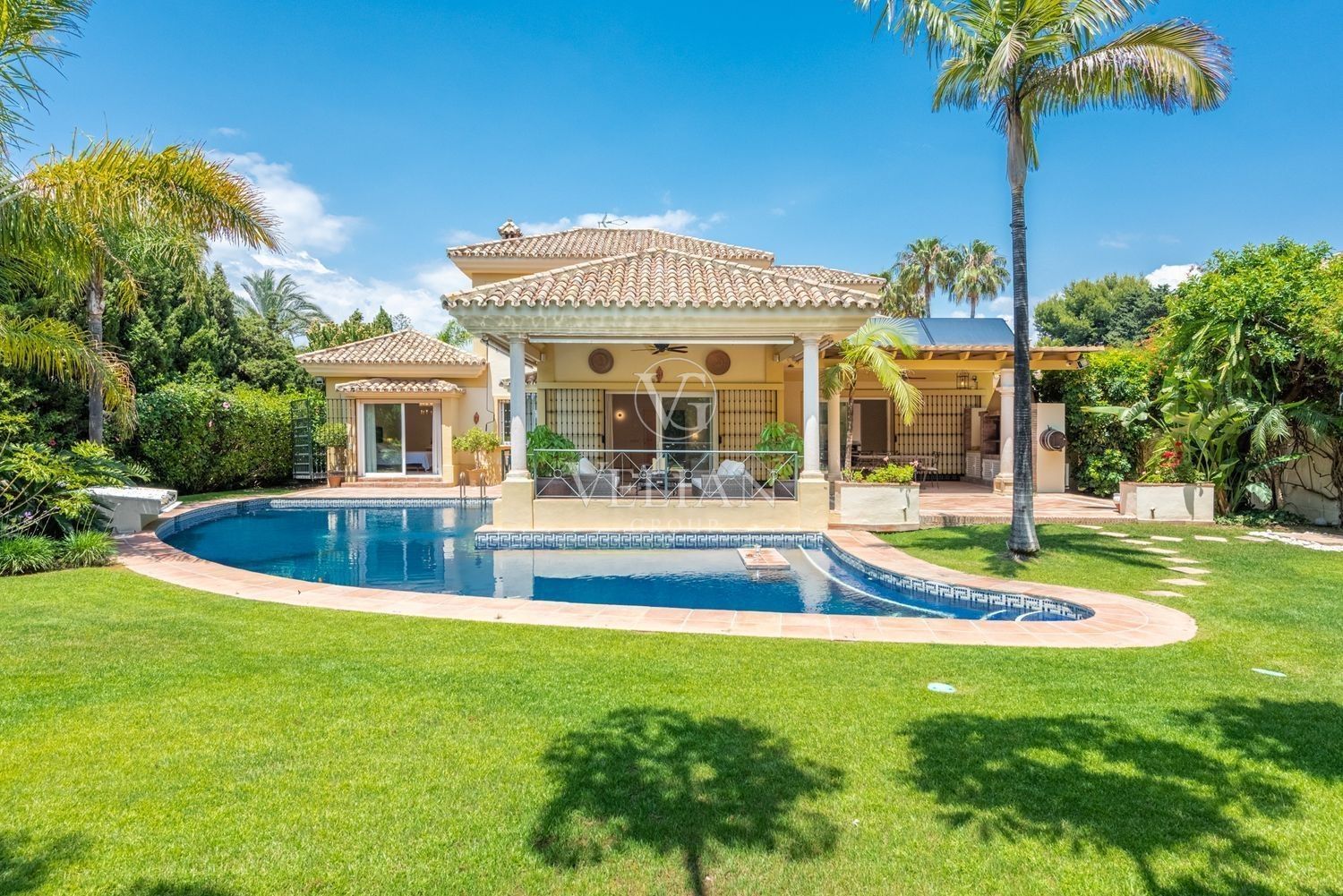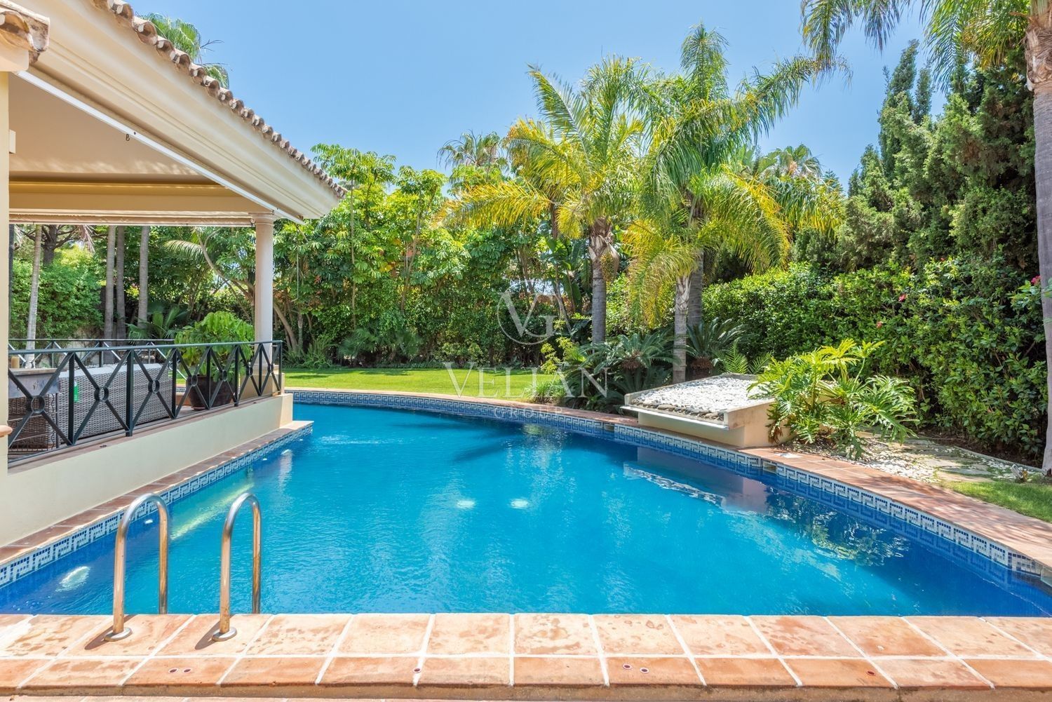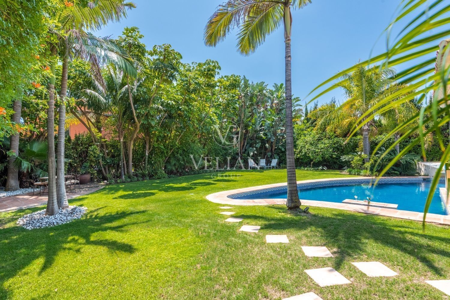 Elegante, luminosa y privada villa orientada al sur ubicada en la prestigiosa zona residencial de Casasola-Guadalmina Baja, en la Nueva Milla de Oro. Esta zona bien establecida es bien conocida por su discreción, lujosas villas y seguridad las 24 horas. Una propiedad elegante que emana un ambiente tranquilo rodeado de un jardín tropical bellamente diseñado y de bajo mantenimiento. Esta llamativa villa está a solo 300 metros del mar Mediterráneo, y a poca distancia a pie del legendario campo de golf de Guadalmina.La deslumbrante vivienda se ha construido sobre una parcela de 1.140m2 y ofrece una superficie construida de 664,47m2, distribuida en 3 plantas. La superficie construida de 664,47m2 tiene 497,62m2 de interior, 71,85m2 de terrazas cubiertas y descubiertas y 95m2 de piscina. Construida en 2001 por su propietario, que prestó especial atención a cada detalle, esta espaciosa propiedad ha sido construida y terminada con altos estándares de calidad. Esta en excelentes condiciones.Esta villa de 3 niveles y 5 dormitorios está rodeada por un magnífico jardín exuberante y privado, y ofrece una gran piscina privada ubicada alrededor de la propiedad, abrazando la villa, permitiéndole disfrutar de su belleza, así como de su frescura. La propiedad también tiene un garaje para 2 coches y espacio para 4.Al entrar en el espacioso vestíbulo de entrada, uno puede sentir inmediatamente la calma que irradia esta casa y apreciar el espléndido jardín tropical. Este exquisito vestíbulo de techo alto conduce a un gran salón amplio y luminoso que cuenta con un mar de luz natural. En el ala oeste, el gran salón da acceso a una cómoda sala de estar con una acogedora chimenea, para un poco más de calidez y relajación durante los días más fríos del año.En el ala este, la propiedad muestra un espacioso comedor que conecta directamente con una cocina abierta, recientemente renovada, y totalmente equipada con electrodomésticos de lujo Gaggenau, una amplia isla con cómodos taburetes, una despensa independiente y un área de lavandería. La lujosa cocina Siematic da acceso a una luminosa y acogedora terraza para desayunar y ofrece una entrada independiente para los empleados domésticos y acceso al dormitorio en suite para el servicio.El gran salón y el comedor tienen acceso directo a una soleada terraza cubierta orientada al sur, que muestra un comedor al aire libre, barbacoa y zonas de descanso. Puede disfrutar libremente del opulento e inmaculado jardín y de la piscina con la máxima privacidad. Junto a la piscina, bajo los árboles del jardín tropical, hay una zona para sentarse y mucho espacio para tomar el sol.Además, la planta principal presenta un amplio dormitorio principal con un gran vestidor privado y baño en suite con bañera de hidromasaje y ducha independiente. Esta suite también ofrece acceso directo a una gran terraza orientada al sur, a la tentadora piscina para un refrescante chapuzón matutino y al floreciente jardín soleado. Esta planta también incluye un aseo de invitados y un amplio dormitorio de invitados con baño en suite con bañera y ducha independiente.Una luminosa escalera de mármol con techo de doble altura nos lleva al primer piso donde disfrutamos de la villa de dos amplios dormitorios, ambos con baños en suite. Estas habitaciones voluminosas y cómodas comparten una gran terraza orientada al sur con vistas a la piscina y al frondoso jardín. Lugar ideal para leer, disfrutar del atardecer con una copa de vino y soñar despierto.Al bajar al sótano, tendrá mucho espacio para el entretenimiento, que incluye una sala de juegos, una sala de cine y un rincón de gimnasio donde disfrutará de la luz natural que entra por las ventanas de la piscina. Esta planta también está equipada con una amplia zona de almacenamiento.