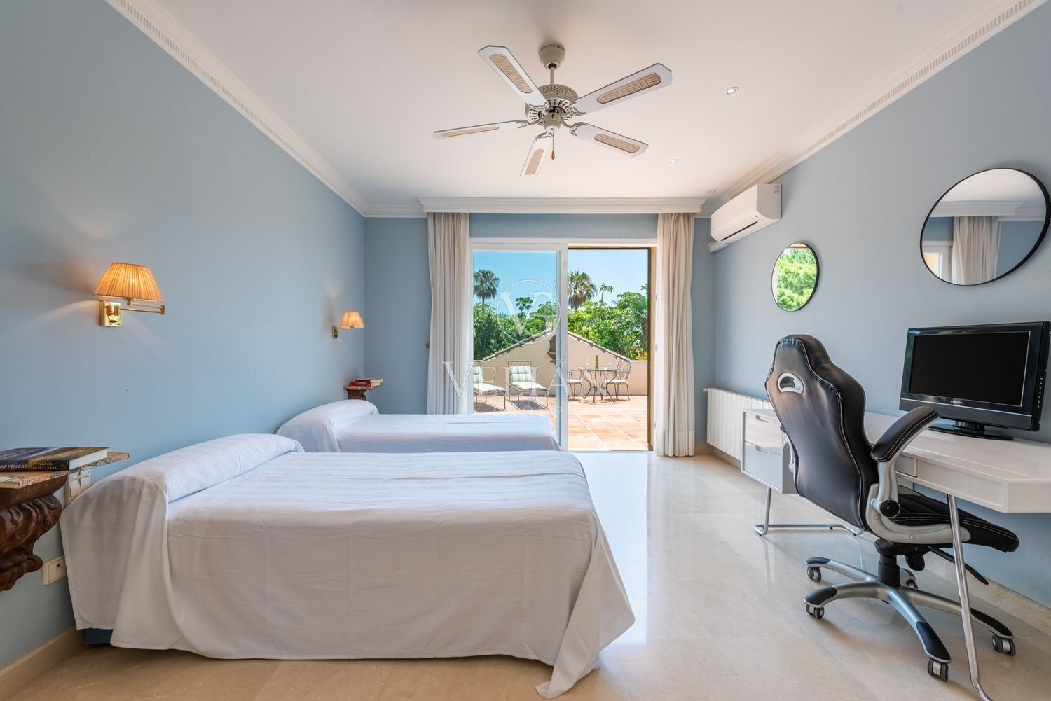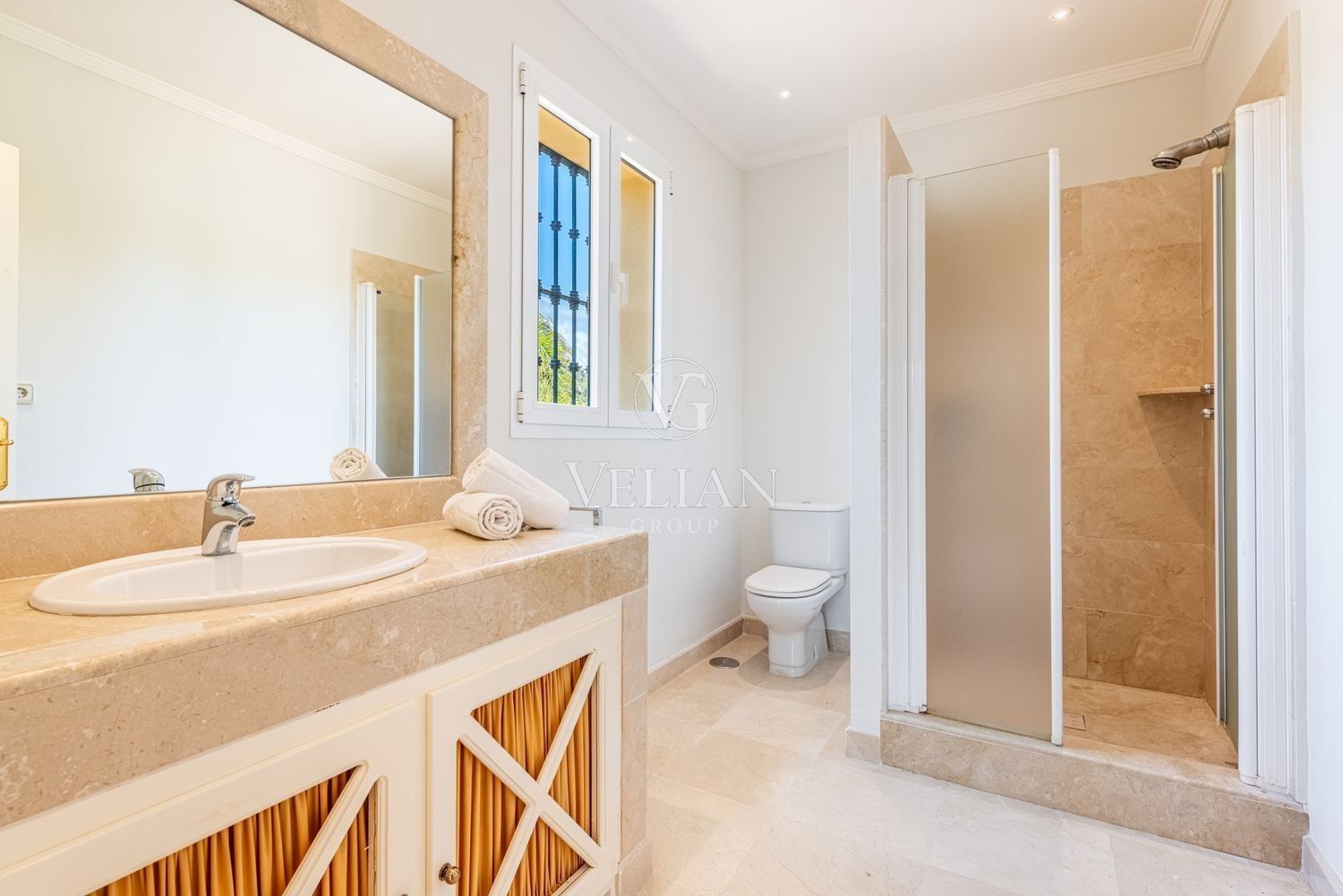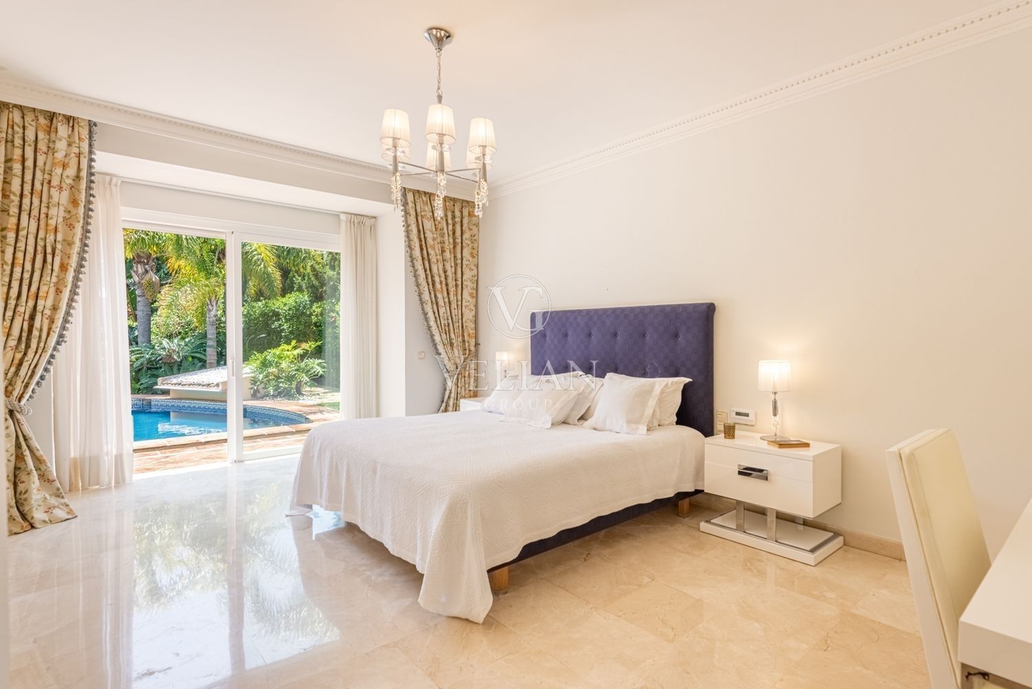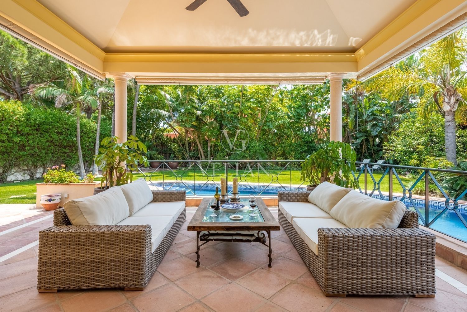 Elegante, luminosa y privada villa orientada al sur ubicada en la prestigiosa zona residencial de Casasola-Guadalmina Baja, en la Nueva Milla de Oro. Esta zona bien establecida es bien conocida por su discreción, lujosas villas y seguridad las 24 horas. Una propiedad elegante que emana un ambiente tranquilo rodeado de un jardín tropical bellamente diseñado y de bajo mantenimiento. Esta llamativa villa está a solo 300 metros del mar Mediterráneo, y a poca distancia a pie del legendario campo de golf de Guadalmina.La deslumbrante vivienda se ha construido sobre una parcela de 1.140m2 y ofrece una superficie construida de 664,47m2, distribuida en 3 plantas. La superficie construida de 664,47m2 tiene 497,62m2 de interior, 71,85m2 de terrazas cubiertas y descubiertas y 95m2 de piscina. Construida en 2001 por su propietario, que prestó especial atención a cada detalle, esta espaciosa propiedad ha sido construida y terminada con altos estándares de calidad. Esta en excelentes condiciones.Esta villa de 3 niveles y 5 dormitorios está rodeada por un magnífico jardín exuberante y privado, y ofrece una gran piscina privada ubicada alrededor de la propiedad, abrazando la villa, permitiéndole disfrutar de su belleza, así como de su frescura. La propiedad también tiene un garaje para 2 coches y espacio para 4.Al entrar en el espacioso vestíbulo de entrada, uno puede sentir inmediatamente la calma que irradia esta casa y apreciar el espléndido jardín tropical. Este exquisito vestíbulo de techo alto conduce a un gran salón amplio y luminoso que cuenta con un mar de luz natural. En el ala oeste, el gran salón da acceso a una cómoda sala de estar con una acogedora chimenea, para un poco más de calidez y relajación durante los días más fríos del año.En el ala este, la propiedad muestra un espacioso comedor que conecta directamente con una cocina abierta, recientemente renovada, y totalmente equipada con electrodomésticos de lujo Gaggenau, una amplia isla con cómodos taburetes, una despensa independiente y un área de lavandería. La lujosa cocina Siematic da acceso a una luminosa y acogedora terraza para desayunar y ofrece una entrada independiente para los empleados domésticos y acceso al dormitorio en suite para el servicio.El gran salón y el comedor tienen acceso directo a una soleada terraza cubierta orientada al sur, que muestra un comedor al aire libre, barbacoa y zonas de descanso. Puede disfrutar libremente del opulento e inmaculado jardín y de la piscina con la máxima privacidad. Junto a la piscina, bajo los árboles del jardín tropical, hay una zona para sentarse y mucho espacio para tomar el sol.Además, la planta principal presenta un amplio dormitorio principal con un gran vestidor privado y baño en suite con bañera de hidromasaje y ducha independiente. Esta suite también ofrece acceso directo a una gran terraza orientada al sur, a la tentadora piscina para un refrescante chapuzón matutino y al floreciente jardín soleado. Esta planta también incluye un aseo de invitados y un amplio dormitorio de invitados con baño en suite con bañera y ducha independiente.Una luminosa escalera de mármol con techo de doble altura nos lleva al primer piso donde disfrutamos de la villa de dos amplios dormitorios, ambos con baños en suite. Estas habitaciones voluminosas y cómodas comparten una gran terraza orientada al sur con vistas a la piscina y al frondoso jardín. Lugar ideal para leer, disfrutar del atardecer con una copa de vino y soñar despierto.Al bajar al sótano, tendrá mucho espacio para el entretenimiento, que incluye una sala de juegos, una sala de cine y un rincón de gimnasio donde disfrutará de la luz natural que entra por las ventanas de la piscina. Esta planta también está equipada con una amplia zona de almacenamiento.