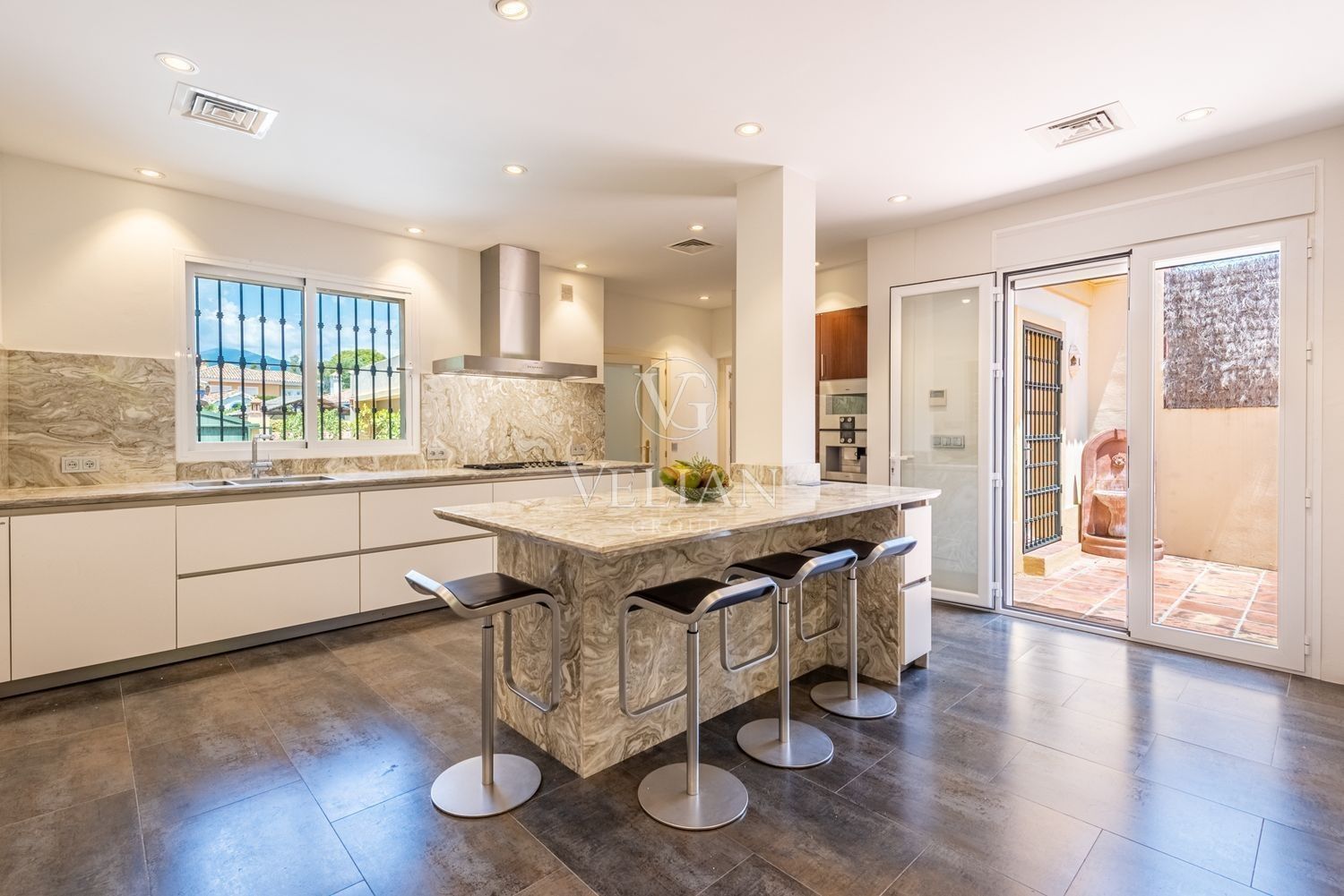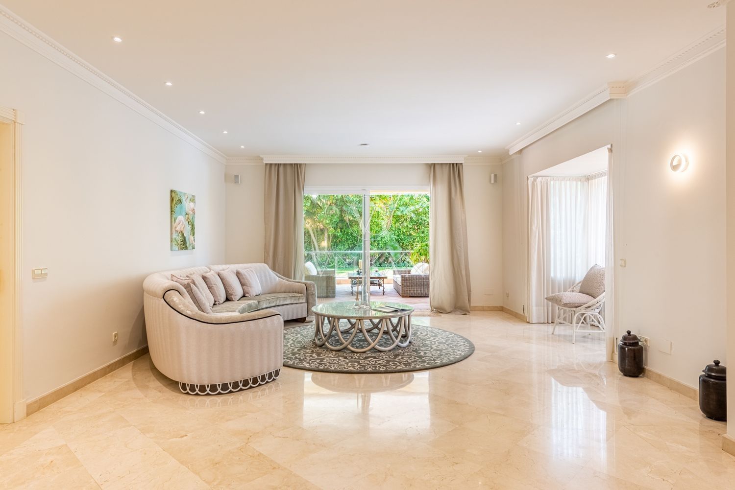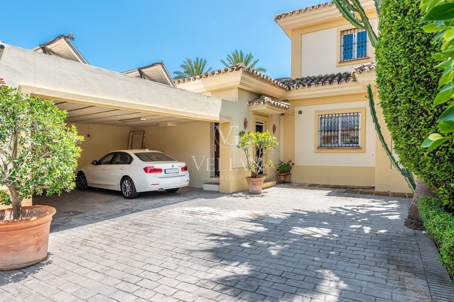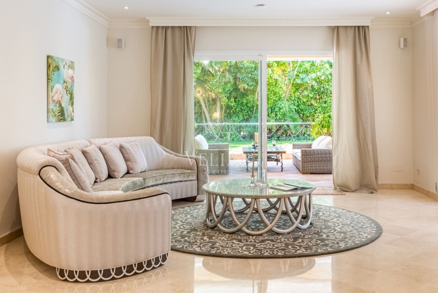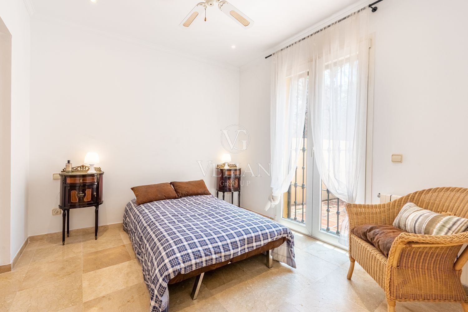 Elegante, luminosa y privada villa orientada al sur ubicada en la prestigiosa zona residencial de Casasola-Guadalmina Baja, en la Nueva Milla de Oro. Esta zona bien establecida es bien conocida por su discreción, lujosas villas y seguridad las 24 horas. Una propiedad elegante que emana un ambiente tranquilo rodeado de un jardín tropical bellamente diseñado y de bajo mantenimiento. Esta llamativa villa está a solo 300 metros del mar Mediterráneo, y a poca distancia a pie del legendario campo de golf de Guadalmina.La deslumbrante vivienda se ha construido sobre una parcela de 1.140m2 y ofrece una superficie construida de 664,47m2, distribuida en 3 plantas. La superficie construida de 664,47m2 tiene 497,62m2 de interior, 71,85m2 de terrazas cubiertas y descubiertas y 95m2 de piscina. Construida en 2001 por su propietario, que prestó especial atención a cada detalle, esta espaciosa propiedad ha sido construida y terminada con altos estándares de calidad. Esta en excelentes condiciones.Esta villa de 3 niveles y 5 dormitorios está rodeada por un magnífico jardín exuberante y privado, y ofrece una gran piscina privada ubicada alrededor de la propiedad, abrazando la villa, permitiéndole disfrutar de su belleza, así como de su frescura. La propiedad también tiene un garaje para 2 coches y espacio para 4.Al entrar en el espacioso vestíbulo de entrada, uno puede sentir inmediatamente la calma que irradia esta casa y apreciar el espléndido jardín tropical. Este exquisito vestíbulo de techo alto conduce a un gran salón amplio y luminoso que cuenta con un mar de luz natural. En el ala oeste, el gran salón da acceso a una cómoda sala de estar con una acogedora chimenea, para un poco más de calidez y relajación durante los días más fríos del año.En el ala este, la propiedad muestra un espacioso comedor que conecta directamente con una cocina abierta, recientemente renovada, y totalmente equipada con electrodomésticos de lujo Gaggenau, una amplia isla con cómodos taburetes, una despensa independiente y un área de lavandería. La lujosa cocina Siematic da acceso a una luminosa y acogedora terraza para desayunar y ofrece una entrada independiente para los empleados domésticos y acceso al dormitorio en suite para el servicio.El gran salón y el comedor tienen acceso directo a una soleada terraza cubierta orientada al sur, que muestra un comedor al aire libre, barbacoa y zonas de descanso. Puede disfrutar libremente del opulento e inmaculado jardín y de la piscina con la máxima privacidad. Junto a la piscina, bajo los árboles del jardín tropical, hay una zona para sentarse y mucho espacio para tomar el sol.Además, la planta principal presenta un amplio dormitorio principal con un gran vestidor privado y baño en suite con bañera de hidromasaje y ducha independiente. Esta suite también ofrece acceso directo a una gran terraza orientada al sur, a la tentadora piscina para un refrescante chapuzón matutino y al floreciente jardín soleado. Esta planta también incluye un aseo de invitados y un amplio dormitorio de invitados con baño en suite con bañera y ducha independiente.Una luminosa escalera de mármol con techo de doble altura nos lleva al primer piso donde disfrutamos de la villa de dos amplios dormitorios, ambos con baños en suite. Estas habitaciones voluminosas y cómodas comparten una gran terraza orientada al sur con vistas a la piscina y al frondoso jardín. Lugar ideal para leer, disfrutar del atardecer con una copa de vino y soñar despierto.Al bajar al sótano, tendrá mucho espacio para el entretenimiento, que incluye una sala de juegos, una sala de cine y un rincón de gimnasio donde disfrutará de la luz natural que entra por las ventanas de la piscina. Esta planta también está equipada con una amplia zona de almacenamiento.