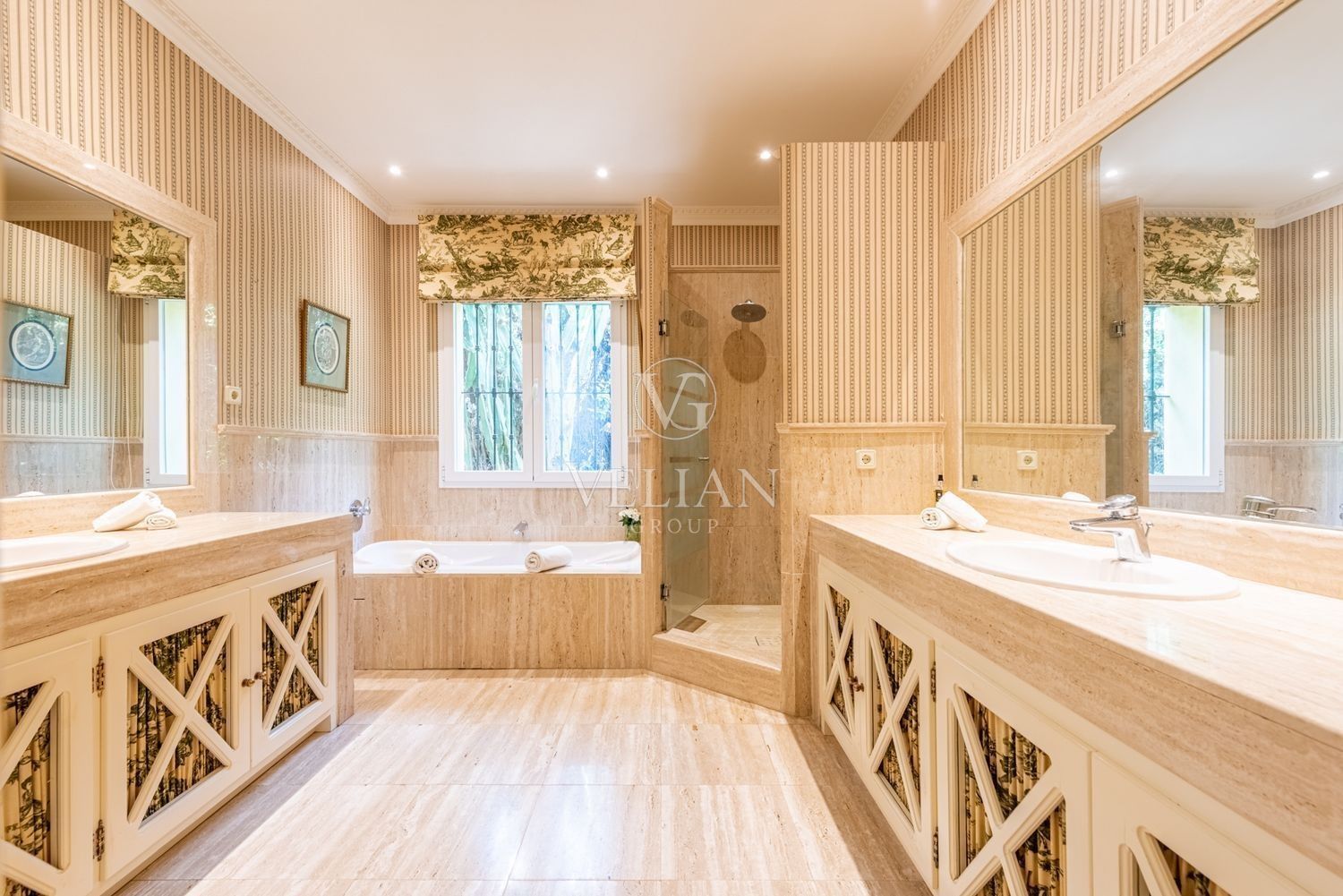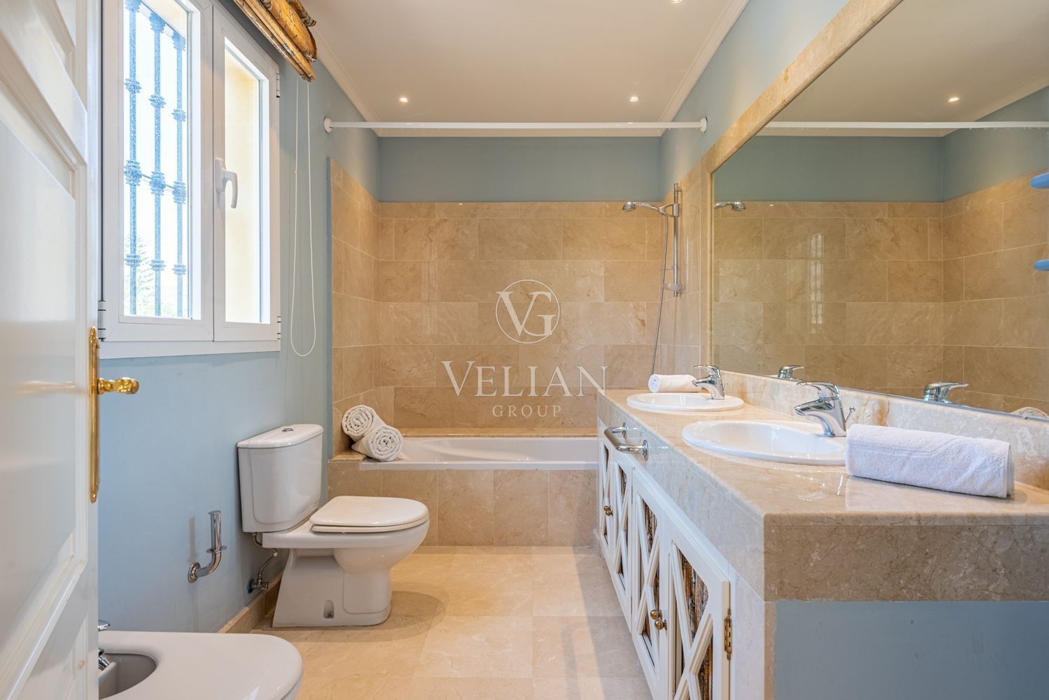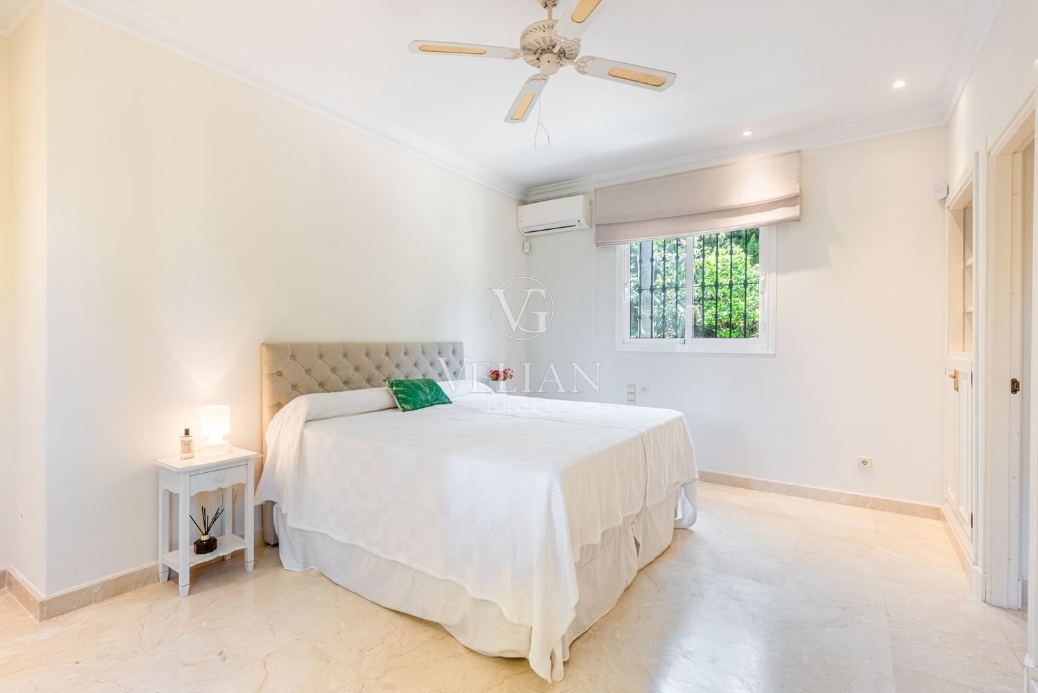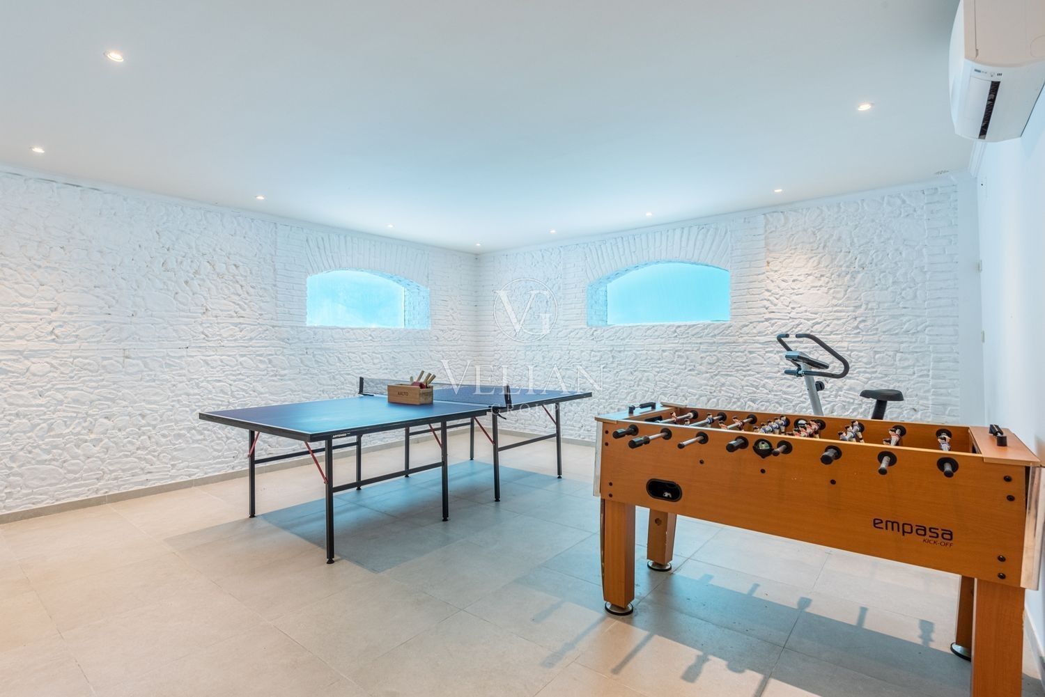Elegante, luminosa y privada villa orientada al sur ubicada en la prestigiosa zona residencial de Casasola-Guadalmina Baja, en la Nueva Milla de Oro. Esta zona bien establecida es bien conocida por su discreción, lujosas villas y seguridad las 24 horas. Una propiedad elegante que emana un ambiente tranquilo rodeado de un jardín tropical bellamente diseñado y de bajo mantenimiento. Esta llamativa villa está a solo 300 metros del mar Mediterráneo, y a poca distancia a pie del legendario campo de golf de Guadalmina.La deslumbrante vivienda se ha construido sobre una parcela de 1.140m2 y ofrece una superficie construida de 664,47m2, distribuida en 3 plantas. La superficie construida de 664,47m2 tiene 497,62m2 de interior, 71,85m2 de terrazas cubiertas y descubiertas y 95m2 de piscina. Construida en 2001 por su propietario, que prestó especial atención a cada detalle, esta espaciosa propiedad ha sido construida y terminada con altos estándares de calidad. Esta en excelentes condiciones.Esta villa de 3 niveles y 5 dormitorios está rodeada por un magnífico jardín exuberante y privado, y ofrece una gran piscina privada ubicada alrededor de la propiedad, abrazando la villa, permitiéndole disfrutar de su belleza, así como de su frescura. La propiedad también tiene un garaje para 2 coches y espacio para 4.Al entrar en el espacioso vestíbulo de entrada, uno puede sentir inmediatamente la calma que irradia esta casa y apreciar el espléndido jardín tropical. Este exquisito vestíbulo de techo alto conduce a un gran salón amplio y luminoso que cuenta con un mar de luz natural. En el ala oeste, el gran salón da acceso a una cómoda sala de estar con una acogedora chimenea, para un poco más de calidez y relajación durante los días más fríos del año.En el ala este, la propiedad muestra un espacioso comedor que conecta directamente con una cocina abierta, recientemente renovada, y totalmente equipada con electrodomésticos de lujo Gaggenau, una amplia isla con cómodos taburetes, una despensa independiente y un área de lavandería. La lujosa cocina Siematic da acceso a una luminosa y acogedora terraza para desayunar y ofrece una entrada independiente para los empleados domésticos y acceso al dormitorio en suite para el servicio.El gran salón y el comedor tienen acceso directo a una soleada terraza cubierta orientada al sur, que muestra un comedor al aire libre, barbacoa y zonas de descanso. Puede disfrutar libremente del opulento e inmaculado jardín y de la piscina con la máxima privacidad. Junto a la piscina, bajo los árboles del jardín tropical, hay una zona para sentarse y mucho espacio para tomar el sol.Además, la planta principal presenta un amplio dormitorio principal con un gran vestidor privado y baño en suite con bañera de hidromasaje y ducha independiente. Esta suite también ofrece acceso directo a una gran terraza orientada al sur, a la tentadora piscina para un refrescante chapuzón matutino y al floreciente jardín soleado. Esta planta también incluye un aseo de invitados y un amplio dormitorio de invitados con baño en suite con bañera y ducha independiente.Una luminosa escalera de mármol con techo de doble altura nos lleva al primer piso donde disfrutamos de la villa de dos amplios dormitorios, ambos con baños en suite. Estas habitaciones voluminosas y cómodas comparten una gran terraza orientada al sur con vistas a la piscina y al frondoso jardín. Lugar ideal para leer, disfrutar del atardecer con una copa de vino y soñar despierto.Al bajar al sótano, tendrá mucho espacio para el entretenimiento, que incluye una sala de juegos, una sala de cine y un rincón de gimnasio donde disfrutará de la luz natural que entra por las ventanas de la piscina. Esta planta también está equipada con una amplia zona de almacenamiento.