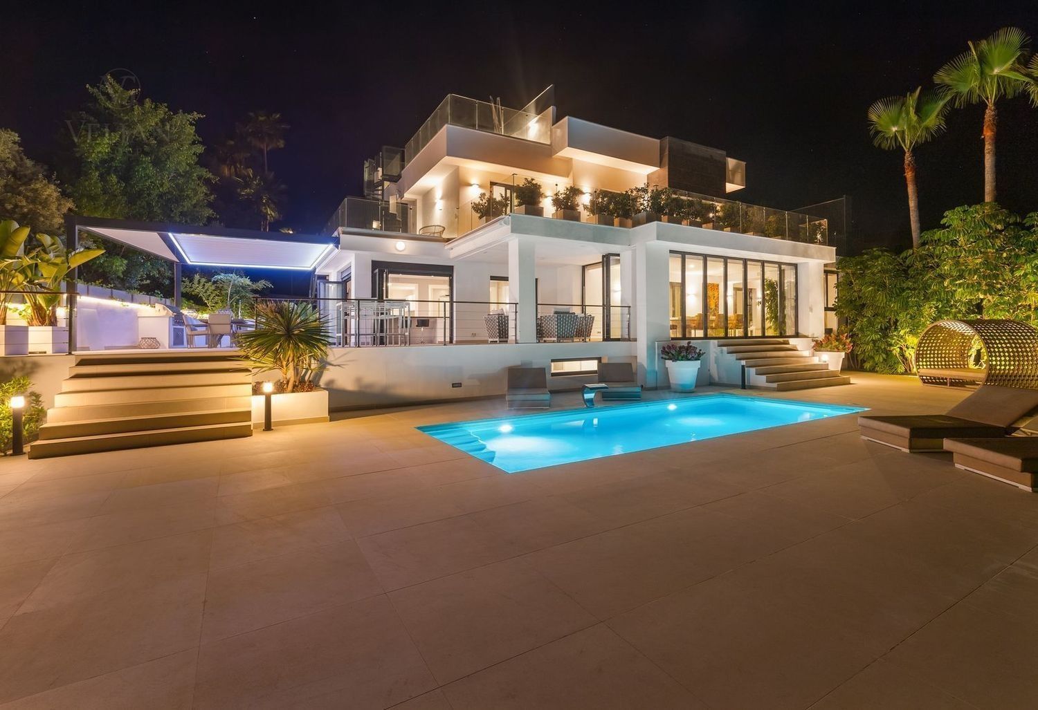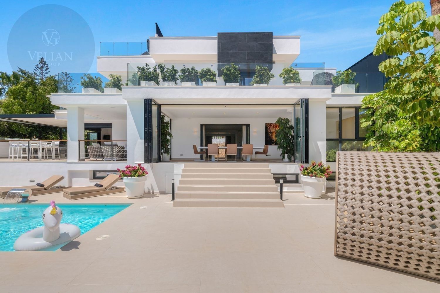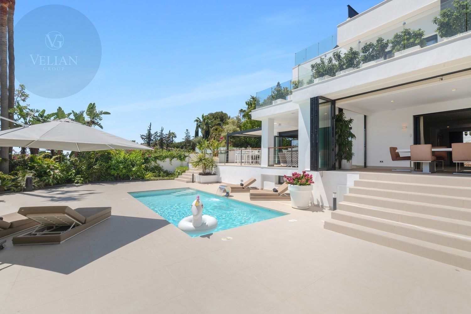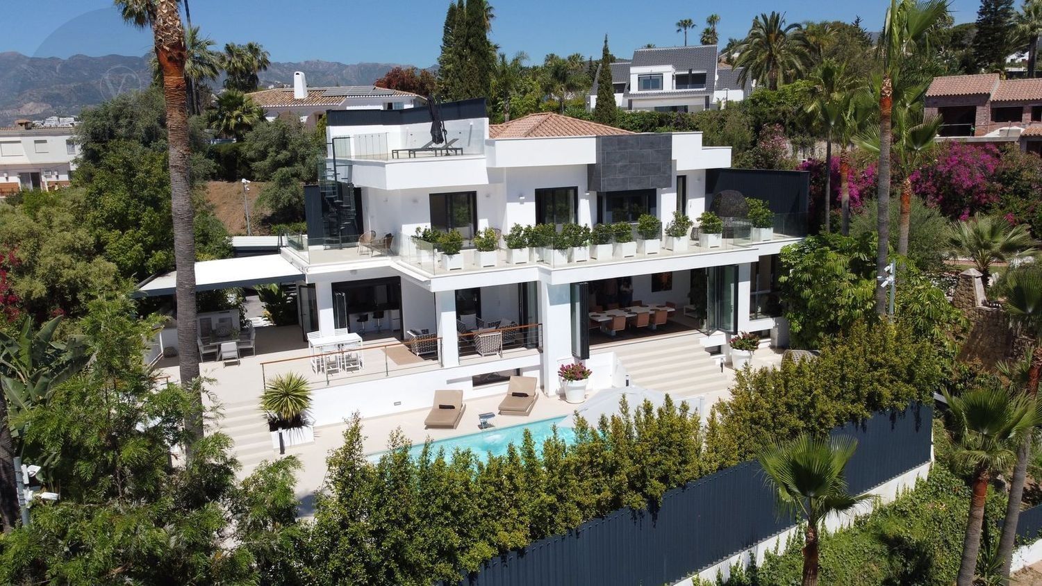Impresionante villa, situada en la muy atractiva comunidad de El Rosario con seguridad las 24 horas. La villa está situada en una calle muy tranquila sin salida en la parte superior de un camino privado. Convenientemente enclavada cerca de las mejores playas de Marbella tiene a su alrededor una amplia variedad de restaurantes, centros comerciales, campos de golf, clubes deportivos, supermercados y todos los demás servicios accesibles con total facilidad. Esta villa se alza majestuosamente en una parcela elevada, soleada y de generosas dimensiones, rodeada de abundantes palmeras maduras y una amplia variedad de plantas y arbustos. Toda una serie de extras y acabados de alto nivel le esperan en esta maravillosa villa. Con preciosas vistas al mar y a la montaña desde la terraza, la propiedad posee una incomparable sensación de paz, privacidad y seguridad.Un camino privado con puertas automáticas le conduce a la gran entrada de la villa. Encontrará una impresionante cascada que le dará la bienvenida, y más adelante un parking cubierto con sitio para 2 vehículos grandes. La villa se distribuye en 3 niveles.Al entrar, a través de sólidas puertas dobles de seguridad de madera hay un hermoso pasillo con mucha luz natural, brindada por doble altura del techo y la ventana que posee arriba. El pasillo de planta abierta conduce directamente a un amplio salón y comedor, ofreciendo una sensación de espacio, lujo y confort. Puertas correderas dobles y puertas de cristal ocultas conducen a un comedor interior-exterior extra grande ideal para cenas o simplemente para relajarse con amigos y familiares con vistas a la piscina y terraza. Esta magnífica habitación está bañada en luz creando un flujo natural a las zonas exteriores. Todas las ventanas y puertas aquí tienen persianas eléctricas, y enormes puertas plegables de cristal que se abren directamente a la zona de la piscina y a la terraza lateral.La planta baja posee un dormitorio doble, con baño en suite, muy luminoso con una ventana de cristal de longitud completa con vistas a la parte delantera y la fuente de agua. También podemos encontrar un baño de visitas, idealmente situado cerca del pasillo de entrada. La villa dispone de una cocina grande y abierta con una enorme nevera, máquina de hielo, dos hornos Neff integrados (1 doble), cafetera Neff integrada y zona separada para la preparación de alimentos. Esta cocina totalmente equipada tiene una gran isla con taburetes de bar perfecto para socializar. Toda la cocina se abre a través de puertas correderas y plegables de cristal y conduce a una zona de entretenimiento al aire libre totalmente equipada y zona de comedor con cocina de verano y barbacoa. Aquí encontrará un montón de terrazas para disfrutar de cenas al aire libre con protección solar retráctil. La zona de barbacoa también se beneficia de un techo automatizado de apertura / cierre con amplia iluminación incorporada. Desde aquí se puede pasar a través de una selección de hermosas plantas tropicales a una escalera exterior que conduce a las terrazas superiores y solárium.La piscina climatizada tiene sol todo el día, rodeada de una zona de solárium para tumbarse al sol relajadamente. La piscina es de agua salada, también posee ducha y una impresionante cascada. Esta zona es ideal para tomar el sol con fácil acceso a la villa. Alrededor de la piscina podrá disfrutar de las plantas tropicales y palmeras y canto de los pájaros dando una sensación de paraíso. Hay una sección de jardín con árboles frutales y huerto.Las escaleras a la 1 ª planta son la imagen de la elegancia con una ventana de piso a techo e iluminada por una lámpara de araña con hermosa caída. Arriba, la villa ofrece dos habitaciones dobles muy amplias y luminosas a las que se accede a través de un largo pasillo, ambas con sus propios sistemas de entrada con teclado, baños privados y acceso directo a las cálidas terrazas.