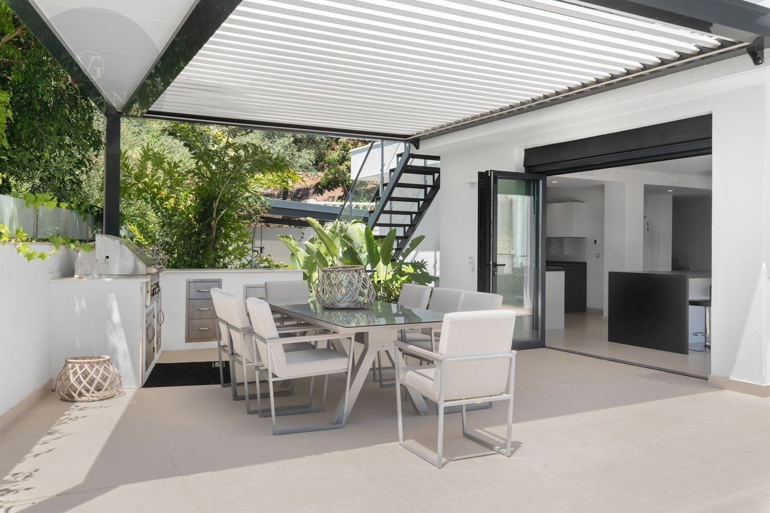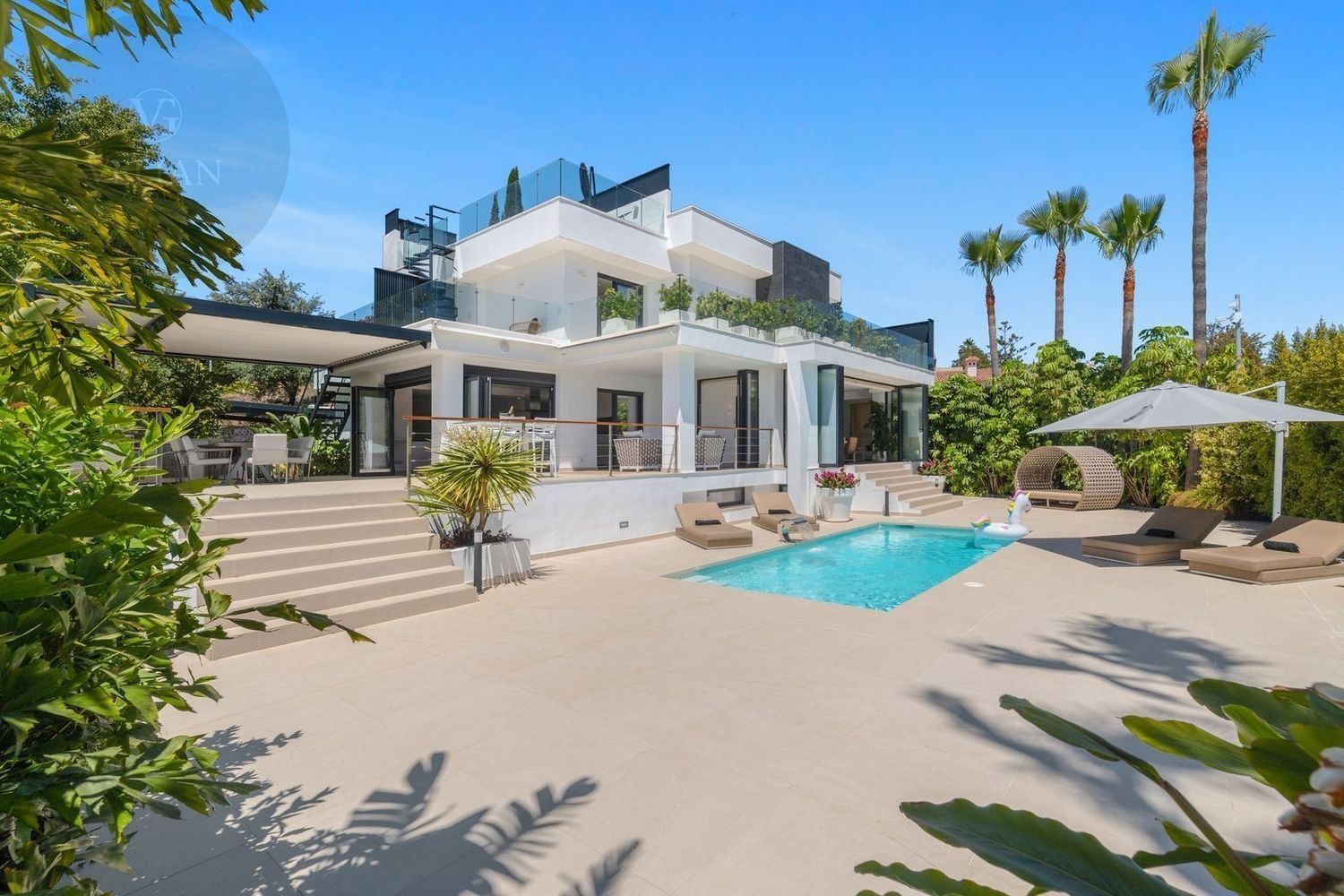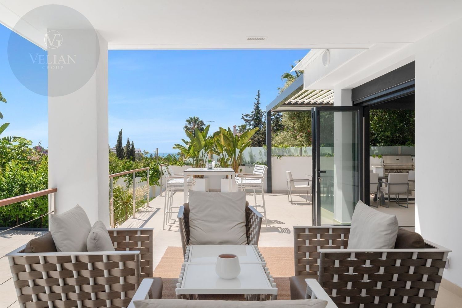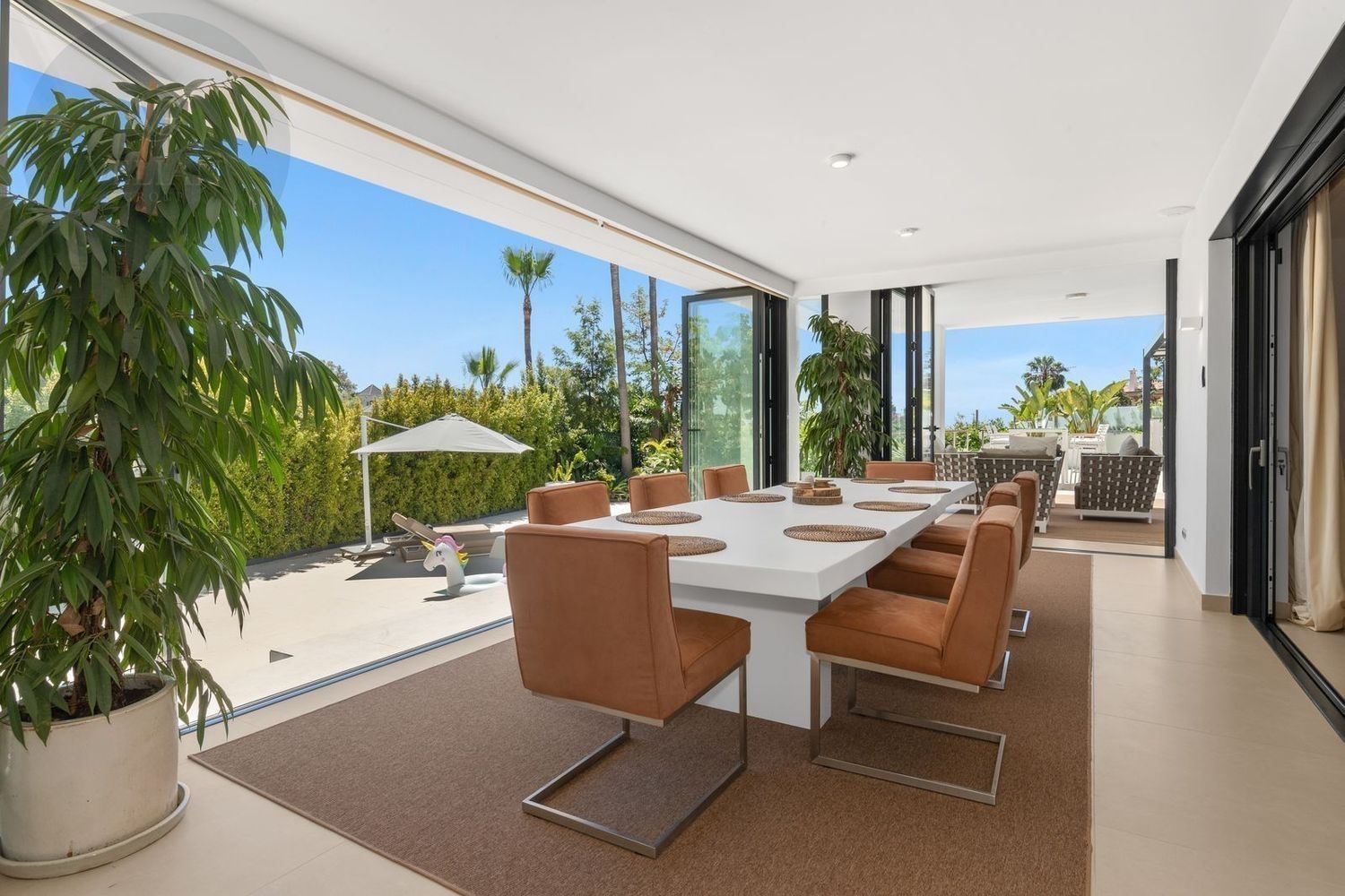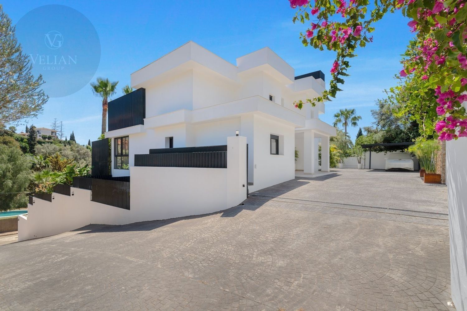 Impresionante villa, situada en la muy atractiva comunidad de El Rosario con seguridad las 24 horas. La villa está situada en una calle muy tranquila sin salida en la parte superior de un camino privado. Convenientemente enclavada cerca de las mejores playas de Marbella tiene a su alrededor una amplia variedad de restaurantes, centros comerciales, campos de golf, clubes deportivos, supermercados y todos los demás servicios accesibles con total facilidad. Esta villa se alza majestuosamente en una parcela elevada, soleada y de generosas dimensiones, rodeada de abundantes palmeras maduras y una amplia variedad de plantas y arbustos. Toda una serie de extras y acabados de alto nivel le esperan en esta maravillosa villa. Con preciosas vistas al mar y a la montaña desde la terraza, la propiedad posee una incomparable sensación de paz, privacidad y seguridad.Un camino privado con puertas automáticas le conduce a la gran entrada de la villa. Encontrará una impresionante cascada que le dará la bienvenida, y más adelante un parking cubierto con sitio para 2 vehículos grandes. La villa se distribuye en 3 niveles.Al entrar, a través de sólidas puertas dobles de seguridad de madera hay un hermoso pasillo con mucha luz natural, brindada por doble altura del techo y la ventana que posee arriba. El pasillo de planta abierta conduce directamente a un amplio salón y comedor, ofreciendo una sensación de espacio, lujo y confort. Puertas correderas dobles y puertas de cristal ocultas conducen a un comedor interior-exterior extra grande ideal para cenas o simplemente para relajarse con amigos y familiares con vistas a la piscina y terraza. Esta magnífica habitación está bañada en luz creando un flujo natural a las zonas exteriores. Todas las ventanas y puertas aquí tienen persianas eléctricas, y enormes puertas plegables de cristal que se abren directamente a la zona de la piscina y a la terraza lateral.La planta baja posee un dormitorio doble, con baño en suite, muy luminoso con una ventana de cristal de longitud completa con vistas a la parte delantera y la fuente de agua. También podemos encontrar un baño de visitas, idealmente situado cerca del pasillo de entrada. La villa dispone de una cocina grande y abierta con una enorme nevera, máquina de hielo, dos hornos Neff integrados (1 doble), cafetera Neff integrada y zona separada para la preparación de alimentos. Esta cocina totalmente equipada tiene una gran isla con taburetes de bar perfecto para socializar. Toda la cocina se abre a través de puertas correderas y plegables de cristal y conduce a una zona de entretenimiento al aire libre totalmente equipada y zona de comedor con cocina de verano y barbacoa. Aquí encontrará un montón de terrazas para disfrutar de cenas al aire libre con protección solar retráctil. La zona de barbacoa también se beneficia de un techo automatizado de apertura / cierre con amplia iluminación incorporada. Desde aquí se puede pasar a través de una selección de hermosas plantas tropicales a una escalera exterior que conduce a las terrazas superiores y solárium.La piscina climatizada tiene sol todo el día, rodeada de una zona de solárium para tumbarse al sol relajadamente. La piscina es de agua salada, también posee ducha y una impresionante cascada. Esta zona es ideal para tomar el sol con fácil acceso a la villa. Alrededor de la piscina podrá disfrutar de las plantas tropicales y palmeras y canto de los pájaros dando una sensación de paraíso. Hay una sección de jardín con árboles frutales y huerto.Las escaleras a la 1 ª planta son la imagen de la elegancia con una ventana de piso a techo e iluminada por una lámpara de araña con hermosa caída. Arriba, la villa ofrece dos habitaciones dobles muy amplias y luminosas a las que se accede a través de un largo pasillo, ambas con sus propios sistemas de entrada con teclado, baños privados y acceso directo a las cálidas terrazas.