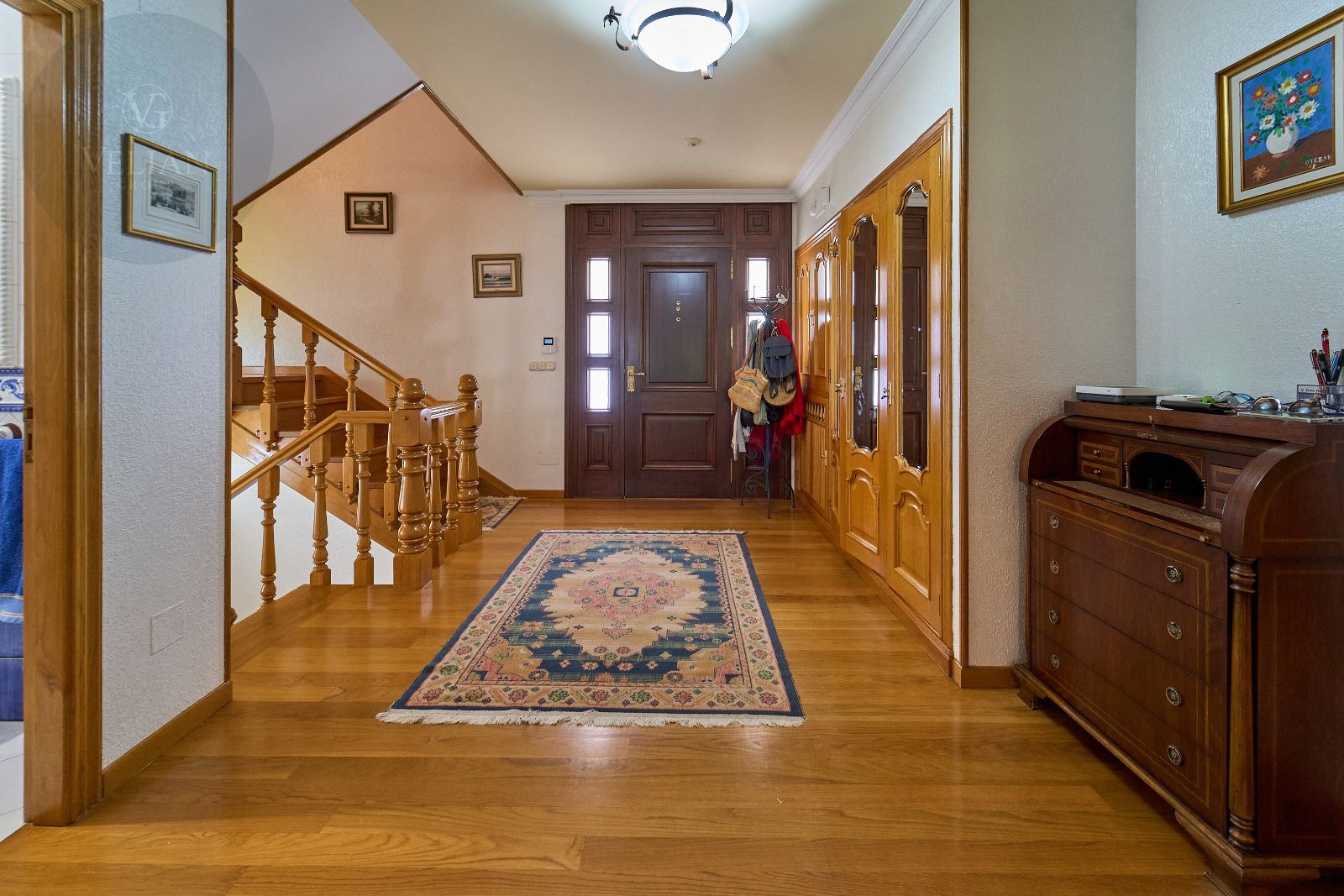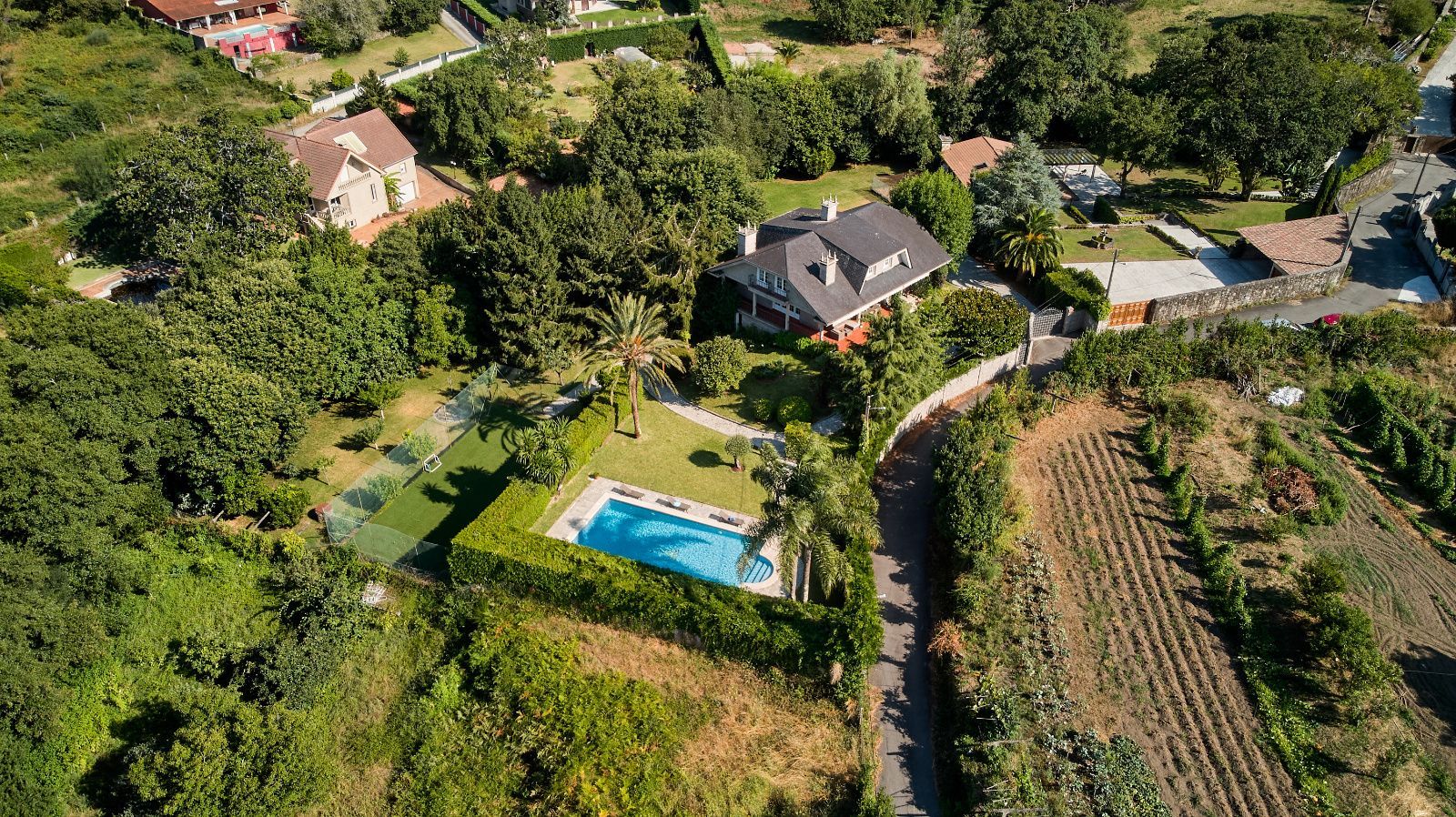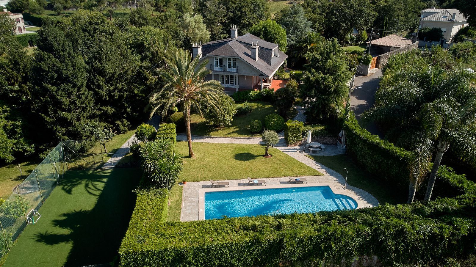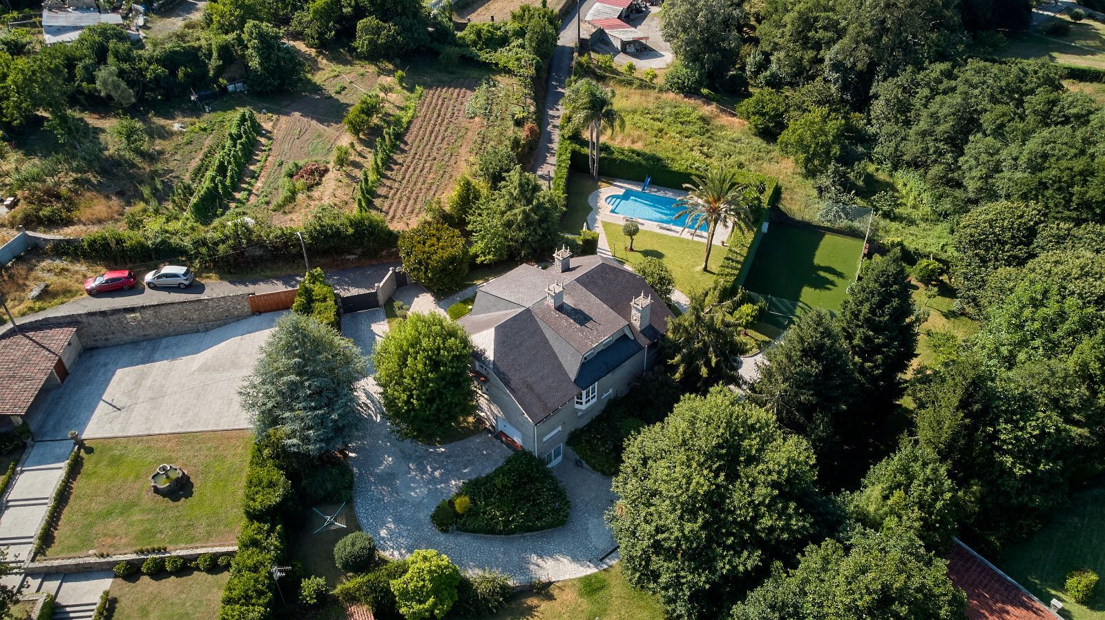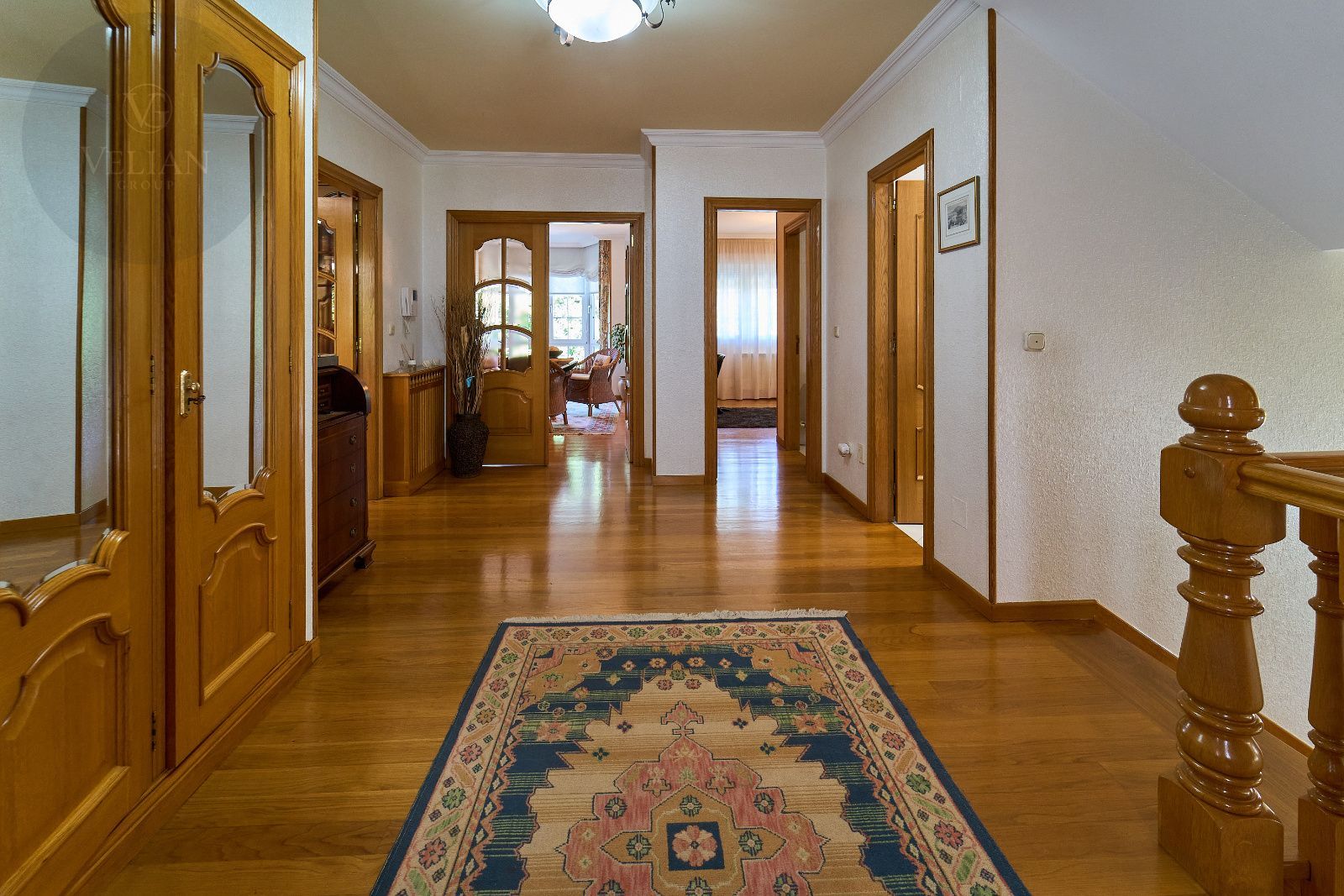 Distribuida en tres plantas, esta casa ofrece 446 m² construidos asentados sobre una finca de más de 4.000 m² completamente cerrada por un sólido muro de piedra, lo que garantiza intimidad y seguridad. La vivienda cuenta con cinco amplios dormitorios, todos ellos con balconcillo y armarios empotrados en roble americano, cuatro baños completos y un aseo de cortesía.