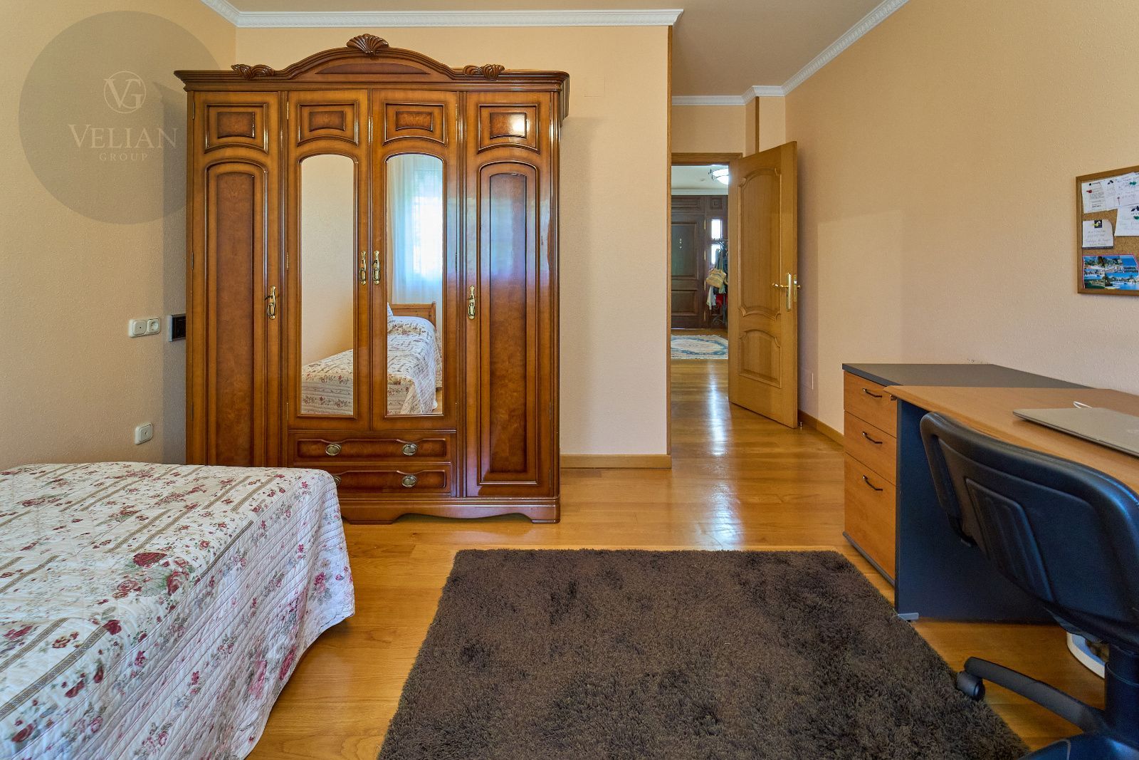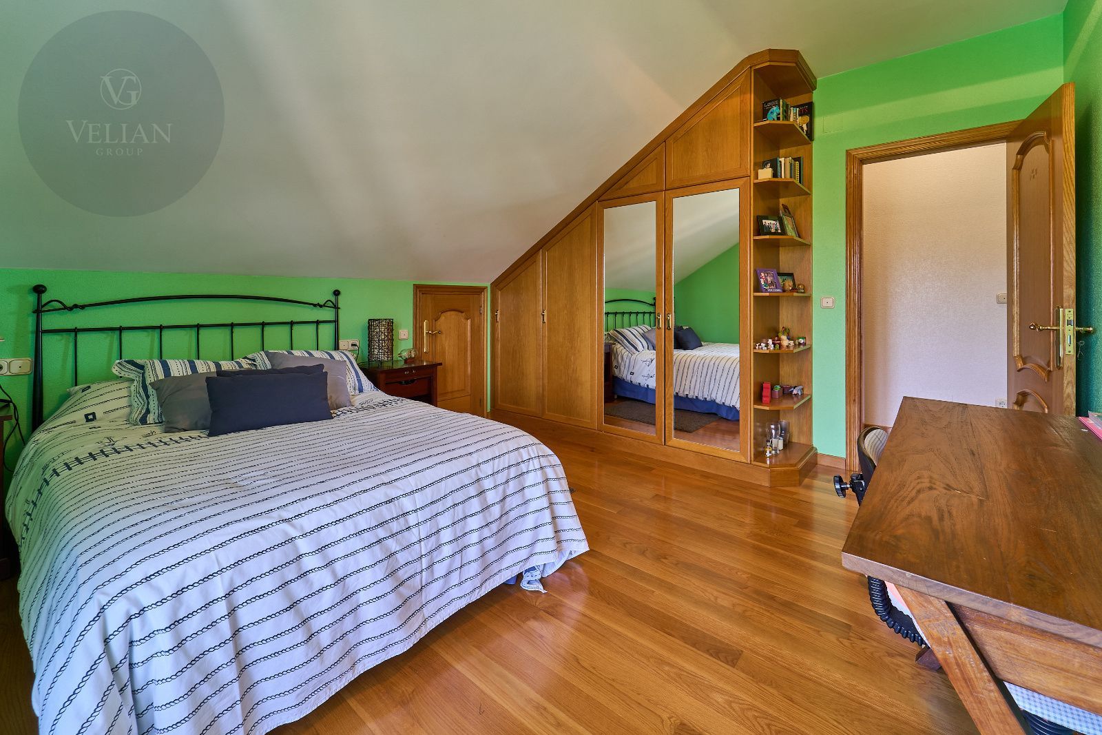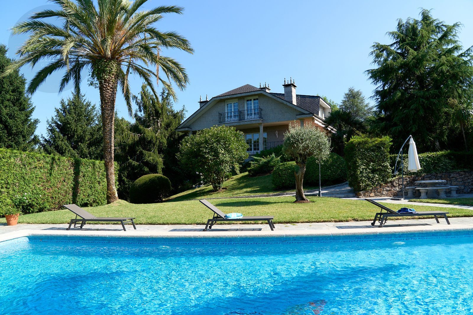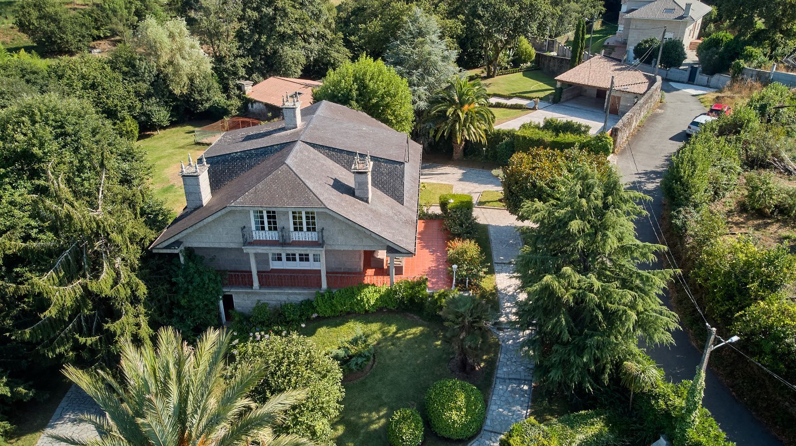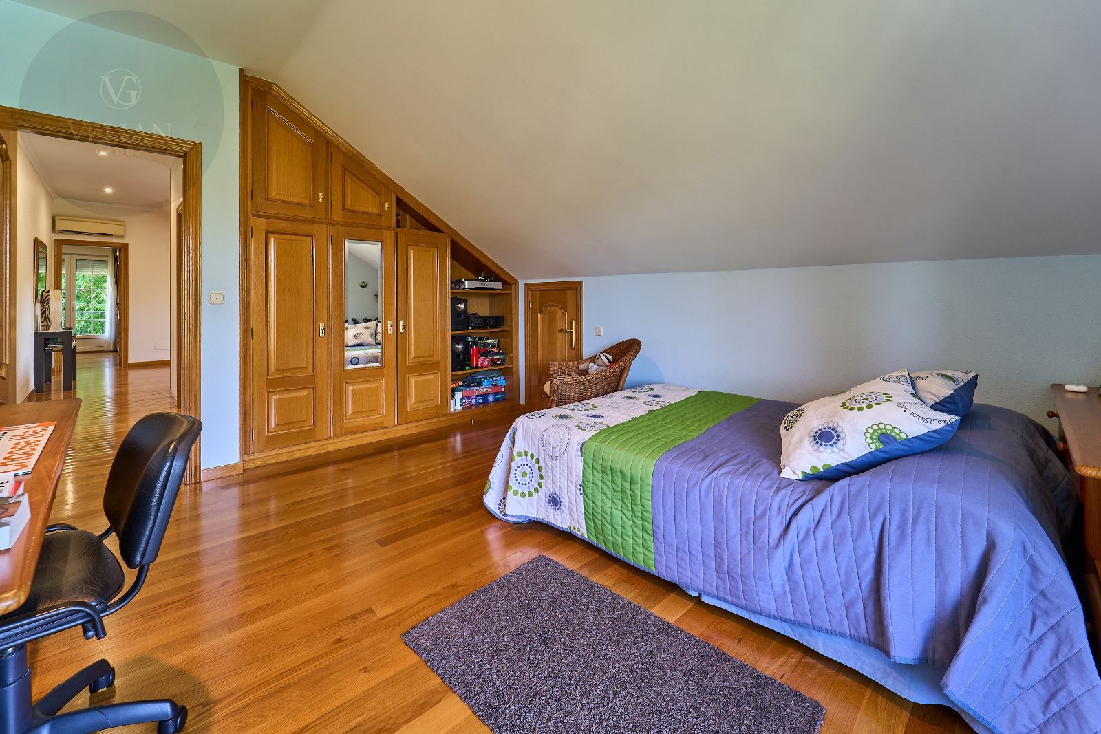 Distribuida en tres plantas, esta casa ofrece 446 m² construidos asentados sobre una finca de más de 4.000 m² completamente cerrada por un sólido muro de piedra, lo que garantiza intimidad y seguridad. La vivienda cuenta con cinco amplios dormitorios, todos ellos con balconcillo y armarios empotrados en roble americano, cuatro baños completos y un aseo de cortesía.