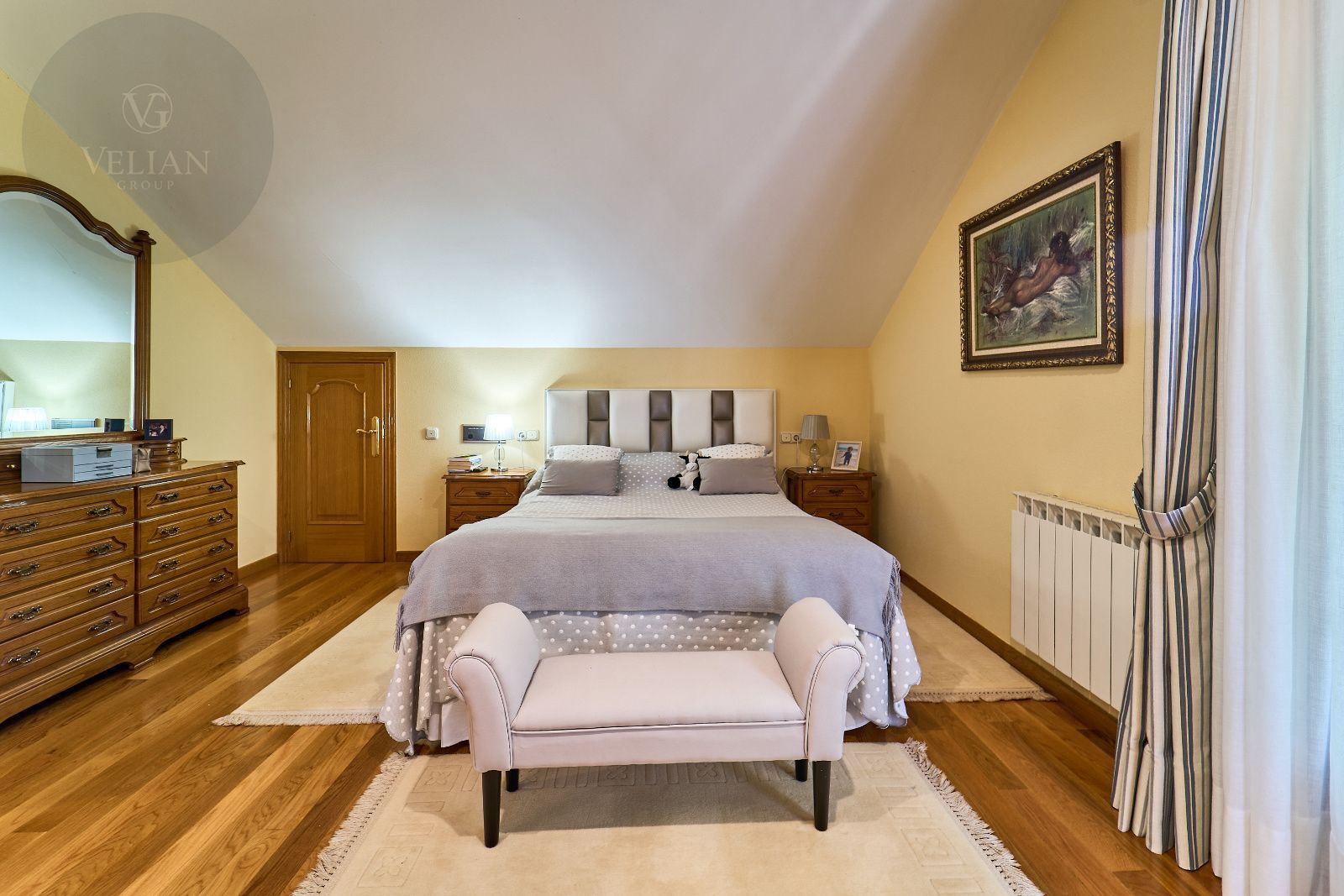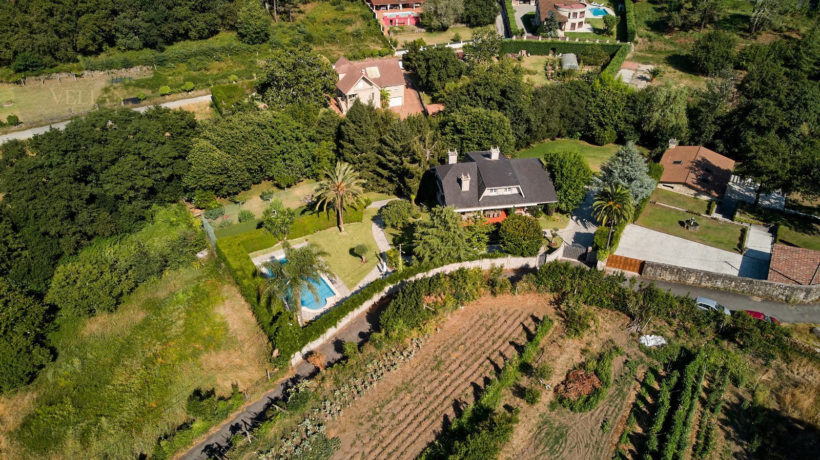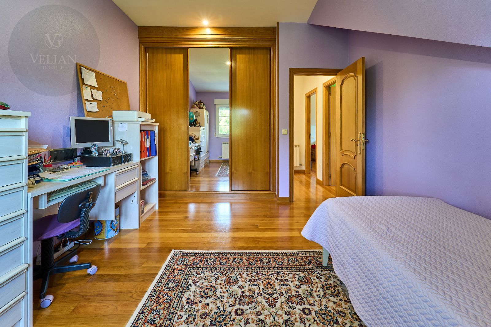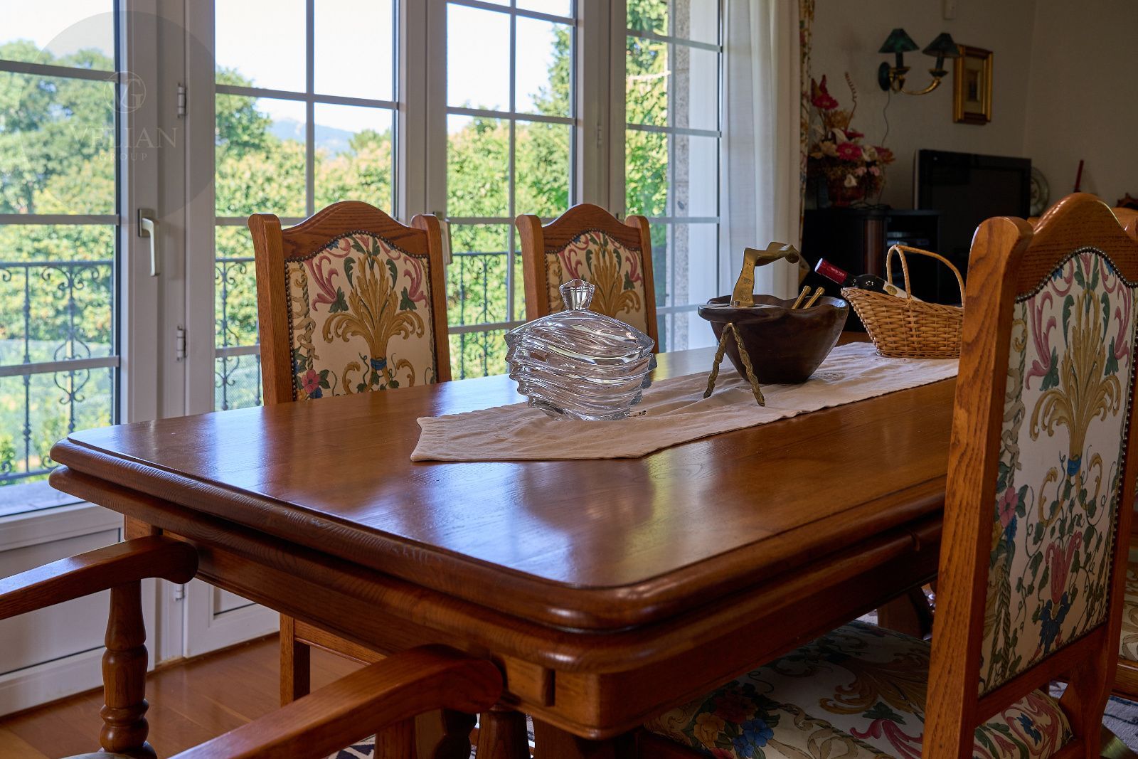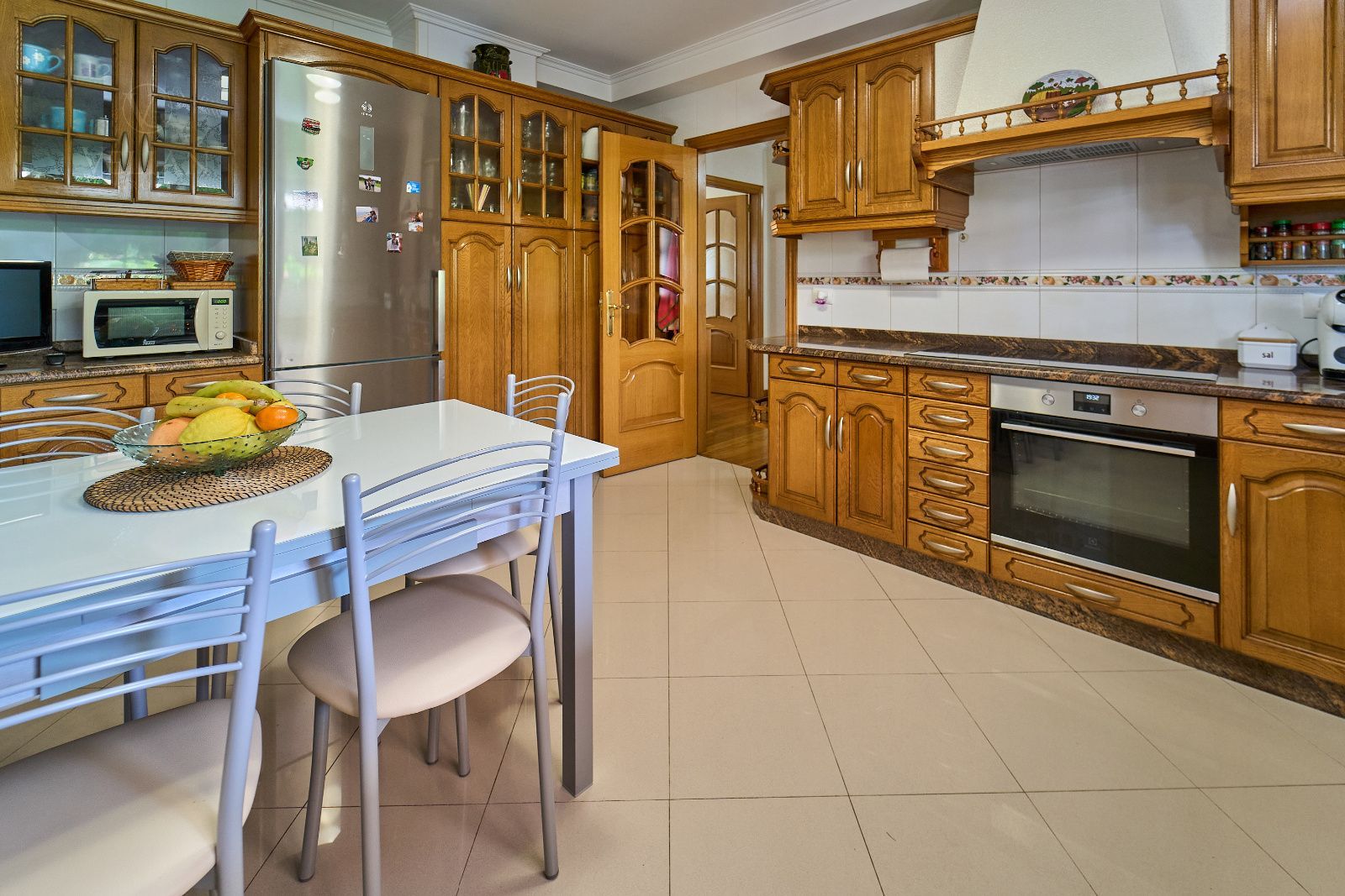 Distribuida en tres plantas, esta casa ofrece 446 m² construidos asentados sobre una finca de más de 4.000 m² completamente cerrada por un sólido muro de piedra, lo que garantiza intimidad y seguridad. La vivienda cuenta con cinco amplios dormitorios, todos ellos con balconcillo y armarios empotrados en roble americano, cuatro baños completos y un aseo de cortesía.