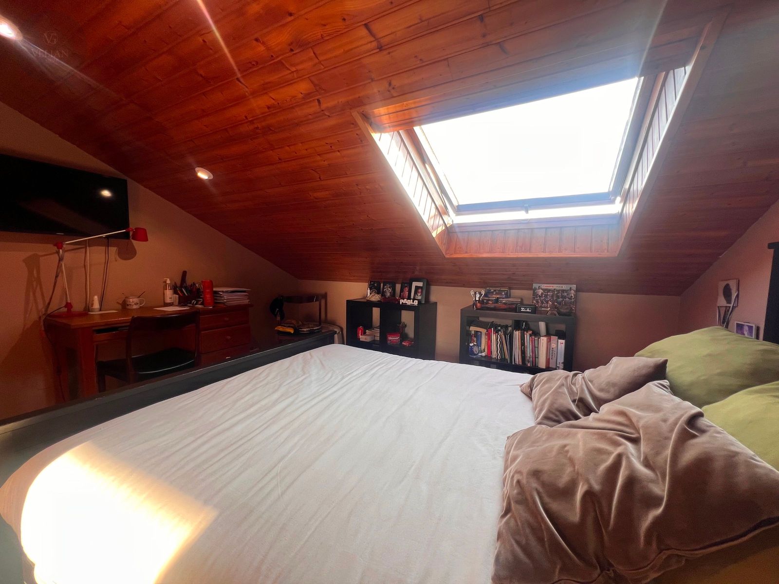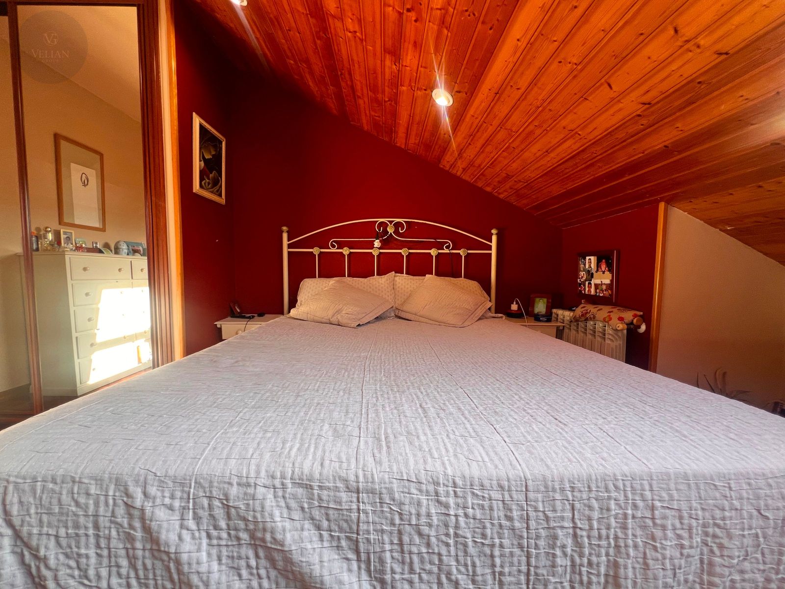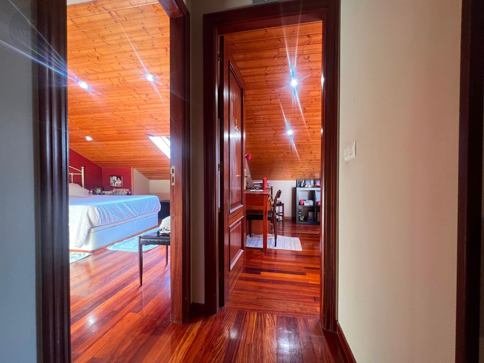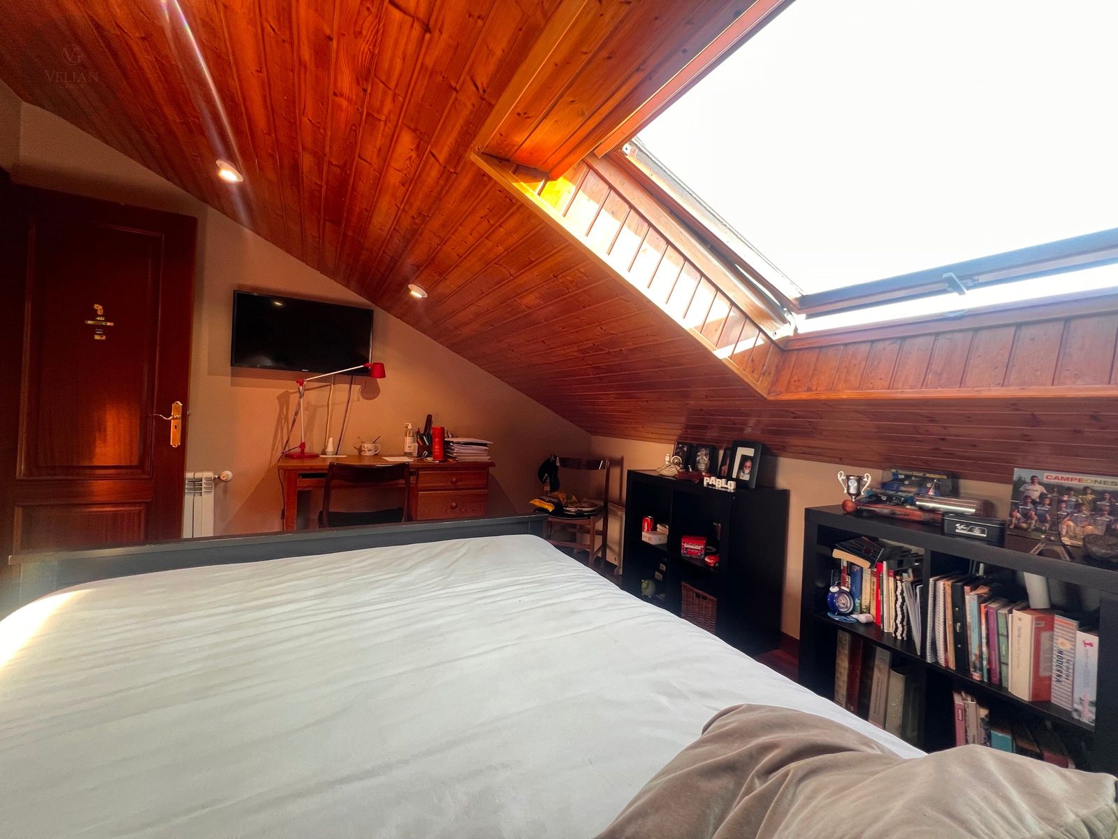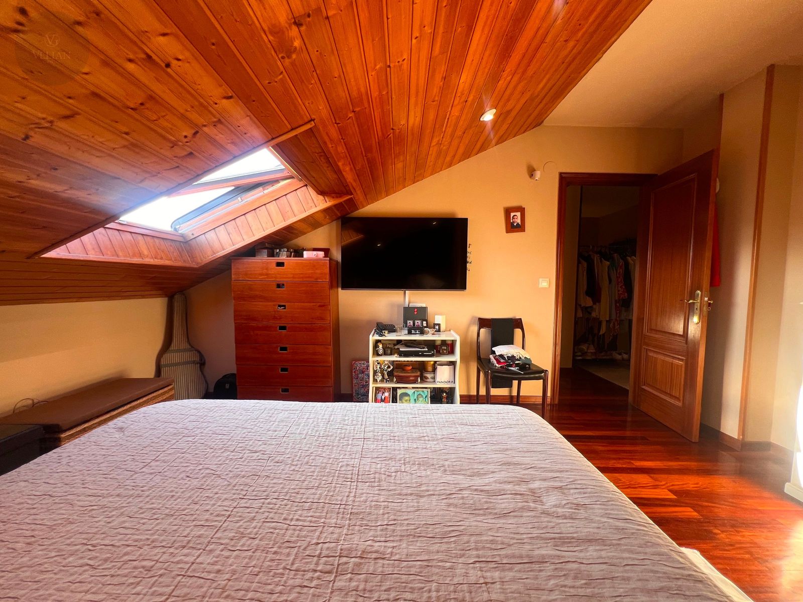 En la planta superior, tres dormitorios —dos de ellos abuhardillados con encanto propio y uno más amplio— junto con un baño completo con ducha.