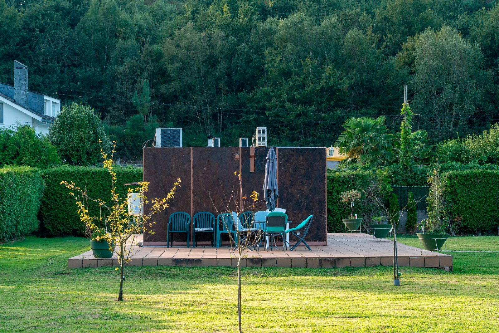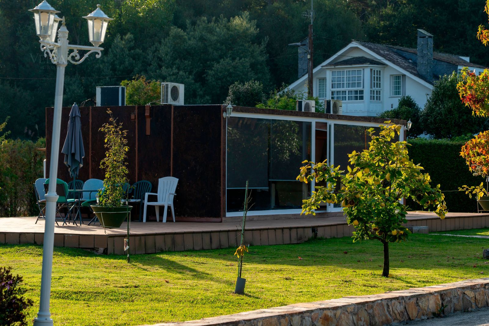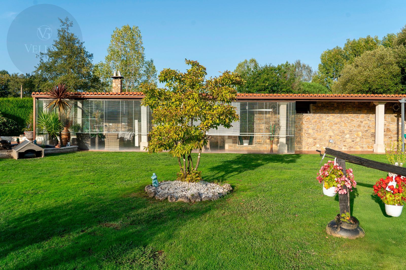 El jardín es uno de los grandes atractivos de Casa Areosa, con césped natural, arbolado, senderos de piedra y un diseño paisajístico que aporta belleza y armonía al conjunto. Todo el entorno ha sido concebido para el descanso, el deporte y la vida al aire libre, en un espacio cerrado que garantiza seguridad y privacidad.
