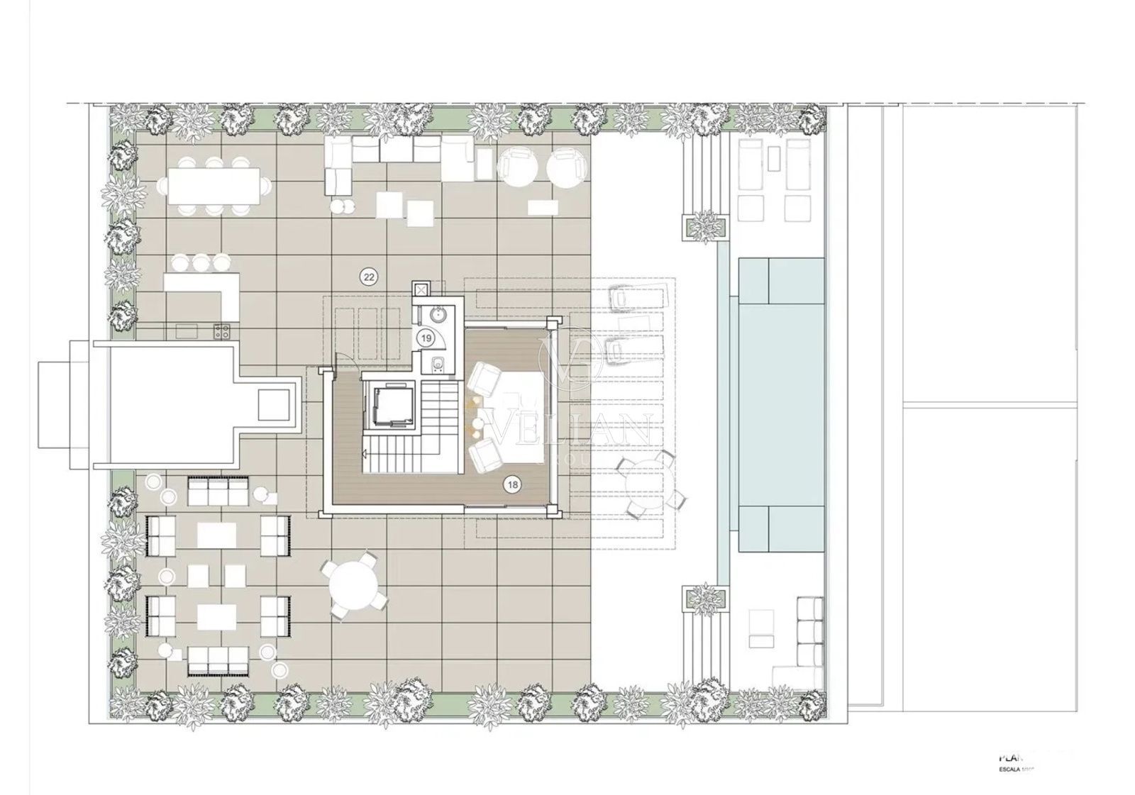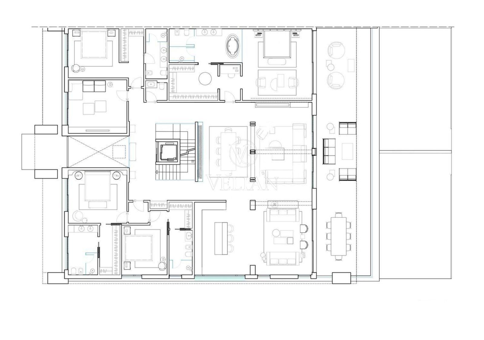 Skyvilla 6 capta al instante la esencia del auténtico lujo, empezando por un impresionante hall de entrada que marca el tono de la grandeza interior. El amplio salón, que destaca por su excepcional tamaño, evoca una sensación de espacio y libertad infinitos. En toda la propiedad, los grandes suelos de mármol realzan la sensación de elegancia, mientras que la cocina -diseñada y amueblada magistralmente por Fendi Casa- ejemplifica la artesanía refinada. La carpintería de alta calidad y las amplias vistas panorámicas desde las terrazas de la planta principal y el solárium elevan aún más la experiencia de vivir. En la planta superior, una piscina privada ofrece un oasis personal, complementado con la opción de instalar un bar o una barbacoa para disfrutar al máximo del ocio y el entretenimiento. Skyvilla 6 es, sin duda, una obra maestra del lujo contemporáneo.