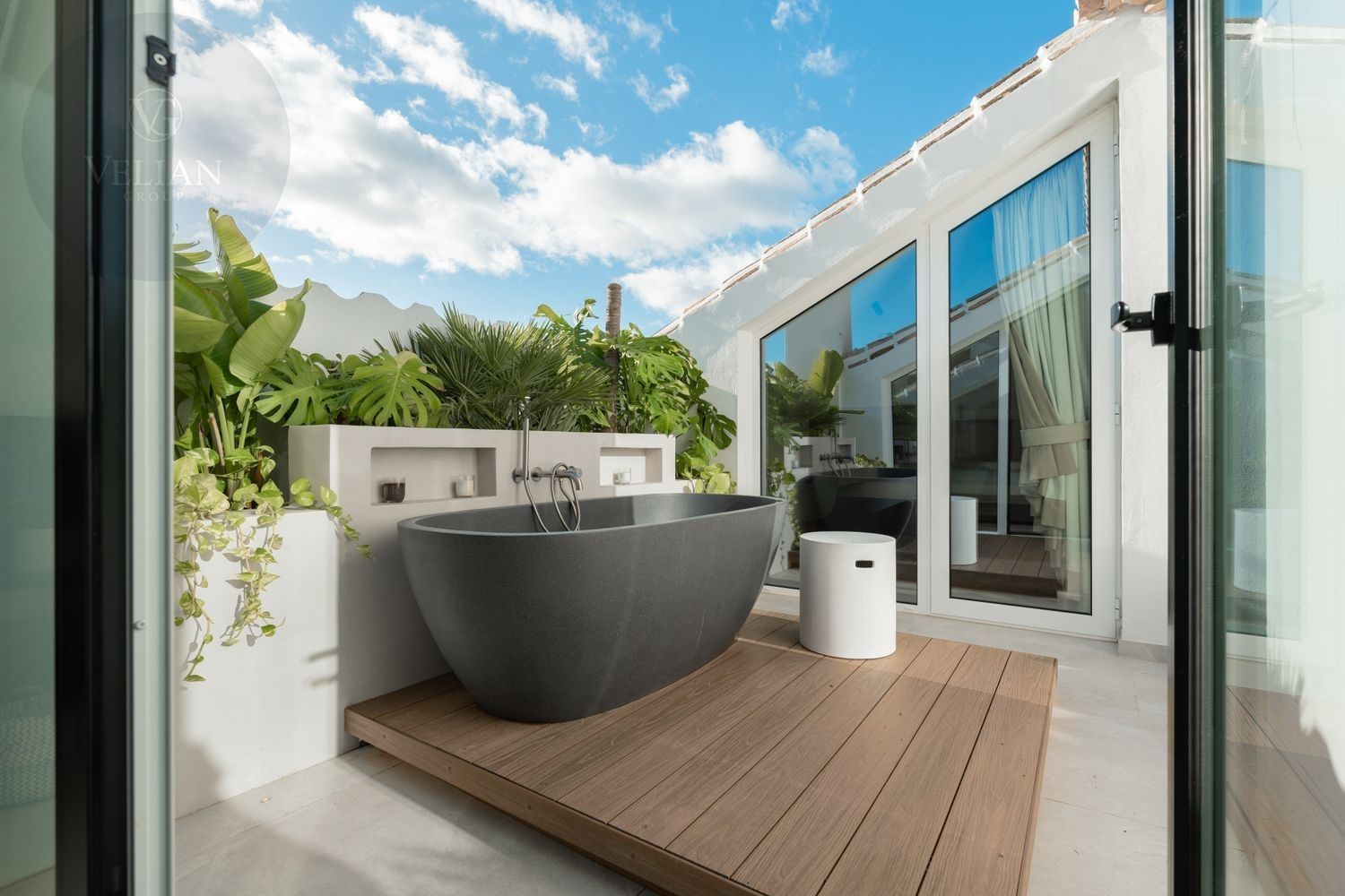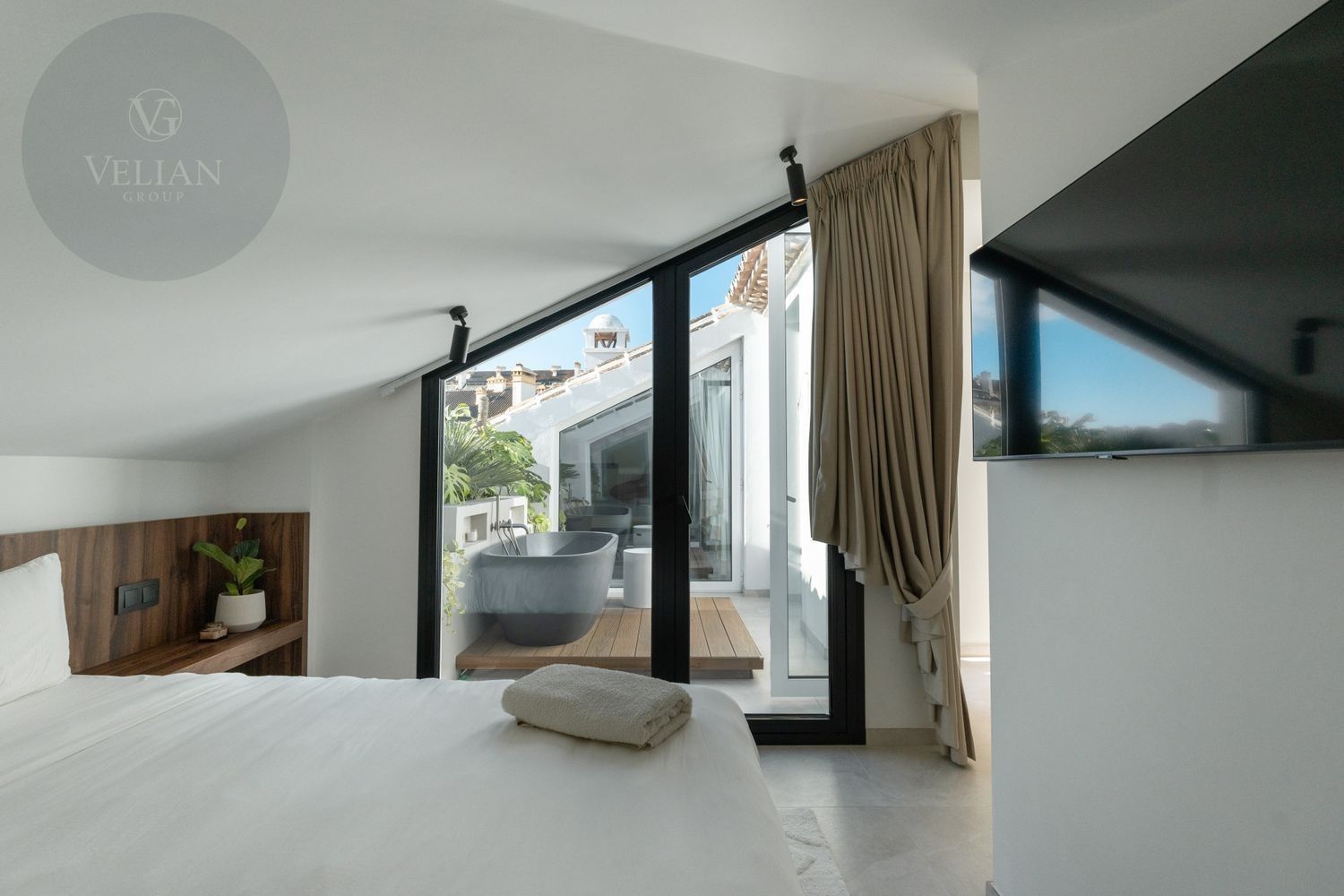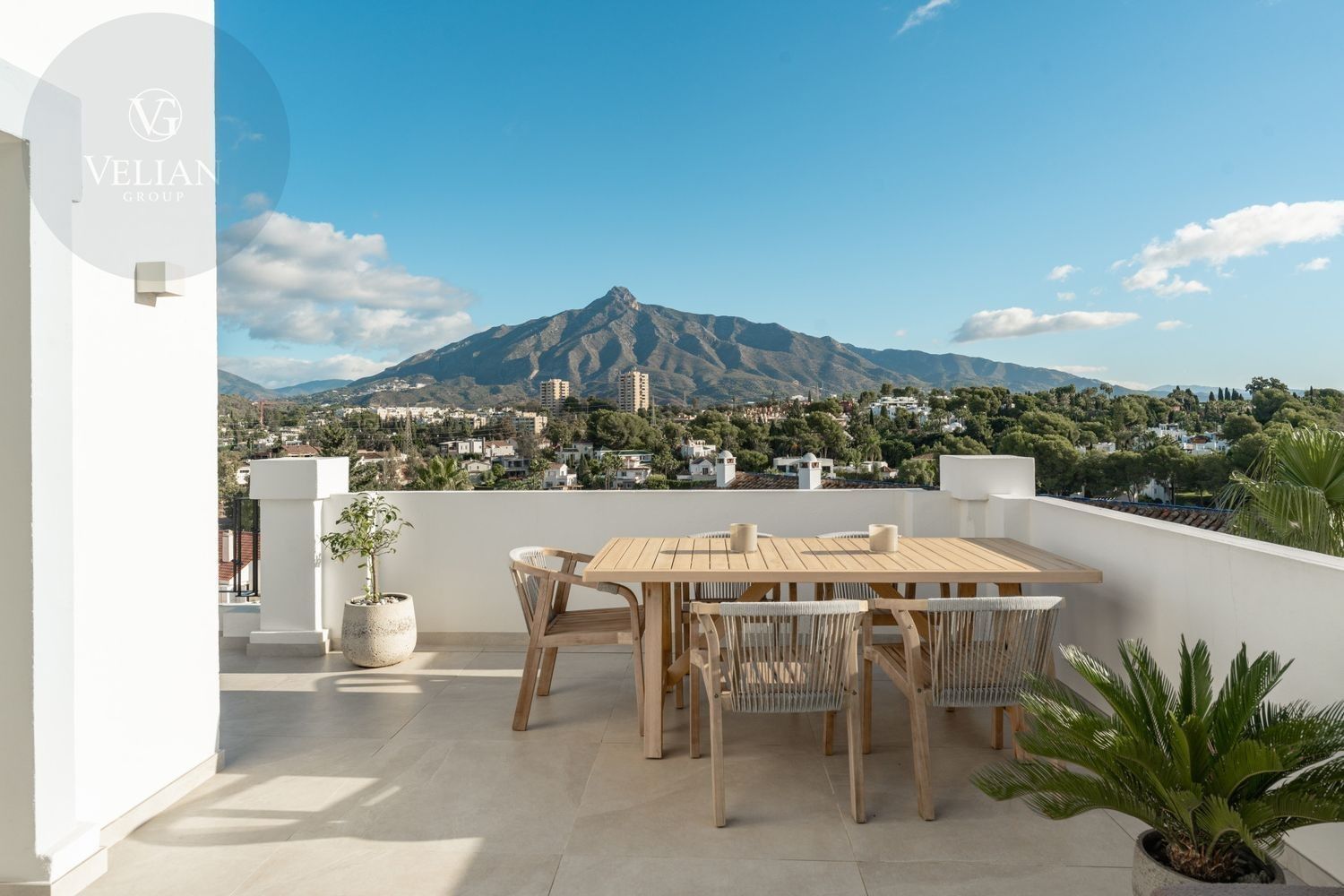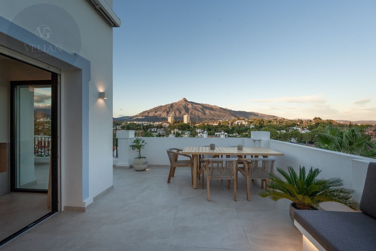 Presentamos un ático dúplex bellamente presentado, ubicado en el corazón de Nueva Andalucía. Esta excepcional vivienda de 3 dormitorios y 3 baños ofrece 160?m² de espacio interior exquisitamente diseñado, complementado por una generosa terraza privada de 66?m². Desde aquí, se pueden disfrutar vistas despejadas a la montaña de La Concha y panorámicas impresionantes al mar — el escenario perfecto para cenar al aire libre, relajarse o simplemente disfrutar del sol de Marbella.Ubicada en una zona privilegiada, la propiedad se encuentra cerca de campos de golf, el puerto, tiendas, restaurantes y la playa — ofreciendo el estilo de vida definitivo de la Costa del Sol. Este ático es ideal tanto para familias como para profesionales, con fácil acceso al transporte y al centro de la ciudad.En el interior, la distribución está cuidadosamente diseñada. Los tres dormitorios son en suite, lo que proporciona comodidad y privacidad. El salón es amplio y luminoso, con mobiliario a medida y una gran zona de comedor, ideal para recibir invitados. La cocina moderna está totalmente equipada y toda la vivienda cuenta con conexión WiFi, perfecta para trabajar desde casa o disfrutar del entretenimiento digital.El edificio ofrece excelentes zonas comunes, incluyendo ascensor, jardines paisajísticos y una piscina comunitaria resplandeciente. Los residentes también disfrutan de un garaje seguro y aparcamiento en la calle.La orientación es clave — con aspectos sur, sureste y suroeste, el apartamento recibe sol durante todo el día. Armarios empotrados, acceso a la terraza privada y la proximidad a todas las comodidades locales hacen de esta propiedad una verdadera joya.