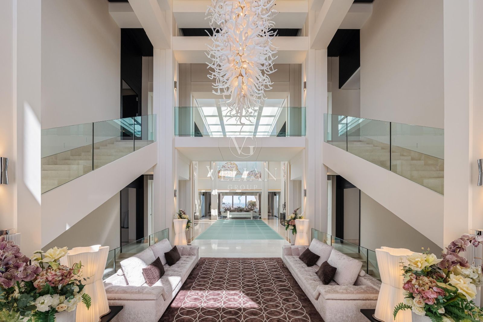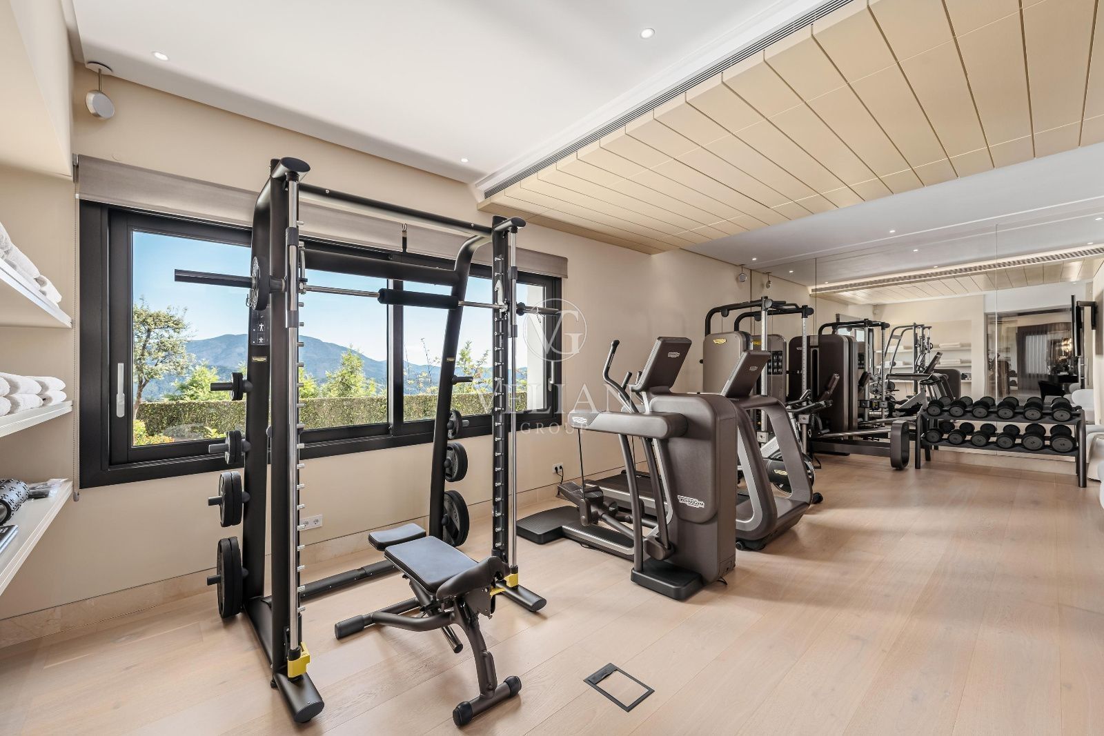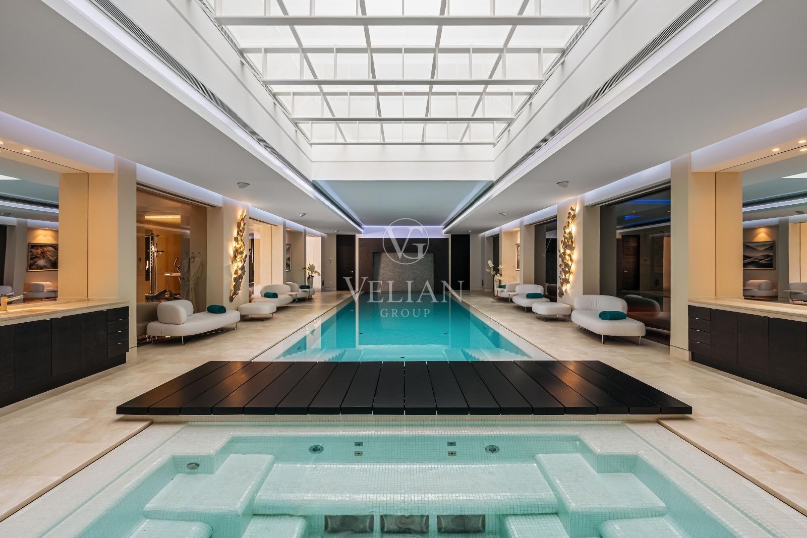 Esta villa cuenta con 7 dormitorios y 9 baños distribuidos en tres plantas, todas accesibles mediante ascensor. Mobiliario de alta gama de prestigiosas marcas como Smania, Fendi, Manutti y Technogym, junto con televisores y altavoces Bang & Olufsen, embellecen los interiores. La propiedad incluye una sala de cine, sala de juegos, spa y gimnasio completo con piscina climatizada interior, jacuzzi, sauna y baño turco.