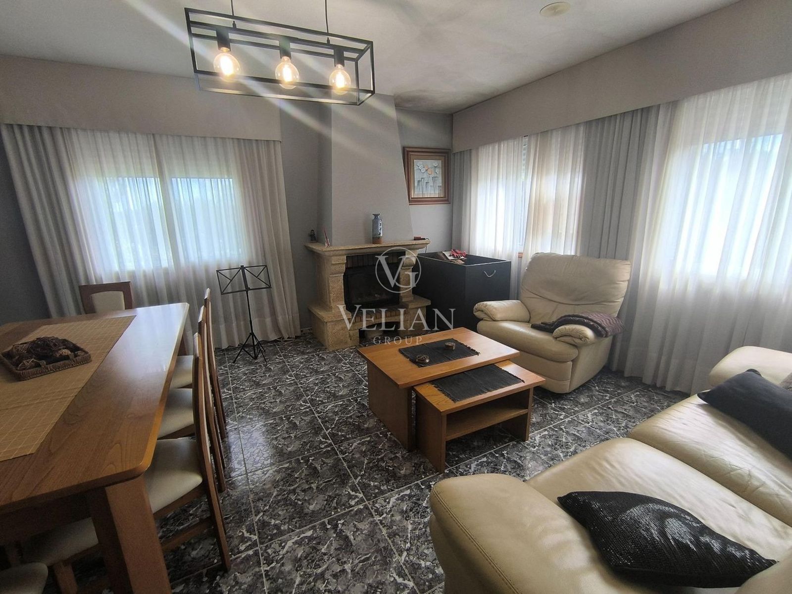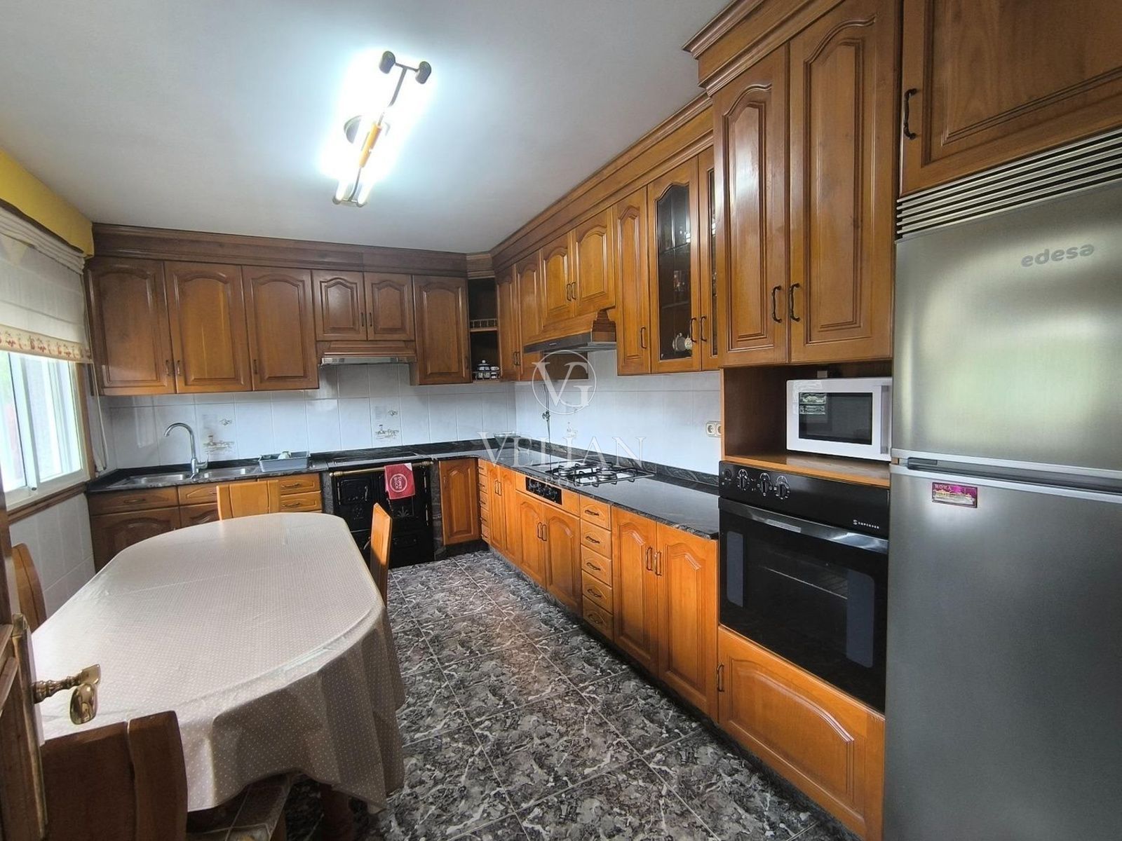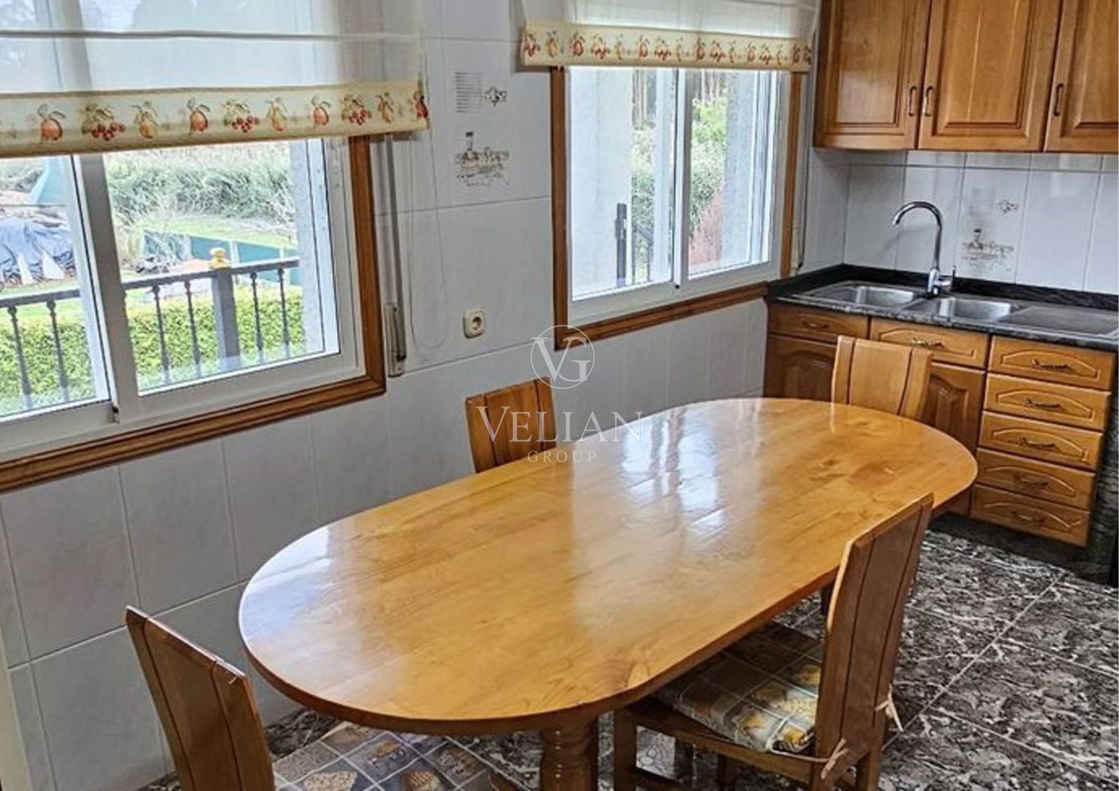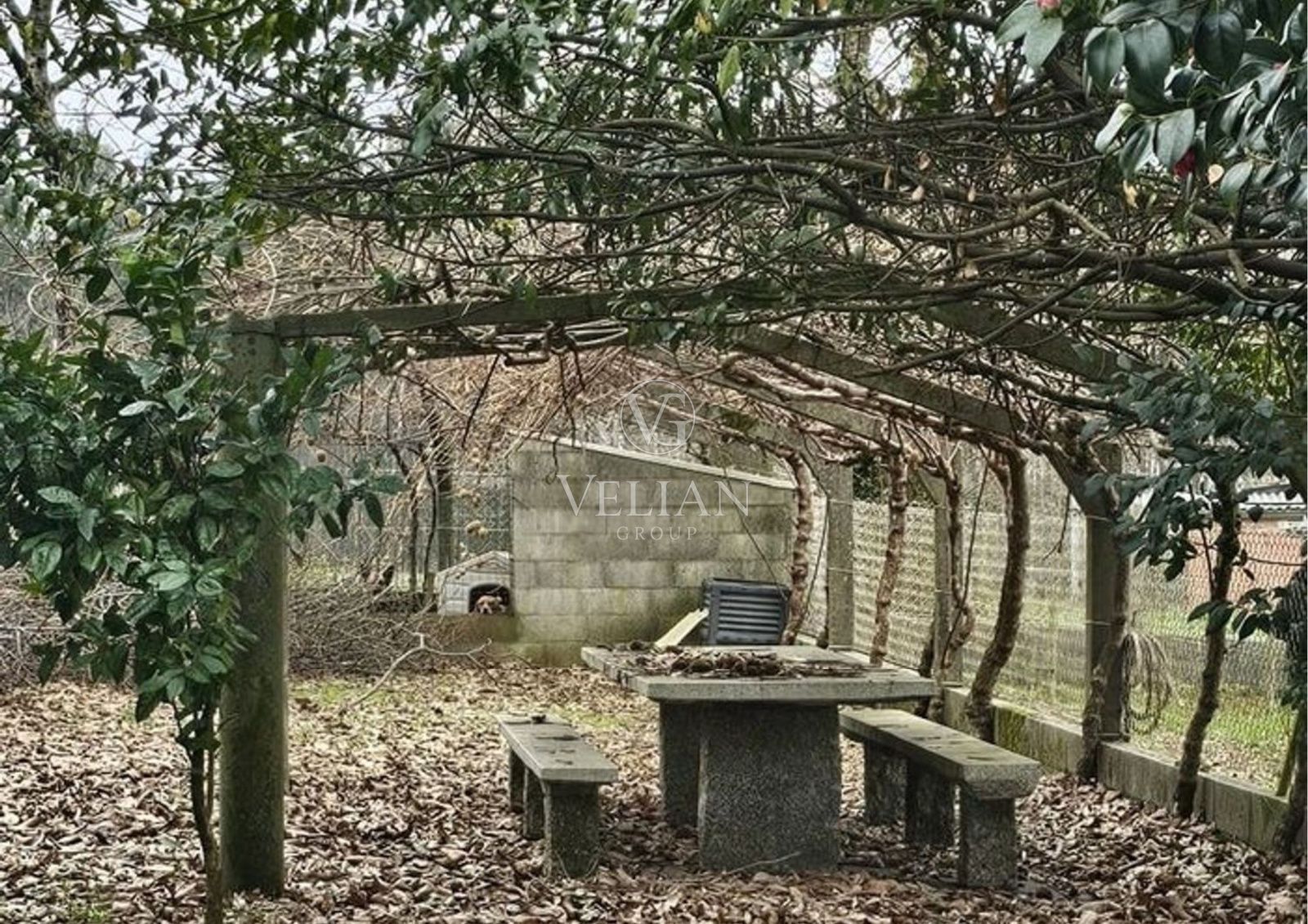 La propiedad se completa con garaje, alpendre, lavadero, dos perreras y un merendero tradicional con mesa y bancos de piedra, además de jardín, terraza, balcón, armarios empotrados y trastero, aportando valor tanto funcional como estético.
