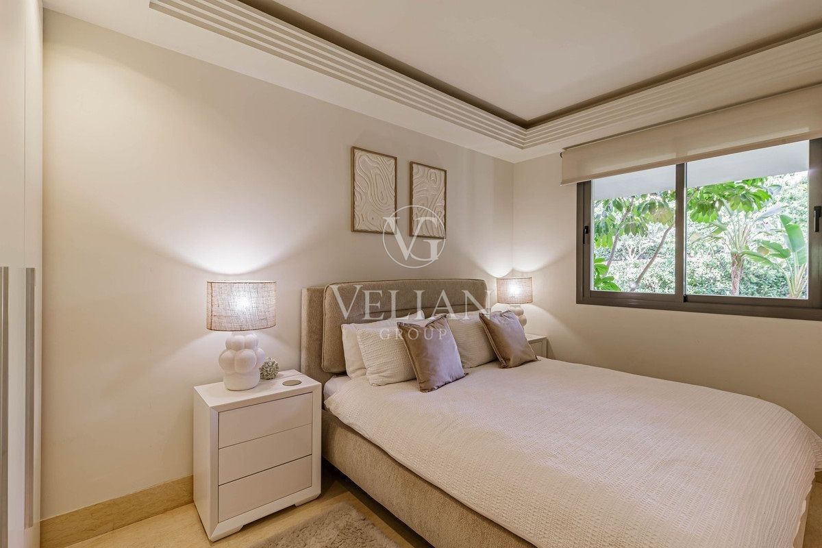 El apartamento presenta un acabado de excelente calidad, con suelos de mármol crema en toda la vivienda, una decoración neutra y elegante y mobiliario de alta calidad que crean una atmósfera moderna y relajante. La luminosa zona de estar y comedor de planta abierta fluye de forma natural hacia la terraza a través de grandes puertas correderas de doble acristalamiento, maximizando la luz natural y enmarcando las preciosas vistas al golf y al mar. La cocina Siemens totalmente equipada, con encimeras de Silestone y electrodomésticos integrados, está perfectamente preparada tanto para el día a día como para recibir invitados. La propiedad dispone de aire acondicionado frío‑calor, persianas eléctricas e internet por fibra óptica, garantizando comodidad y practicidad durante todo el año.