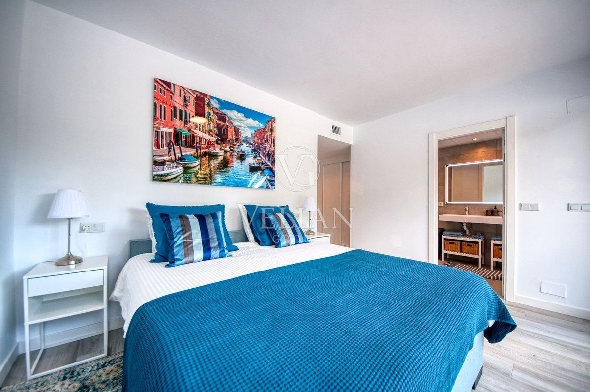 Una puerta corredera separa la sala de estar de los dormitorios, que incluyen tres habitaciones dobles con armarios empotrados y persianas eléctricas. El dormitorio principal tiene baño en suite y acceso a la terraza, mientras que los otros dos dormitorios comparten un baño.